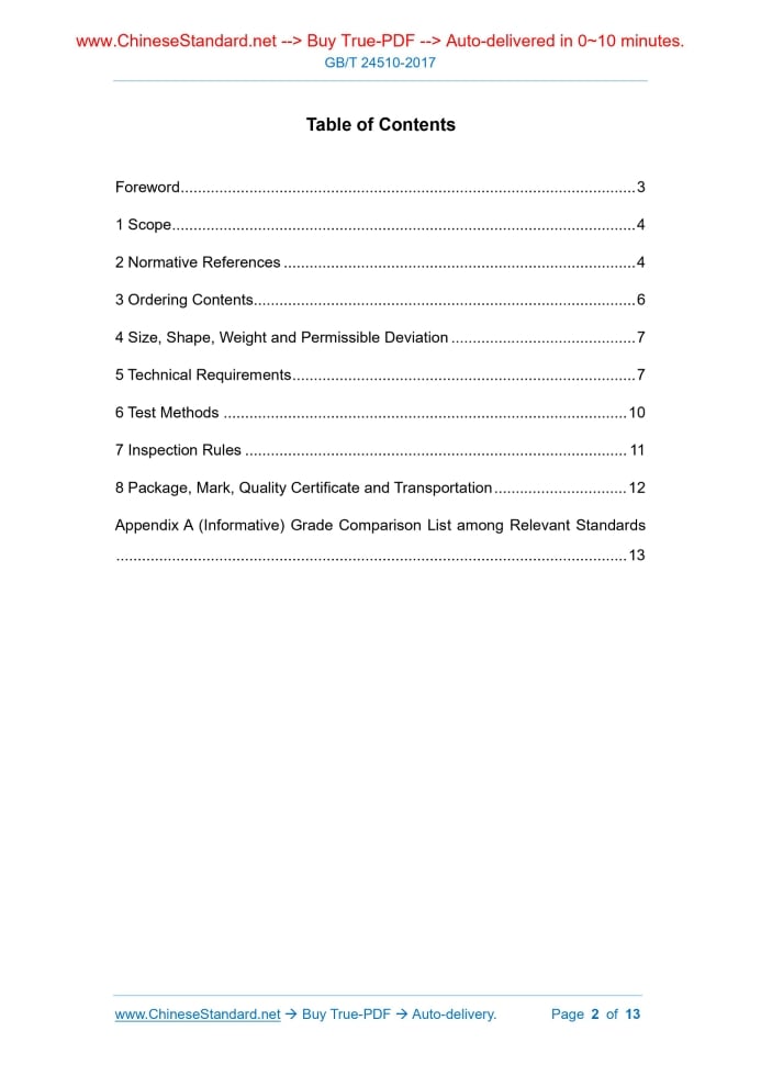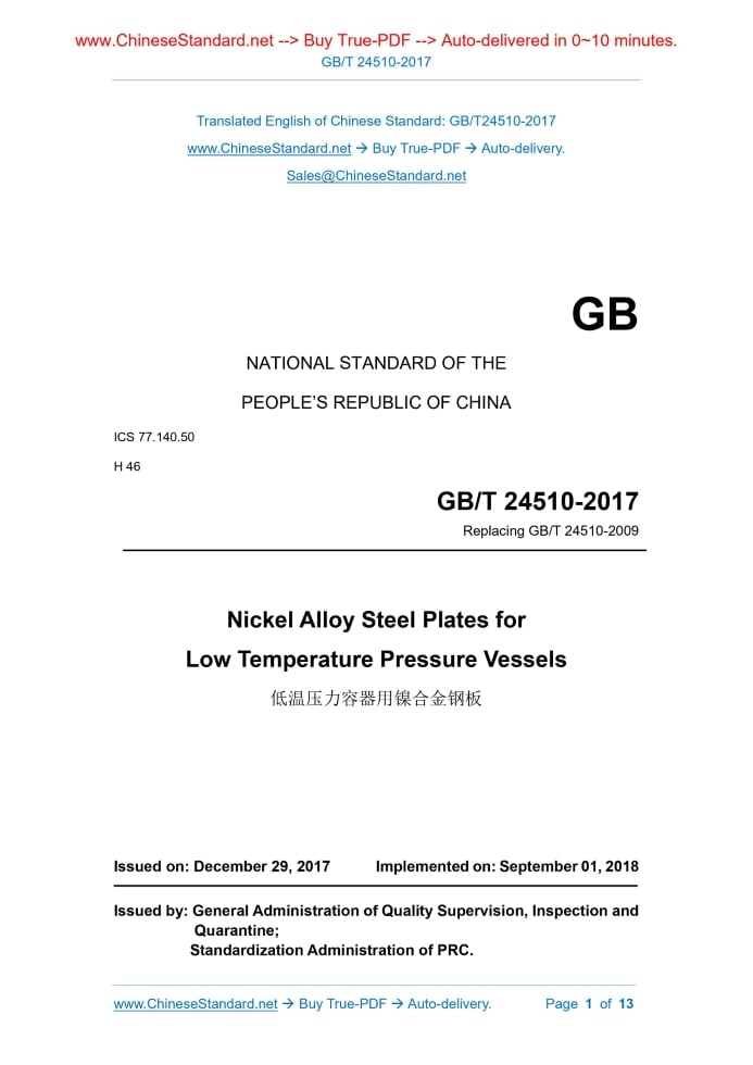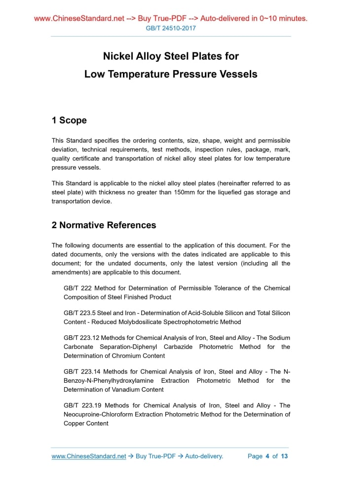 Similar standardsGB/T 24510-2017: Nickel alloy steel plates for low temperature pressure vessels---This is an excerpt. Full copy of true-PDF in English version (including equations, symbols, images, flow-chart, tables, and figures etc.), auto-downloaded/delivered in 9 seconds, can be purchased online: https://www.ChineseStandard.net/PDF.aspx/GBT24510-2017GB NATIONAL STANDARD OF THE PEOPLE’S REPUBLIC OF CHINA ICS 77.140.50 H 46 Replacing GB/T 24510-2009 Nickel Alloy Steel Plates for Low Temperature Pressure Vessels Issued on: DECEMBER 29, 2017 Implemented on: SEPTEMBER 01, 2018 Issued by. General Administration of Quality Supervision, Inspection and Quarantine; Standardization Administration of PRC. Table of ContentsForeword ... 3 1 Scope ... 4 2 Normative References ... 4 3 Ordering Contents... 6 4 Size, Shape, Weight and Permissible Deviation ... 7 5 Technical Requirements ... 7 6 Test Methods ... 10 7 Inspection Rules ... 11 8 Package, Mark, Quality Certificate and Transportation ... 12 Appendix A (Informative) Grade Comparison List among Relevant Standards ... 13 Nickel Alloy Steel Plates for Low Temperature Pressure Vessels1 ScopeThis Standard specifies the ordering contents, size, shape, weight and permissible deviation, technical requirements, test methods, inspection rules, package, mark, quality certificate and transportation of nickel alloy steel plates for low temperature pressure vessels. This Standard is applicable to the nickel alloy steel plates (hereinafter referred to as steel plate) with thickness no greater than 150mm for the liquefied gas storage and transportation device.2 Normative ReferencesThe following documents are essential to the application of this document. For the dated documents, only the versions with the dates indicated are applicable to this document; for the undated documents, only the latest version (including all the amendments) are applicable to this document. GB/T 222 Method for Determination of Permissible Tolerance of the Chemical Composition of Steel Finished Product GB/T 223.5 Steel and Iron - Determination of Acid-Soluble Silicon and Total Silicon Content - Reduced Molybdosilicate Spectrophotometric Method GB/T 223.12 Methods for Chemical Analysis of Iron, Steel and Alloy - The Sodium Carbonate Separation-Diphenyl Carbazide Photometric Method for the Determination of Chromium Content GB/T 223.14 Methods for Chemical Analysis of Iron, Steel and Alloy - The N- Benzoy-N-Phenylhydroxylamine Extraction Photometric Method for the Determination of Vanadium Content GB/T 223.19 Methods for Chemical Analysis of Iron, Steel and Alloy - The Neocuproine-Chloroform Extraction Photometric Method for the Determination of Copper Content GB/T 232 Metallic Materials - Bend Test GB/T 247 General rule of package mark and certification for steel plates (sheets) and strips GB/T 709-2006 Dimension, Shape, Weight and Tolerances for Hot Rolled Sheets and Strip GB/T 2975 Steel and Steel Products - Location and Preparation of Samples and Test Pieces for Mechanical Testing GB/T 4336 Carbon and Low-Alloy Steel - Determination of Multi-Element Contents -Spark Discharge Atomic Emission Spectrometric Method (Routine Method) GB/T 5313 Steel Plates with through-Thickness Characteristics GB/T 6803 Test Method for Drop-Weight Test to Determine Nil-Ductility Transition Temperature of Ferritic Steels GB/T 8170 Rules of Rounding off for Numerical Values & Expression and Judgement of Limiting Values GB/T 13239 Metallic Materials - Tensile Testing At Low Temperatures GB/T 17505 Steel and Steel Products General Technical Delivery Requirements GB/T 20066 Steel and Iron-Sampling and Preparation of Samples for the Determination of Chemical Composition GB/T 20123 Steel and Iron - Determination of Total Carbon and Sulfur Content Infrared Absorption Method after Combustion in an Induction Furnace (Routine Method) GB/T 20124 Steel and Iron - Determination of Nitrogen Content - Thermal Conductimetric Method after Fusion in a Current of Inert Gas GB/T 20125 Low-Alloy Steel - Determination of Multi-Element Contents - Inductively Coupled Plasma Atomic Emission Spectrometric Method NB/T 47013.3-2015 Nondestructive Testing of Pressure Equipment Part 3. Ultrasonic Testing3 Ordering ContentsThe contract or ordering list purchasing products as per this Standard include the following contents. no greater than half thickness tolerance of the steel plate; ensure the minimum thickness of the steel plate. 5.5.3 When the surface of the steel plate has defects, it is allowed to be removed by the grinding method; the grinding position shall be smooth; ensure the minimum thickness of the steel plate. 5.6 Ultrasonic test The steel plate shall be ultrasonically tested one by one; the test method and qualification level shall be determined through the negotiation between the supplier and the purchaser. If they are not clear, they shall conform to the provisions of Level-I in NB/T 47013.3-2015. 5.7 Particular requirements 5.7.1 According to the negotiation between supplier and purchaser, the steel plate can be tested for dropping hammer, low temperature drawing, residual magnetism, thickness direction performance. When taking the dropping hammer and low temperature drawing tests, take two samples per group (totally two groups) from the steel plate with the maximum thickness in each ordering batch. 5.7.2 According to the negotiation between supplier and purchaser, the steel plate can also be inspected for other items.6 Test Methods6.1 The test methods for chemical compositions of steel shall conform to the provisions of GB/T 223.5, GB/T 223.12, GB/T 223.14, GB/T 223.19, GB/T 223.23, GB/T 223.25, GB/T 223.26, GB/T 223.62, GB/T 223.63, GB/T 223.64, GB/T 223.72, GB/T 223.78, GB/T 223.79, GB/T 223.81, GB/T 223.84, GB/T 223.85, GB/T 223.86, GB/T 4336, GB/T 20123, GB/T 20124, GB/T 2015. 6.2 The inspection items, sampling quantity, sampling method and test methods for each batch of steel plates shall conform to the provi