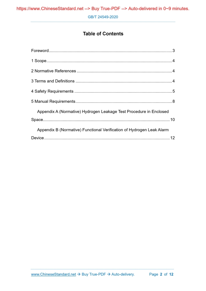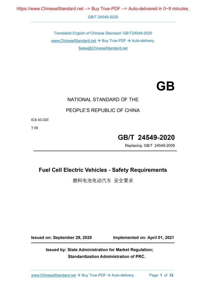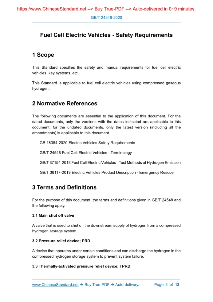 Similar standardsGB/T 24549-2020: Fuel Cell Electric Vehicles - Safety Requirements---This is an excerpt. Full copy of true-PDF in English version (including equations, symbols, images, flow-chart, tables, and figures etc.), auto-downloaded/delivered in 9 seconds, can be purchased online: https://www.ChineseStandard.net/PDF.aspx/GBT24549-2020GB NATIONAL STANDARD OF THE PEOPLE’S REPUBLIC OF CHINA ICS 43.020 T 09 Replacing GB/T 24549-2009 Fuel Cell Electric Vehicles - Safety Requirements Issued on. SEPTEMBER 29, 2020 Implemented on. APRIL 01, 2021 Issued by. State Administration for Market Regulation; Standardization Administration of PRC. Table of ContentsForeword... 3 1 Scope... 4 2 Normative References... 4 3 Terms and Definitions... 4 4 Safety Requirements... 5 5 Manual Requirements... 8 Appendix A (Normative) Hydrogen Leakage Test Procedure in Enclosed Space... 10 Appendix B (Normative) Functional Verification of Hydrogen Leak Alarm Device... 121 ScopeThis Standard specifies the safety and manual requirements for fuel cell electric vehicles, key systems, etc. This Standard is applicable to fuel cell electric vehicles using compressed gaseous hydrogen.2 Normative ReferencesThe following documents are essential to the application of this document. For the dated documents, only the versions with the dates indicated are applicable to this document; for the undated documents, only the latest version (including all the amendments) is applicable to this document. GB 18384-2020 Electric Vehicles Safety Requirements GB/T 24548 Fuel Cell Electric Vehicles - Terminology GB/T 37154-2018 Fuel Cell Electric Vehicles - Test Methods of Hydrogen Emission GB/T 38117-2019 Electric Vehicles Product Description - Emergency Rescue3 Terms and DefinitionsFor the purpose of this document, the terms and definitions given in GB/T 24548 and the following apply. 3.1 Main shut off valve A valve that is used to shut off the downstream supply of hydrogen from a compressed hydrogen storage system. 3.2 Pressure relief device; PRD A device that operates under certain conditions and can discharge the hydrogen in the compressed hydrogen storage system to prevent system failure. 3.3 Thermally-activated pressure relief device; TPRD A safety relief device that starts to act when the temperature reaches the set value and cannot be reset automatically. 3.4 Enclosed or semi-enclosed spaces The space in the vehicle that may be exposed to the compressed hydrogen storage system and the environmental space and area where hydrogen may accumulate, such as the passenger compartment, luggage compartment, cargo compartment, or space under the front hatch. 3.5 Nominal working pressure; NWP At the reference temperature (15°C), the gas pressure in the compressed hydrogen storage system reaches the limit charging pressure when it is completely stable.4 Safety Requirements4.1 Safety requirements for the whole vehicle 4.1.1 Hydrogen emission from the whole vehicle The test shall be carried out in accordance with the test method specified in the Subclause 6.1 hydrogen emission at idle thermal state specified in GB/T 37154-2018. During normal operation (including startup and shutdown), the average hydrogen volume concentration in any continuous 3s shall not exceed 4%; and the instant hydrogen volume concentration shall not exceed 8%. 4.1.2 Hydrogen leakage from the whole vehicle 4.1.2.1 Requirements in the vehicle 4.1.2.2 Requirements outside the vehicle For Type-M1 vehicles, the hydrogen leakage test shall be carried out in an enclosed space in accordance with Appendix A; and the hydrogen volume concentration measured at any time shall not exceed 1%. 4.1.3 Reminder of low hydrogen remaining amount The meter indicating the hydrogen pressure or the remaining amount of hydrogen in the hydrogen storage tank shall be installed in an area that is easy for the driver to observe. If the pressure or remaining amount of hydrogen affects the driving of the vehicle, an obvious signal (for example. sound or light signal) device shall issue the prompt to the driver. 4.1.4 Electrical safety requirements The electrical safety of fuel cell electric vehicles shall comply with the provisions of GB 18384-2020. 4.2 Requirements for system safety 4.2.1 Requirements for hydrogen storage cylinders and pipelines 4.2.1.1 Requirements for installation location Pipeline joints shall not be located in a completely enclosed space. In general, hydrogen storage cylinders and pipelines shall not be installed in the passenger compartment, luggage compartment or other poorly ventilated places; but if it is unavoidable to install them in the luggage compartment or other poorly ventilated places, corresponding measures shall be taken to discharge the hydrogen that may leak in time. 4.2.1.2 Requirements for thermal insulation The hydrogen storage cylinders and pipelines that may be affected by heat sources such as exhaust pipes and mufflers, etc. shall be protected by thermal insulation. 4.2.1.3 Anti-static requirements High-pressure pipelines and components (including hydrogenation ports) shall be grounded reliably. 4.2.2 Requirements for pressure relief system The requirements for pressure relief system are as follows. 4.2.3 Requirements for hydrogenation and hydrogenation port 4.2.4 Hydrogen leakage and detection of fuel pipeline 4.2.4.1 The method specified in 4.2.4.2 or 4.2.4.3 shall be used to conduct hydrogen leak detection on the accessible part of the fuel pipeline, and conduct key leak detection on the joints. For the pipeline between the hydrogen storage cylinder and the fuel cell stack, the leak detection pressure is the actual working pressure. Conduct the detection for the pipeline from the hydrogenation port to the hydrogen storage tank, the leak detection pressure is 1.25 times the nominal working pressure. 4.2.4.2 Use leak detection fluid for visual inspection, and no bubbles shall appear within 3min. 4.2.5 Functional requirements for hydrogen leak alarm devic