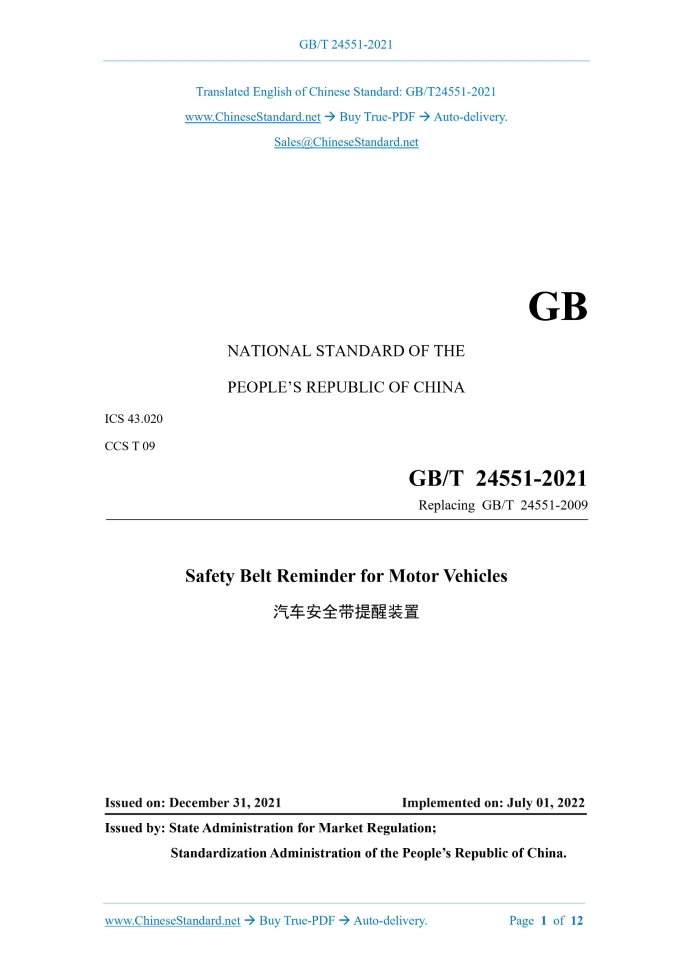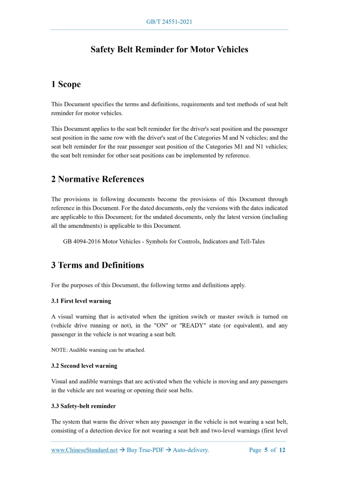 Similar standardsGB/T 24551-2021: Safety belt reminder for motor vehicles---This is an excerpt. Full copy of true-PDF in English version (including equations, symbols, images, flow-chart, tables, and figures etc.), auto-downloaded/delivered in 9 seconds, can be purchased online: https://www.ChineseStandard.net/PDF.aspx/GBT24551-2021NATIONAL STANDARD OF THE PEOPLE’S REPUBLIC OF CHINA ICS 43.020 CCS T 09 Replacing GB/T 24551-2009 Safety Belt Reminder for Motor Vehicles Issued on. DECEMBER 31, 2021 Implemented on. JULY 01, 2022 Issued by. State Administration for Market Regulation; Standardization Administration of the People’s Republic of China. Table of ContentsForeword... 3 1 Scope... 5 2 Normative References... 5 3 Terms and Definitions... 5 4 Technical Requirements... 7 5 Test Methods... 9ForewordThis Document was drafted as per the rules specified in GB/T 1.1-2020 Directives for Standardization – Part 1.Rules for the Structure and Drafting of Standardizing Documents. This Document replaced GB/T 24551-2009 Safety Belt Reminder for Motor Vehicles. Compared with GB/T 24551-2009, the major technical changes of this Document are as follows besides the structural adjustment and editorial modifications. --- Change the “Scope” (see Clause 1 of this Edition; Clause 1 of 2009 Edition); --- Add the terms and definitions of visual warning, audible warning, vehicle in normal operation, passenger detection device, interval time, and intermittent time (see 3.4, 3.5, 3.7, 3.8, 3.9, 3.10 of this Edition); --- Add the partial technical requirements for visual warning, audible warning, first level warning, and second level warning (see 4.2.1, 4.2.2, 4.2.3, 4.2.4 of this Edition); --- Change the driving conditions for the activation of the second level warning (see 4.2.4.1 of this Edition; 4.2 of 2009 Edition); --- Add the technical requirements for the seat belt reminder device for the driver and the passengers in the same row, and the rear passenger seat belt reminder device (see 4.3 and 4.4 of this Edition); --- Add the test methods such as the first level warning, the second level warning, and the test duration (see 5.1, 5.2, 5.3 of this Edition). Please note some contents of this Document may involve patents. The issuing agency of this Document shall not assume the responsibility to identify these patents. This Document was proposed by the Ministry of Industry and Information Technology of PRC. This Document shall be under the jurisdiction of National Technical Committee of Auto Standardization (SAC/TC 114). Drafting organizations of this Document. China Automotive Technology and Research Center Co., Ltd.; Anhui Jianghuai Automobile Group Corp., Ltd.; China FAW Group Co., Ltd.; Shanghai AnWen Automotive Electronics Co., Ltd.; CATARC Automotive Test Center (Ningbo) Co., Ltd.; Chongqing Changan Automobile Company Limited; Pan Asia Technical Automotive Center Co., Ltd.; FAW-Volkswagen Automotive Co. Ltd.; Xiangyang Daan Automobile Testing Center Co., Ltd.; Shanghai Motor Vehicle Inspection Certification Tech Innovation Center Co., Ltd.; Geely Automobile Research Institute (Ningbo) Co., Ltd.; SAIC Volkswagen Automotive Co., Ltd.; SAIC Motor Corporation Limited; Beiqi Foton Motor Co., Ltd.; SAIC-GM-Wuling Automobile Co., Ltd.; Dongfeng Nissan Passenger Vehicle Company; Suzhou Qiwei Electronic Co., Ltd.; Dayun Automobile Co., Ltd.; BAIC Motor Corporation., Ltd.; Dongfeng Motor Group Co., Ltd.; Toyota Motor (China) Investment Co., Ltd.; Daimler Greater China Limited; Volkswagen (China) Investment Co., Ltd.; Nissan (China) Investment Co., Ltd.; Ford China Co., Ltd.; BMW China Services Ltd.; Jaguar Land Rover (China) Investment Co., Ltd.; Volvo Car (Asia Pacific) Investment Holding Co., Ltd.; Peugeot Citroen (China) Automotive Trade Co., Ltd.; and Hyundai Motor Technology & Engineering Center (China) Ltd. Chief drafting staffs of this Document. Sun Zhendong, Lou Lei, Peng Weiqiang, Cui Dong, Chen Liangxiao, Tang Hongbin, Zhang Haitao, Yu Chengxiang, Mao Rongjie, Ba Shuai, Zhang Xiaoqian, Zhang Huiyun, Jiang Zeqi, Liu Yanfei, Gu Hanyi, Jing Shaonan, Wang Junlin, Guo Jianxue, Chen Changqin, Dai Guangwei, Wang Nian, Hao Weiquan, Fan Chao, Guo Luxi, Zheng Wenjie, Yang Fan, Xu Shimeng, Liu Lin, Jiang Weifang, Wang Yazhen, You Lizhong, Dong Qianqian, Huang Fang, Zhang Zhanzhan, and Yin Weiyang. The historical editions replaced by this Document are as follows. --- GB/T 24551-2009 was first-time published in 2009; --- It is first-time revised hereby. Safety Belt Reminder for Motor Vehicles1 ScopeThis Document specifies the terms and definitions, requirements and test methods of seat belt reminder for motor vehicles. This Document applies to the seat belt reminder for the driver's seat position and the passenger seat position in the same row with the driver's seat of the Categories M and N vehicles; and the seat belt reminder for the rear passenger seat position of the Categories M1 and N1 vehicles; the seat belt reminder for other seat positions can be implemented by reference.2 Normative ReferencesThe provisions in following documents become the provisions of this Document through reference in this Document. For the dated documents, only the versions with the dates indicated are applicable to this Document; for the undated documents, only the latest version (including all the amendments) is applicable to this Document. GB 4094-2016 Motor Vehicles - Symbols for Controls, Indicators and Tell-Tales3 Terms and DefinitionsFor the purposes of this Document, the following terms and definitions apply. 3.1 First level warning A visual warning that is activated when the ignition switch or master switch is turned on (vehicle drive running or not), in the "ON" or "READY" state (or equivalent), and any passenger in the vehicle is not wearing a seat belt. 3.2 Second level warning Visual and audible warnings that are activated when the vehicle is moving and any passengers in the vehicle are not wearing or opening their 