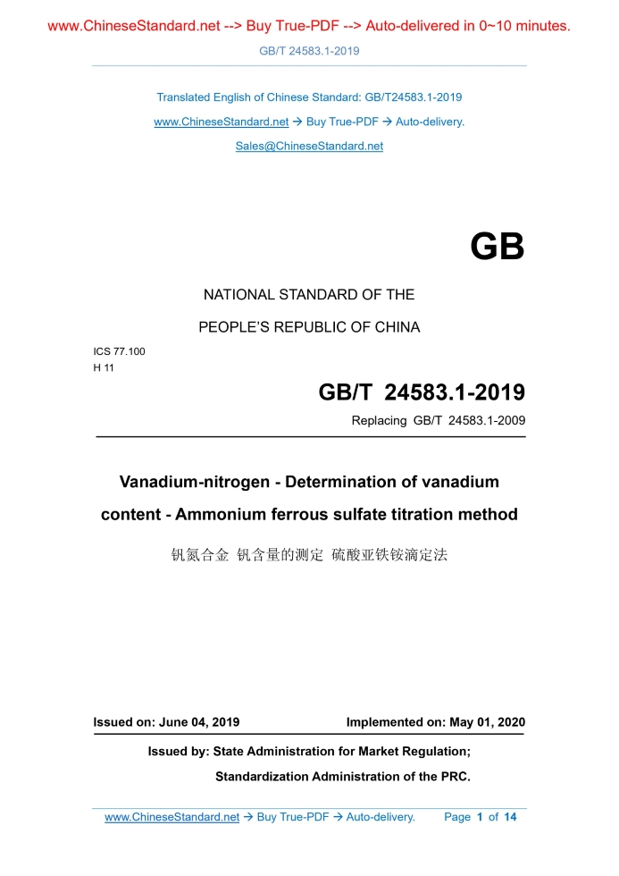 GB/T 24583.1-2019: Vanadium-nitrogen - Determination of vanadium content - Ammonium ferrous sulfate titration method Delivery: 9 seconds. True-PDF full-copy in English & invoice will be downloaded + auto-delivered via email. See step-by-step procedure Status: Valid GB/T 24583.1: Historical versions