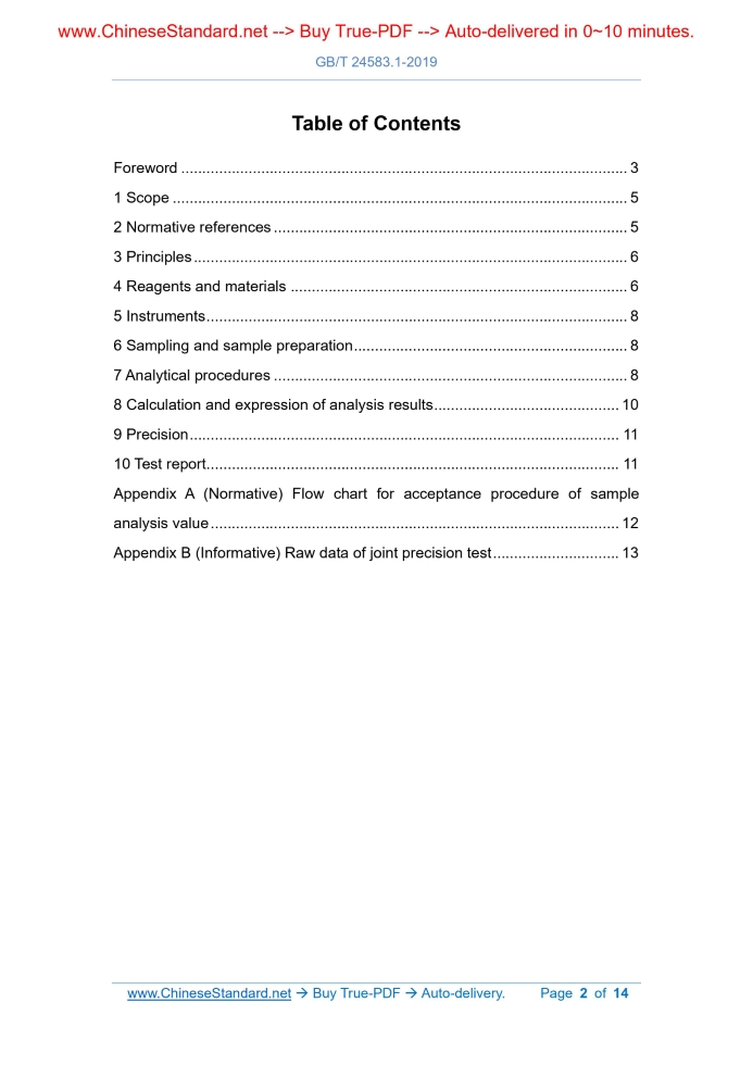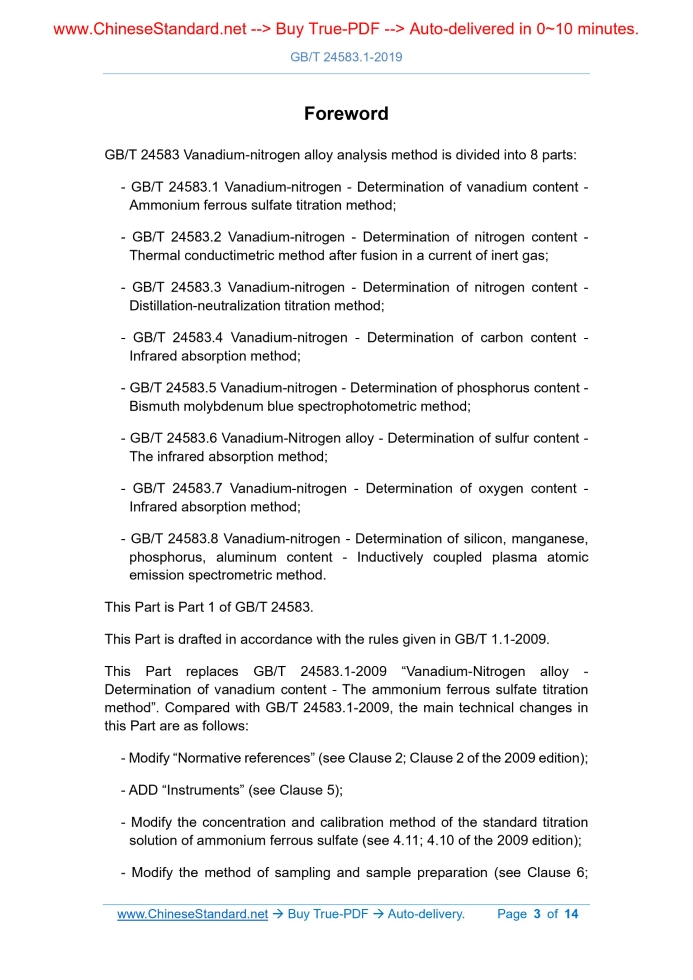 Similar standardsGB/T 24583.1-2019: Vanadium-nitrogen - Determination of vanadium content - Ammonium ferrous sulfate titration method---This is an excerpt. Full copy of true-PDF in English version (including equations, symbols, images, flow-chart, tables, and figures etc.), auto-downloaded/delivered in 9 seconds, can be purchased online: https://www.ChineseStandard.net/PDF.aspx/GBT24583.1-2019 NATIONAL STANDARD OF THE PEOPLE’S REPUBLIC OF CHINA ICS 77.100 H 11 Replacing GB/T 24583.1-2009 Vanadium-nitrogen - Determination of vanadium content - Ammonium ferrous sulfate titration method ISSUED ON: JUNE 04, 2019 IMPLEMENTED ON: MAY 01, 2020 Issued by: State Administration for Market Regulation; Standardization Administration of the PRC. Table of ContentsForeword ... 3 1 Scope ... 5 2 Normative references ... 5 3 Principles ... 6 4 Reagents and materials ... 6 5 Instruments ... 8 6 Sampling and sample preparation ... 8 7 Analytical procedures ... 8 8 Calculation and expression of analysis results ... 10 9 Precision ... 11 10 Test report ... 11 Appendix A (Normative) Flow chart for acceptance procedure of sample analysis value ... 12 Appendix B (Informative) Raw data of joint precision test ... 13ForewordGB/T 24583 Vanadium-nitrogen alloy analysis method is divided into 8 parts: - GB/T 24583.1 Vanadium-nitrogen - Determination of vanadium content - Ammonium ferrous sulfate titration method; - GB/T 24583.2 Vanadium-nitrogen - Determination of nitrogen content - Thermal conductimetric method after fusion in a current of inert gas; - GB/T 24583.3 Vanadium-nitrogen - Determination of nitrogen content - Distillation-neutralization titration method; - GB/T 24583.4 Vanadium-nitrogen - Determination of carbon content - Infrared absorption method; - GB/T 24583.5 Vanadium-nitrogen - Determination of phosphorus content - Bismuth molybdenum blue spectrophotometric method; - GB/T 24583.6 Vanadium-Nitrogen alloy - Determination of sulfur content - The infrared absorption method; - GB/T 24583.7 Vanadium-nitrogen - Determination of oxygen content - Infrared absorption method; - GB/T 24583.8 Vanadium-nitrogen - Determination of silicon, manganese, phosphorus, aluminum content - Inductively coupled plasma atomic emission spectrometric method. This Part is Part 1 of GB/T 24583. This Part is drafted in accordance with the rules given in GB/T 1.1-2009. This Part replaces GB/T 24583.1-2009 “Vanadium-Nitrogen alloy - Determination of vanadium content - The ammonium ferrous sulfate titration method”. Compared with GB/T 24583.1-2009, the main technical changes in this Part are as follows: - Modify “Normative references” (see Clause 2; Clause 2 of the 2009 edition); - ADD “Instruments” (see Clause 5); - Modify the concentration and calibration method of the standard titration solution of ammonium ferrous sulfate (see 4.11; 4.10 of the 2009 edition); - Modify the method of sampling and sample preparation (see Clause 6; Vanadium-nitrogen - Determination of vanadium content - Ammonium ferrous sulfate titration method Caution - The personnel using this Part shall have hands-on experience in formal laboratory work. This Part does not address all possible safety problems. It is the responsibility of the user to take appropriate safety and health measures and to ensure compliance with the conditions set by the relevant national regulations.1 ScopeThis Part of GB/T 24583 specifies the determination of vanadium content in vanadium-nitrogen alloy by ammonium ferrous sulfate titration method. This Part applies to the determination of vanadium content in vanadium- nitrogen alloy. Measuring range (mass fraction): ≥60.00%.2 Normative referencesThe following documents are indispensable for the application of this document. For the dated references, only the editions with the dates indicated are applicable to this document. For the undated references, the latest edition (including all the amendments) are applicable to this document. GB/T 6379.1 Accuracy (trueness and precision) of measurement methods and results - Part 1: General principles and definitions GB/T 6379.2 Accuracy (trueness and precision) of measurement methods and results - Part 2: Basic method for the determination of repeatability and reproducibility of a standard measurement method GB/T 6682 Water for analytical laboratory use - Specification and test methods GB/T 8170 Rules of rounding off for numerical values & expression and judgement of limiting values GB/T 12805 Laboratory glassware - Burettes GB/T 12806 Laboratory glassware - One-mark volumetric flasks DILUTE to the mark and mix well. 4.11 Standard titration solution of ammonium ferrous sulfate, about 0.07 mol/L. 4.11.1 Preparation WEIGH 27.45 g of ammonium ferrous sulfate [(NH4)2Fe(SO4)2 • 6H2O] in a beaker; DISSOLVE it in an appropriate amount of sulfuric acid (5+95); USE sulfuric acid (5+95) to dilute to 1000 mL; MIX well. 4.11.2 Calibration and indicator correction TAKE 3 parts of 5.00 mL of potassium dichromate standard solution (see 4.10); PLACE them into 500 mL conical flasks respectively. ADD 20 mL of sulfuric acid (see 4.4), 5 mL of phosphoric acid (see 4.2), 70 mL of water, 3 drops of N- benzo-o-aminobenzoic acid indicator solution (see 4.13) in sequence. USE the standard titration solution of ammonium ferrous sulfate (see 4.11) to titrate until the solution is changed from fuchsia to bright yellow-green as end point, regardless of the volume of the standard titration solution of ammonium ferrous sulfate consumed. After adding 20.00 mL (V) of potassium dichromate standard solution (see 4.10), USE the standard titration solution of ammonium ferrous sulfate (see 4.11.1) to titrate until the solution is changed from fuchsia to bright yellow-green as end point; RECORD the volume V1 of the standard titration solution of ammonium ferrous sulfate consumed. According to formula (1), calculate the concentration of the standard titration solution of ammonium ferrous sulfate. Where: c1 - The con