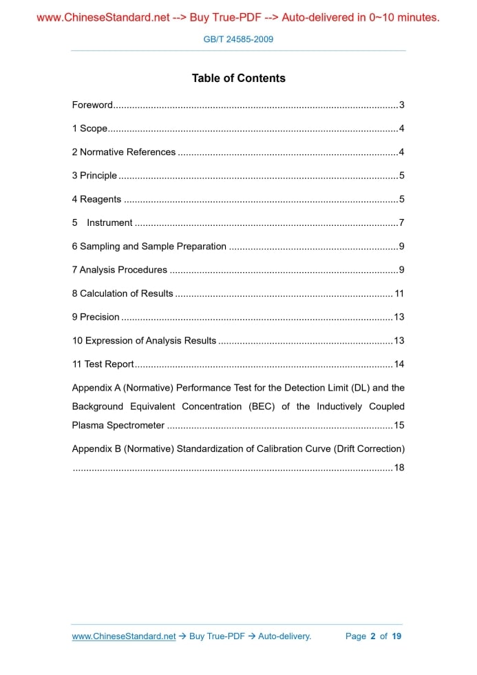 Similar standardsGB/T 24585-2009: Ferronickel - Determination of Phosphorus, Manganese, Chromium, Copper, Cobalt and Silicon Contents - Inductively Coupled Plasma Atomic Emission Spectrometric Method---This is an excerpt. Full copy of true-PDF in English version (including equations, symbols, images, flow-chart, tables, and figures etc.), auto-downloaded/delivered in 9 seconds, can be purchased online: https://www.ChineseStandard.net/PDF.aspx/GBT24585-2009 GB NATIONAL STANDARD OF THE PEOPLE’S REPUBLIC OF CHINA ICS 77.100 H 11 Ferronickel – Determination of Phosphorus, Manganese, Chromium, Copper, Cobalt and Silicon Contents – Inductively Coupled Plasma Atomic Emission Spectrometric Method Issued on. OCTOBER 30, 2009 Implemented on. MAY 01, 2010 Issued by. General Administration of Quality Supervision, Inspection and Quarantine; Standardization Administration of PRC. Table of ContentsForeword... 3 1 Scope... 4 2 Normative References... 4 3 Principle... 5 4 Reagents... 5 5 Instrument... 7 6 Sampling and Sample Preparation... 9 7 Analysis Procedures... 9 8 Calculation of Results... 11 9 Precision... 13 10 Expression of Analysis Results... 13 11 Test Report... 14 Appendix A (Normative) Performance Test for the Detection Limit (DL) and the Background Equivalent Concentration (BEC) of the Inductively Coupled Plasma Spectrometer... 15 Appendix B (Normative) Standardization of Calibration Curve (Drift Correction) ... 18ForewordThe Appendixes A and B in this Standard are normative. This Standard was proposed by China Iron and Steel Industry Association. This Standard shall be under the jurisdiction of National Technical Committee for Standardization of Pig Iron and Iron Alloy. Organizations responsible for drafting this Standard. Jiuquan Iron & Steel (Group) Co., Ltd.; and Shanxi Taigang Stainless Steel Co., Ltd. Drafting staffs of this Standard. Sun Yuguang, Zhu Weihua, Dai Xuanqian, and Zhang Ruilin. Ferronickel – Determination of Phosphorus, Manganese, Chromium, Copper, Cobalt and Silicon Contents – Inductively Coupled Plasma Atomic Emission Spectrometric Method Warning. The personnel using this Standard shall have practical experience working in the formal laboratory. This Standard does not point out all possible safety issues. The user is responsible for taking appropriate safety and health measures and ensuring compliance with the conditions stipulated by relevant national laws and regulations.1 ScopeThis Standard specifies the use of inductively coupled plasma atomic emission spectrometric method (ICP-AES) to determine the contents of phosphorus, manganese, chromium, cobalt, copper and silicon. This Standard is applicable to the determination of phosphorus, manganese, chromium, cobalt, copper and silicon contents in ferronickel. The content ranges of the determined elements are shown in Table 1. The silicon measured by this method is acid-soluble silicon. Table 1 – Content Ranges of the Determined Elements2 Normative ReferencesThe provisions in following documents become the provisions of this Standard through reference in this Standard. For dated references, the subsequent amendments (excluding corrigendum) or revisions do not apply to this Standard, GB/T 4010 Ferroalloys Sampling and Preparation of Samples for Chemical Analysis GB/T 6379.1 Accuracy (Trueness and Precision) of Measurement Methods and Results - Part 1.General Principles and Definitions (GB/T 6379.1-2004, ISO 5725- 1.1994, IDT) GB/T 6379.2 Accuracy (Trueness and Precision) of Measurement Methods and Results - Part 2.Basic Method for the Determination of Repeatability and Reproducibility of a Standard Measurement Method GB/T 6682 Water for Analytical Laboratory Use - Specification and Test Methods GB/T 20066 Steel and Iron - Sampling and Preparation of Samples for the Determination of Chemical Composition3 PrincipleThe testing material is decomposed by nitric acid and hydrochloric acid. The testing material with high carbon or high silicon content is added with hydrofluoric acid to help dissolving. When perchloric acid emits smoke, it shall expel silicon and fluorine completely.4 ReagentsUnless otherwise specified, only guaranteed reagents and laboratory water complying with the provisions of GB/T 6682 are used in the analysis process. 4.1 High purity nickel, the content of the element to be tested is less than 0.001% (mass fraction). 4.2 High purity iron, the content of the element to be tested is less than 0.001% (mass fraction). 4.3 Hydrochloric acid, ρ is about 1.19g/mL. 4.8 Standard stock solution 4.8.1 Phosphorus standard solution, 1000μg/mL Take 4.3936g of reference dipotassium hydrogen phosphate dried at 105°C ~ 110°C; dissolve it in an appropriate amount of water; transfer it into a 1000 mL volumetric flask; dilute to the mark with water; and mix evenly. 1mL of this solution contains 1000μg of phosphorus. 4.8.4 Cobalt standard solution, 1000μg/mL Take 1.0000g of high-purity cobalt powder (content is greater than 99.9%) in a 600mL beaker; then add 40mL of nitric acid (4.5); cover with a watch glass; heat it to completely dissolve it; slightly boil to discharge nitrogen oxides; cool to room temperature; transfer to a 1000 mL volumetric flask containing 160 mL of nitric acid (4.5); dilute to the mark with water; and mix evenly. 1mL of this solution contains 1000μg of cobalt. 4.8.6 Silicon standard solution, 1000μg/mL After the high-purity silica (content is greater than 99.9%) is sintered to its constant weight at a temperature of 1100°C, it is cooled to room temperature in a desiccator; and take 2.1393g of it into a platinum crucible; and add about 10g of anhydrous sodium carbonate; heated to melting for 15min. 4.8.7 Phosphorus standard solution, 250μg/mL Pipette 25.00mL of phosphorus standard solution (4.8.1) in a 100mL volumetric flask; dilute to the mark with water; and mix evenly. 1mL of this solution contains 250μg of phosphorus. 4.8.8 Copper, silicon and phosphorus mixed standard solution 