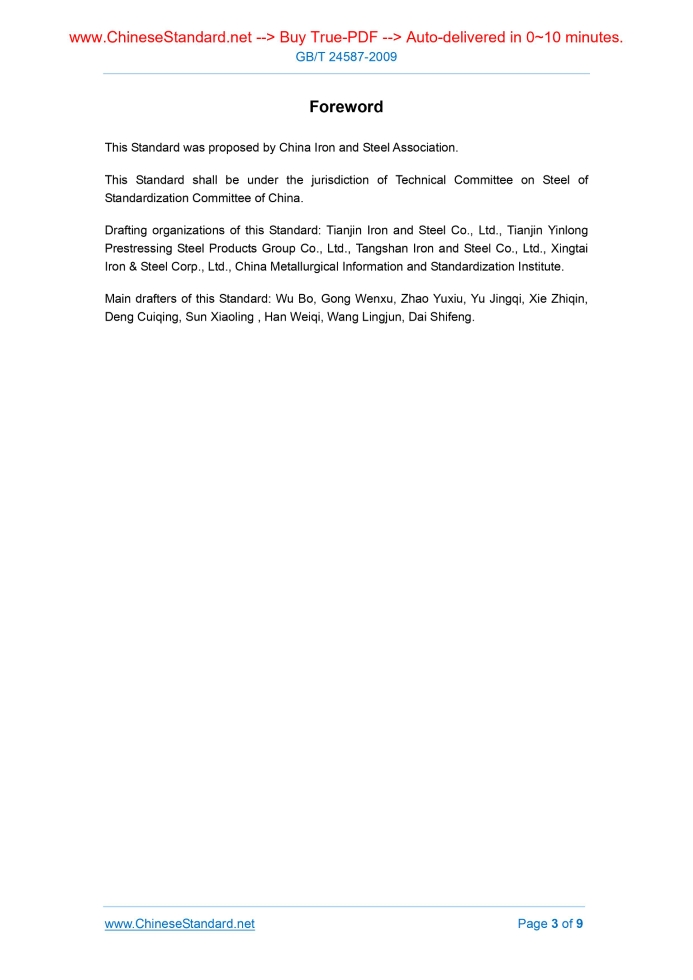 Similar standardsGB/T 24587-2009: Hot-rolled wire rods for prestressing steel bars of concrete---This is an excerpt. Full copy of true-PDF in English version (including equations, symbols, images, flow-chart, tables, and figures etc.), auto-downloaded/delivered in 9 seconds, can be purchased online: https://www.ChineseStandard.net/PDF.aspx/GBT24587-2009GB NATIONAL STANDARD OF THE PEOPLE’S REPUBLIC OF CHINA ICS 77.140.60 H 44 Hot-rolled wire rods for prestressing steel bars of concrete Issued on. OCTOBER 30, 2009 Implemented on. MAY 01, 2010 Issued by. General Administration of Quality Supervision, Inspection and Quarantine of the People’s Republic of China; Standardization Administration of the People’s Republic of China. Table of ContentsForeword... 3 1 Scope... 4 2 Normative references... 4 3 Content of Order... 6 4 Dimension, Form, Weight and Permissible Deviations... 6 5 Technical Requirements... 7 6 Test Methods... 8 7 Inspection Rules... 8 8 Package, Marking and Quality Certificate... 9ForewordThis Standard was proposed by China Iron and Steel Association. This Standard shall be under the jurisdiction of Technical Committee on Steel of Standardization Committee of China. Drafting organizations of this Standard. Tianjin Iron and Steel Co., Ltd., Tianjin Yinlong Prestressing Steel Products Group Co., Ltd., Tangshan Iron and Steel Co., Ltd., Xingtai Iron & Steel Corp., Ltd., China Metallurgical Information and Standardization Institute. Main drafters of this Standard. Wu Bo, Gong Wenxu, Zhao Yuxiu, Yu Jingqi, Xie Zhiqin, Deng Cuiqing, Sun Xiaoling, Han Weiqi, Wang Lingjun, Dai Shifeng. Hot-rolled wire rods for prestressing steel bars of concrete1 ScopeThis Standard specifies the content of order, dimension, form, weight and permissible deviations, technical requirements, test methods, inspection rules, package, marking and quality certificates etc. for hot-rolled wire rods for prestressing steel bars of concrete. This Standard applies to hot-rolled wire rods for prestressing steel bars of concrete.2 Normative referencesThe articles contained in the following documents have become part of this Standard when they are quoted herein. For the dated documents so quoted, all the modifications (excluding corrections) or revisions made thereafter shall not be applicable to this Standard. For the undated documents so quoted, the latest editions shall be applicable to this Standard. GB/T 222 Permissible tolerances for chemical composition of steel products GB/T 223.3 Methods for chemical analysis of iron, steel and alloy - The diantipyrylmethane phosphomolybdate gravimetric method for the determination of phosphorus content GB/T 223.11 Iron steel and alloy - Determination of chromium content - Visual titration or potentiometric titration method (GB/T 223.11-2008, ISO 4937.1986, MOD) GB/T 223.12 Methods for chemical analysis of iron, steel and alloy - The sodium carbonate separation-diphenyl carbazide photometric method for the determination of chromium content3 Content of OrderContracts or orders signed in accordance with this Standard shall include.4 Dimension, Form, Weight and Permissible Deviations4.1 The dimension, form, weight and permissible deviations of wire rods shall comply with GB/T 14981. 4.2 Any special requirements for the dimension, form and weight of wire rods shall be mutually agreed upon between the seller and the buyer, and indicated in the contract.5 Technical Requirements5.1 Designation and Chemical Composition 5.2 Smelting Process Steel for wire rod shall be smelted in oxygen converters or electric furnaces. 5.3 Condition of Delivery Wire rods shall be delivered as hot rolled. 5.4 Mechanical Properties According to the requirements of the buyer, wire rods can be subject to mechanical performance tests; the test items and performance index shall be agreed upon between the seller and the buyer. 5.5 Decarburized Layer If required by the buyer and indicated in the contract, wire rods can take a decarburized depth test. The total decarburized layer at one side of the wire rod (ferrite + transition layer) is divided into two groups as shown in Table 2.D in the table is the nominal diameter of wire rods. The group shall be indicated in the contract. If not, it will be regarded as group II. 5.6 Surface Quality 5.7 Special Requirements Based on the buyer’s needs and agreed on between the seller and the buyer, tests of microstructures, non-metallic inclusions, etc. can be carried out, with the test indexes determined through consultation between both parties, and indicated in the contract.6 Test Methods6.1 The chemical composition of steel can be tested through common methods; when arbitration, it shall be conducted according to GB/T 223.7 Inspection Rules7.1 Inspection and Acceptance The quality inspection and acceptance of wire rods shall be carried out by the seller’s technical supervision department. The buyer is entitled to carry out inspection and acceptance according to this Standard. 7.3 Re-inspection and Decision Rules The re-inspection and decision rules of wire rods shall be in accordance with GB/T 2101.8 Package, Marking and Quality CertificateThe package, marking and quality certificate of wire rods shall comply with GB/T 2101. ......Source: Above contents are excerpted from the full-copy PDF -- translated/reviewed by: www.ChineseStandard.net / Wayne Zheng et al. |