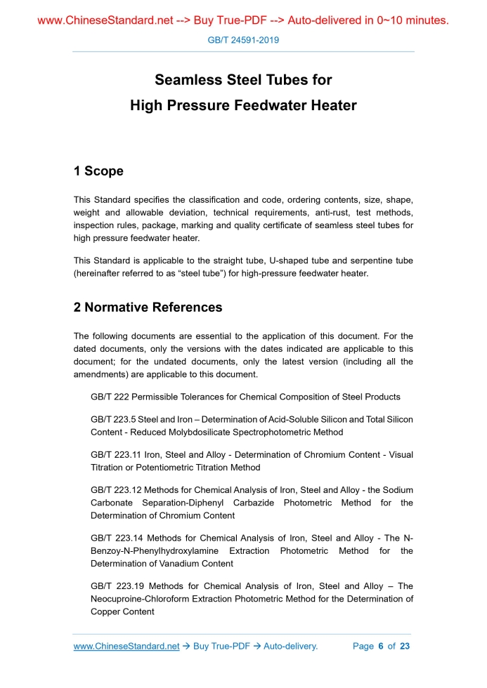 Similar standardsGB/T 24591-2019: Seamless Steel Tubes for High Pressure Feedwater Heater---This is an excerpt. Full copy of true-PDF in English version (including equations, symbols, images, flow-chart, tables, and figures etc.), auto-downloaded/delivered in 9 seconds, can be purchased online: https://www.ChineseStandard.net/PDF.aspx/GBT24591-2019NATIONAL STANDARD OF THE PEOPLE’S REPUBLIC OF CHINA ICS 77.140.75 H 48 Replacing GB/T 24591-2009 Seamless Steel Tubes for High Pressure Feedwater Heater ISSUED ON: OCTOBER 17, 2019 IMPLEMENTED ON: SEPTEMBER 01, 2020 Issued by: State Administration for Market Regulation; Standardization Administration of PRC. Table of ContentsForeword ... 3 1 Scope ... 6 2 Normative References ... 6 3 Classification and Code ... 8 4 Ordering Contents ... 10 5 Size, Shape, Weight and Allowable Deviation ... 10 6 Technical Requirements ... 13 7 Anti-Rust ... 19 8 Test Methods ... 20 9 Inspection Rules ... 21 10 Package, Marking and Quality Certificate ... 21 Appendix A (Normative) High-Temperature Specified Plastic Elongation Strength ... 23 Seamless Steel Tubes for High Pressure Feedwater Heater1 ScopeThis Standard specifies the classification and code, ordering contents, size, shape, weight and allowable deviation, technical requirements, anti-rust, test methods, inspection rules, package, marking and quality certificate of seamless steel tubes for high pressure feedwater heater. This Standard is applicable to the straight tube, U-shaped tube and serpentine tube (hereinafter referred to as “steel tube”) for high-pressure feedwater heater.2 Normative ReferencesThe following documents are essential to the application of this document. For the dated documents, only the versions with the dates indicated are applicable to this document; for the undated documents, only the latest version (including all the amendments) are applicable to this document. GB/T 222 Permissible Tolerances for Chemical Composition of Steel Products GB/T 223.5 Steel and Iron – Determination of Acid-Soluble Silicon and Total Silicon Content - Reduced Molybdosilicate Spectrophotometric Method GB/T 223.11 Iron, Steel and Alloy - Determination of Chromium Content - Visual Titration or Potentiometric Titration Method GB/T 223.12 Methods for Chemical Analysis of Iron, Steel and Alloy - the Sodium Carbonate Separation-Diphenyl Carbazide Photometric Method for the Determination of Chromium Content GB/T 223.14 Methods for Chemical Analysis of Iron, Steel and Alloy - The N- Benzoy-N-Phenylhydroxylamine Extraction Photometric Method for the Determination of Vanadium Content GB/T 223.19 Methods for Chemical Analysis of Iron, Steel and Alloy – The Neocuproine-Chloroform Extraction Photometric Method for the Determination of Copper Content GB/T 4336 Standard Test Method for Spark Discharge Atomic Emission Spectrometric Analysis of Carbon and Low-Alloy Steel (Routine Method) GB/T 4340.1 Metallic Materials - Vickers Hardness Test - Part 1: Test Method GB/T 5777-2019 Automated Full Peripheral Ultrasonic Testing of Seamless and Welded (except Submerged Arc-Welded) Steel Tubes for the Detection of Longitudinal and/or Transverse Imperfections GB/T 7735-2016 Automated Eddy Current Testing of Seamless and Welded (except Submerged Arc-Welded) Steel Tubes for Detection of Imperfections GB/T 11170 Stainless Steel - Determination of Multi-Element Contents - Spark Discharge Atomic Emission Spectrometric Method (Routine Method) GB/T 20066 Steel and Iron - Sampling and Preparation of Samples for the Determination of Chemical Composition GB/T 20123 Steel and Iron - Determination of Total Carbon and Sulfur Content Infrared Absorption Method after Combustion in an Induction Furnace (Routine Method) GB/T 20124 Steel and Iron - Determination of Nitrogen Content - Thermal Conductimetric Method after Fusion in a Current of Inert Gas YB/T 5137 Round Blank of Hot-rolled and Forged Seamless Steel Tube for High Pressure3 Classification and CodeThe steel tube can be divided into three types, such as straight tube, U-shaped tube and serpentine tube according to the product shape. The outline diagram and size code of U-shaped tube can refer to Figure 1; while the schematic diagram of serpentine tube can refer to Figure 2. Key: 1 – header; 2 – serpentine tube; r – bending radius, in mm; β – flatness, in mm. NOTE: The header is the equipment component that connects with the serpentine tube, it does not belong to the specified scope of this Standard. Figure 2 – Serpentine Tube Schematic Diagram4 Ordering ContentsThe contract or ordering form ordering the steel tubes according to this Standard shall include but not limited to the following contents: a) This Standard number; b) Product name; c) Steel designation; d) Product shape (straight tube, U-shaped tube or serpentine tube); e) Drawing or size specification (nominal outer diameter × wall thickness × length of straight tube section, bending radius, in mm); f) Ordering quantity (total weight or total length); g) Package requirements; h) Special requirements.5 Size, Shape, Weight and Allowable Deviation5.1 Outer diameter 5.1.1 The nominal diameter of the steel tube is generally 12mm~32mm. 5.1.2 The allowable deviation for the outer diameter of the straight section of steel tube shall conform to the provisions of Table 1. ring gauge shall be the maximum allowable outer diameter of the steel tube; its allowable deviation is +0.05 0 mm; its length shall be no less than 50mm. The degree of bending for the straight section of other shape of steel tube shall be no more than 1.5mm/m. Through the negotiation between the supplier and the purchaser, indicated in the contract, take other methods to check the degree of bending of the steel tube. 5.4.6 For U-shaped tube, the flatness β of the elbow measured at the two tangent points shall not exceed 1.5mm (see Figure 1). For serpentine tube, unless otherwise is specified, the flatness β of the elbow shall not exceed 4.0mm. 5.4