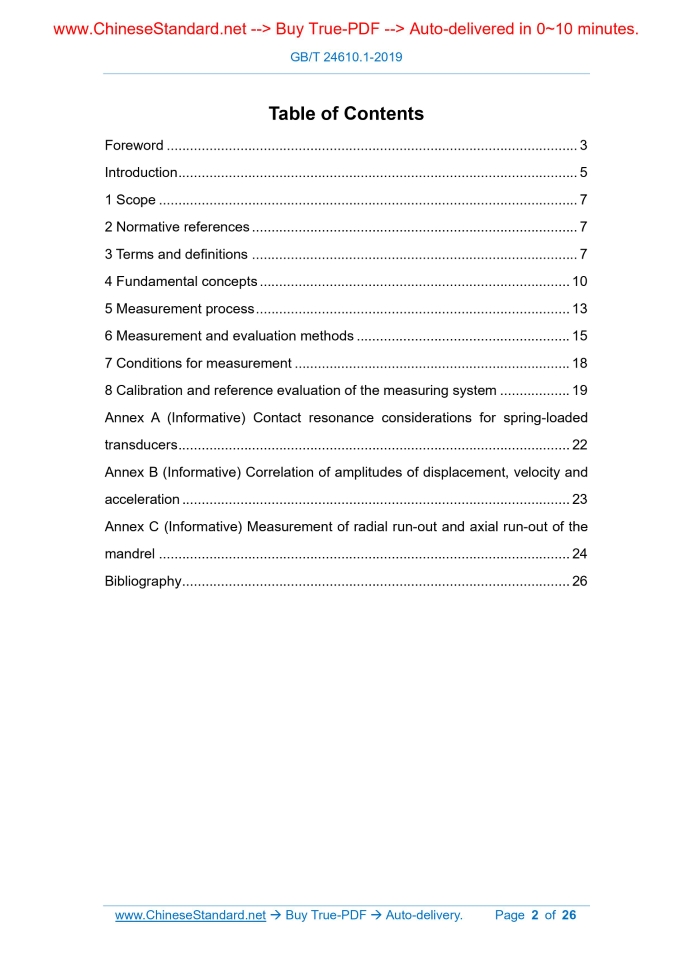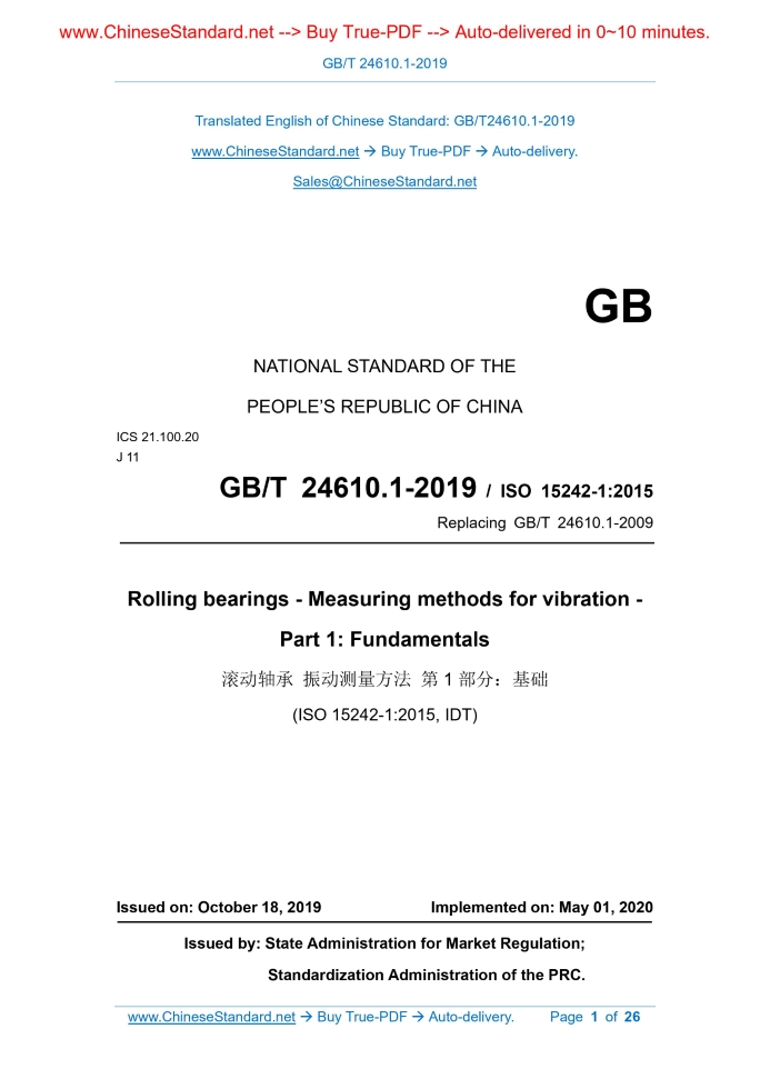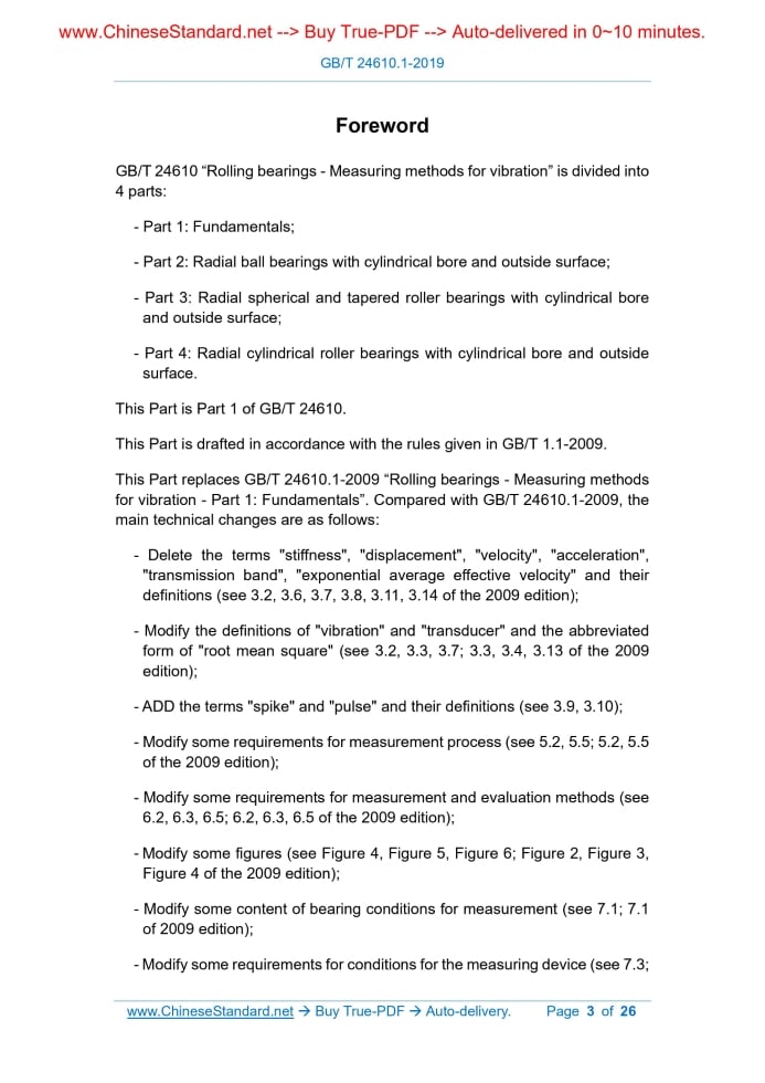 Similar standardsGB/T 24610.1-2019: Rolling bearings -- Measuring methods for vibration -- Part 1: Fundamentals---This is an excerpt. Full copy of true-PDF in English version (including equations, symbols, images, flow-chart, tables, and figures etc.), auto-downloaded/delivered in 9 seconds, can be purchased online: https://www.ChineseStandard.net/PDF.aspx/GBT24610.1-2019Rolling bearings--Measuring methods for vibration--Part 1.Fundamentals ICS 21.100.20 J11 National Standards of People's Republic of China Replaces GB/T 24610.1-2009 Method for measuring vibration of rolling bearings Part 1.Basics Part 1.Fundamentals (ISO 15242-1..2015, IDT) Published on October 18,.2019 2020-05-01 implementation State Administration of Market Supervision Published by China National Standardization Administration Table of ContentsForeword I Introduction Ⅱ 1 Scope 1 2 Normative references 1 3 Terms and definitions 1 4 Basic Concepts 3 5 Measurement procedure 6 6 Measurement and evaluation methods 7 7 Measurement conditions 9 8 Calibration and evaluation of measurement systems 10 Appendix A (informative) Need to consider the contact resonance of spring-loaded sensors 11 Appendix B (informative) Correlation between displacement, velocity and acceleration amplitude 12 Appendix C (informative) Measurement of radial runout and axial runout of the mandrel 13 References 14ForewordGB/T 24610 "Measurement method for rolling bearing vibration" is divided into 4 parts. --- Part 1.Basics; --- Part 2.Radial ball bearings with cylindrical holes and cylindrical outer surfaces; --- Part 3.Spherical roller bearings and tapered roller bearings with cylindrical bore and cylindrical outer surface; --- Part 4.Cylindrical roller bearings with cylindrical bore and cylindrical outer surface. This part is the first part of GB/T 24610. This section is drafted in accordance with the rules given in GB/T 1.1-2009. This section replaces GB/T 24610.1-2009 "Measurement methods for rolling bearing vibration-Part 1.Basics", and GB/T 24610.1- Compared with.2009, the main technical changes are as follows. --- Deleted the terms "stiffness", "displacement", "speed", "acceleration", "passband", "exponential average effective speed" and their definitions (see.2009 edition) 3.2, 3.6, 3.7, 3.8, 3.11, 3.14); --- Modified the definition of "vibration" and "sensor" and the abbreviated form of "root mean square" (see 3.2, 3.3, 3.7, 3.3, 3.4,.2009 version, 3.13); --- Added the term "sharp pulse" "pulse" and its definition (see 3.9, 3.10); --- Modified some requirements of measurement procedures (see 5.2, 5.5, 5.2 and 5.5 of the.2009 version); --- Modified some requirements for measurement and evaluation methods (see 6.2, 6.3, 6.5, 6.2, 6.3, 6.5 of the.2009 edition); --- Modified some graphics (see Figure 4, Figure 5, Figure 6,.2009 version of Figure 2, Figure 3, Figure 4); --- Modified the content of the bearing measurement conditions (see 7.1, 7.1 of the.2009 edition); --- Modified some requirements of test device conditions (see 7.3,.2009 version 7.3); --- Deleted the "requirements for operators" (see 7.4 of the.2009 edition); --- Revised the requirements for system performance evaluation (see 8.3, 8.3 of the.2009 version); --- Informative appendix B "Correlation of displacement, velocity and acceleration amplitude" and informative appendix C "radial runout and axis Measurement of runout ". This section uses the translation method equivalent to ISO 15242-1..2015 "Rolling bearing vibration measurement methods-Part 1.Basics". The Chinese documents that have a consistent correspondence with the international documents referenced normatively in this section are as follows. --- GB/T 1800.2-2009 Geometrical Product Specifications (GPS) Limits and Fits Part 2.Standard Tolerance Grades and Hole and shaft limit deviation table (ISO 286-2.1988, MOD) --- GB/T 2298-2010 Vocabulary for mechanical vibration, shock and condition monitoring (ISO 2041..2009, IDT) --- GB/T 6930-2002 Vocabulary for rolling bearings (ISO 5593..1997, IDT) This section is proposed by China Machinery Industry Federation. This part is under the jurisdiction of the National Rolling Bearing Standardization Technical Committee (SAC/TC98). This section was drafted. Hangzhou Bearing Test Research Center Co., Ltd., Luoyang Bearing Research Institute Co., Ltd., Fujian Yongan Bearing Co., Ltd. Limited liability company, Cixing Group Co., Ltd., Huanchi Bearing Group Co., Ltd., Chongqing Changjiang Bearing Co., Ltd., Xinchang County Kaiyuan Automobile Bearing Co., Ltd., Zhejiang Meiyate Precision Machinery Co., Ltd., Jim Bearing Group Co., Ltd., Dalian Baishengyuan Technology Co., Ltd. The main drafters of this section. Li Xinglin, Zhao Liya, Li Feixue, Qian Weihua, Zhao Kun, Chen Yinjun, Zhao Xingxin, Liu Dan, Zhou Youhua, Zhang Tianping, Hou Yongqiang and Zhang Dongdong. The previous versions of the standards replaced by this section are. --- GB/T 24610.1-2009.introductionThe vibration of a rolling bearing is an important operating characteristic. Vibration will affect the performance of the mechanical system with bearings. When propagated to the environment in which the operating mechanical system is located, it can cause audible noise, which can lead to system damage and even health problems. The vibration of a rolling bearing during rotation is a complex physical phenomenon related to the operating conditions. Single set of shafts measured under a set of conditions The bearing vibration value does not necessarily represent the vibration value under different conditions or when the bearing becomes a part of a larger component. Assessed The sound generated by the mechanical system of the bearing is more complicated.It is also affected by the interface conditions, the position and orientation of the sensing device, and the sound of the system. Impact of the learning environment. Air noise-GB/T 24610 (all parts) is defined as any unpleasant, undesired sound. Because the term "unpleasant, undesired