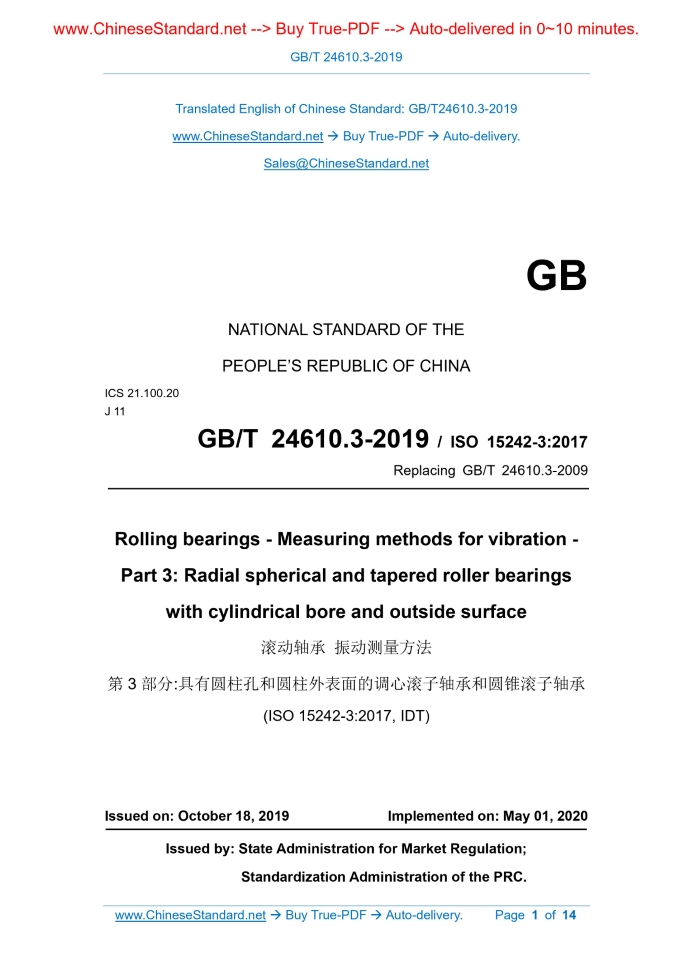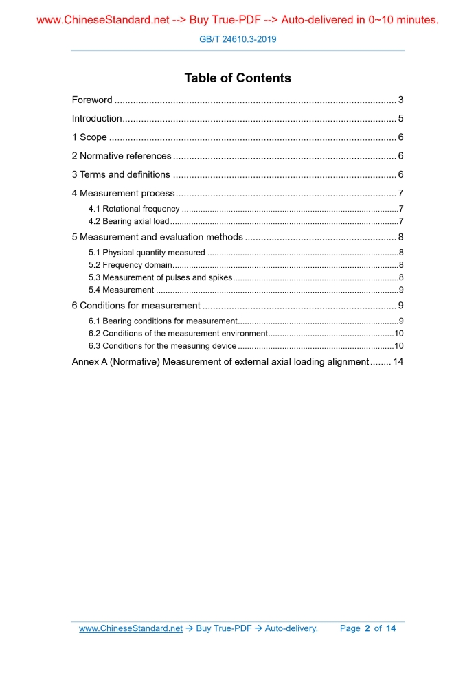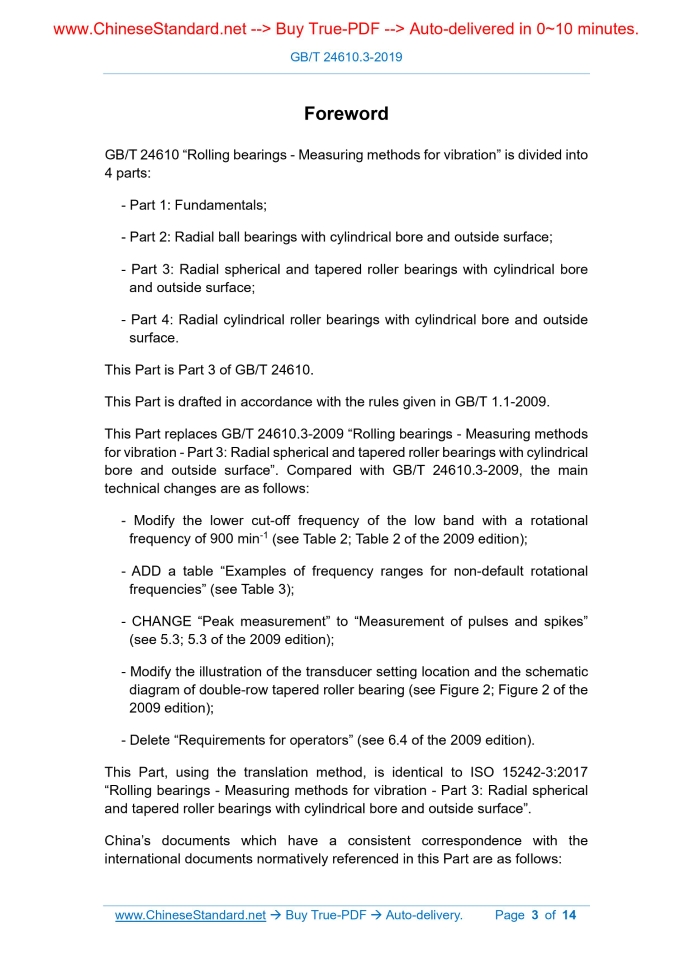 Similar standardsGB/T 24610.3-2019: Rolling bearings -- Measuring methods for vibration -- Part 3: Radial spherical and tapered roller bearings with cylindrical bore and outside surface---This is an excerpt. Full copy of true-PDF in English version (including equations, symbols, images, flow-chart, tables, and figures etc.), auto-downloaded/delivered in 9 seconds, can be purchased online: https://www.ChineseStandard.net/PDF.aspx/GBT24610.3-2019 Rolling bearings--Measuring methods for vibration--Part 3.Radial spherical and tapered roller bearings with cylindrical bore and outside surface ICS 21.100.20 J11 National Standards of People's Republic of China Replaces GB/T 24610.3-2009 Method for measuring vibration of rolling bearings Part 3.Cylindrical holes and cylindrical outer surfaces Spherical roller bearings and tapered roller bearings Part 3.Radialsphericalandtaperedrolerbearingswith (ISO 15242-3..2017, IDT) 2019-10-18 released 2020-05-01 implemented State Administration of Market Supervision Published by China National Standardization Administration Table of ContentsForeword I Introduction Ⅱ 1 Scope 1 2 Normative references 1 3 Terms and definitions 1 4 Measurement procedure 1 4.1 Rotation frequency 1 4.2 Bearing axial load 1 5 Measurement and evaluation methods 2 5.1 Measured physical quantities 2 5.2 Frequency domain 2 5.3 Pulse and sharp pulse measurement 3 5.4 Test 3 6 Measurement conditions 3 6.1 Bearing measurement conditions 3 6.2 Test environmental conditions 3 6.3 Test device conditions 4 Appendix A (Normative) Measurement of centering accuracy of applied axial load 7ForewordGB/T 24610 "Measurement method for rolling bearing vibration" is divided into 4 parts. --- Part 1.Basics; --- Part 2.Radial ball bearings with cylindrical holes and cylindrical outer surfaces; --- Part 3.Spherical roller bearings and tapered roller bearings with cylindrical bore and cylindrical outer surface; --- Part 4.Cylindrical roller bearings with cylindrical bore and cylindrical outer surface. This part is the third part of GB/T 24610. This section is drafted in accordance with the rules given in GB/T 1.1-2009. This section replaces GB/T 24610.3-2009 "Method for measuring vibration of rolling bearings-Part 3.With cylindrical holes and cylindrical appearance Compared with GB/T 24610.3-2009, the main technical changes are as follows. --- Modified the lower cut-off frequency of the low frequency band with a rotation frequency of 900min-1 (see Table 2, Table 2 of the.2009 edition); --- Added "Example of frequency range of non-set rotation frequency" table (see Table 3); --- Change "peak measurement" to "measurement of pulses and sharp pulses" (see 5.3, 5.3 of the.2009 edition); --- Modified the illustration of the sensor setting position and the schematic diagram of the double-row tapered roller bearing (see Figure 2, Figure 2 of the.2009 edition); --- Deleted the "requirements for operators" (see 6.4 of the.2009 version). This section uses the translation method equivalent to ISO 15242-3..2017 `` Rolling bearing vibration measurement methods Part 3.With cylindrical holes Spherical roller bearings and tapered roller bearings. " The Chinese documents that have a consistent correspondence with the international documents referenced normatively in this section are as follows. --- GB/T 1800.2-2009 Geometrical Product Specifications (GPS) Limits and Fits Part 2.Standard Tolerance Grades and Hole and shaft limit deviation table (ISO 286-2.1988, MOD) --- GB/T 2298-2010 Vocabulary for mechanical vibration, shock and condition monitoring (ISO 2041..2009, IDT) --- GB/T 4199-2003 Tolerance definition of rolling bearings (ISO 1132-1..2000, MOD) --- GB/T 6930-2002 Vocabulary for rolling bearings (ISO 5593..1997, IDT) --- GB/T 24610.1-2019 Rolling bearing vibration measurement method Part 1.Basics (ISO 15242-1..2015, IDT) This section is proposed by China Machinery Industry Federation. This part is under the jurisdiction of the National Rolling Bearing Standardization Technical Committee (SAC/TC98). This section was drafted. Luoyang Bearing Research Institute Co., Ltd., Zhejiang Zhaofeng Mechanical and Electrical Co., Ltd., Fujian Yongan Bearing Co., Ltd. Ren Company, Shandong Yujie Bearing Manufacturing Co., Ltd., Jim Bearing Group Co., Ltd., Xinchang Kaiyuan Automotive Bearing Co., Ltd. Cheng (Changxing) Co., Ltd., Chongqing Changjiang Bearing Co., Ltd., Shandong Camry Bearing Technology Co., Ltd., Liaocheng Renhe Precision Bearing Co., Ltd., Dalian Baishengyuan Technology Co., Ltd., Hangzhou Bearing Test Research Center Co., Ltd. The main drafters of this section. Song Yucong, Kong Chenhuan, Qian Weihua, Cai Meigui, Zhang Tianping, Liu Dan, Niu Jianping, Zhao Xingxin, Yan Jingxiang, Wang Yingchao, Hou Yongqiang, Du Xiaoyu, Cao Riqi, Li Xinglin. The previous versions of the standards replaced by this section are. --- GB/T 24610.3-2009.introductionThe vibration of a rolling bearing is an important operating characteristic. Vibration can affect the performance of a mechanical system with bearings. When vibration When propagated to the environment in which the operating mechanical system is located, it can cause audible noise, which can lead to system damage and even health problems. The vibration of a rolling bearing during rotation is a complex physical phenomenon related to the operating conditions. Single set of shafts measured under a set of conditions The bearing vibration value does not necessarily represent the vibration value under different conditions or when the bearing becomes a part of a larger component. Assessed The sound generated by the mechanical system of the bearing is more complicated.It is also affected by the interface conditions, the position and orientation of the sensing device, and the sound of the system. Impact of the learning environment. Air noise-GB/T 24610 (all parts) is defined as any unpleasant, undesired sound. Because the term "unpleasant, undesired" has a subjective nature, its 