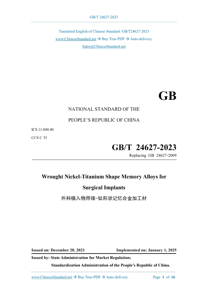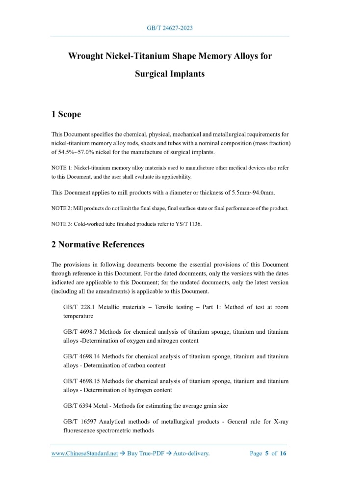 Similar standardsGB/T 24627-2023: Wrought nickel-titanium shape memory alloys for surgical implants---This is an excerpt. Full copy of true-PDF in English version (including equations, symbols, images, flow-chart, tables, and figures etc.), auto-downloaded/delivered in 9 seconds, can be purchased online: https://www.ChineseStandard.net/PDF.aspx/GBT24627-2023GB NATIONAL STANDARD OF THE PEOPLE’S REPUBLIC OF CHINA ICS 11.040.40 CCS C 35 Replacing GB 24627-2009 Wrought Nickel-Titanium Shape Memory Alloys for Surgical Implants Issued on: DECEMBER 28, 2023 Implemented on: JANUARY 1, 2025 Issued by. State Administration for Market Regulation; Standardization Administration of the People’s Republic of China. Table of ContentsForeword... 3 1 Scope... 5 2 Normative References... 5 3 Terms and Definitions... 6 4 Classification of Product... 7 5 Ordering Information... 8 6 Materials and Manufacturing... 8 7 Chemical Compositions... 9 8 Phase-Change Temperature... 10 9 Structure... 11 10 Mechanical Properties... 12 11 Special Requirements... 13 12 Report... 13 13 Quality Control Procedures... 13 Appendix A (Informative) Principles... 14 Appendix B (Informative) Biocompatibility... 15 Bibliography... 16 Wrought Nickel-Titanium Shape Memory Alloys for Surgical Implants1 ScopeThis Document specifies the chemical, physical, mechanical and metallurgical requirements for nickel-titanium memory alloy rods, sheets and tubes with a nominal composition (mass fraction) of 54.5%~57.0% nickel for the manufacture of surgical implants. NOTE 1.Nickel-titanium memory alloy materials used to manufacture other medical devices also refer to this Document, and the user shall evaluate its applicability. This Document applies to mill products with a diameter or thickness of 5.5mm~94.0mm. NOTE 2.Mill products do not limit the final shape, final surface state or final performance of the product. NOTE 3.Cold-worked tube finished products refer to YS/T 1136.2 Normative ReferencesThe provisions in following documents become the essential provisions of this Document through reference in this Document. For the dated documents, only the versions with the dates indicated are applicable to this Document; for the undated documents, only the latest version (including all the amendments) is applicable to this Document. GB/T 228.1 Metallic materials – Tensile testing – Part 1.Method of test at room temperature GB/T 4698.7 Methods for chemical analysis of titanium sponge, titanium and titanium alloys -Determination of oxygen and nitrogen content GB/T 4698.14 Methods for chemical analysis of titanium sponge, titanium and titanium alloys - Determination of carbon content GB/T 4698.15 Methods for chemical analysis of titanium sponge, titanium and titanium alloys - Determination of hydrogen content GB/T 6394 Metal - Methods for estimating the average grain size GB/T 16597 Analytical methods of metallurgical products - General rule for X-ray fluorescence spectrometric methods GB/T 18876.1 Standard practice for determining the metallographic constituent and inclusion content of steels and other metals by automatic image analysis - Part 1. Determining the inclusion or second-phase constituent content of steels and other metals by automatic image analysis and stereology GB/T 23614.1 Methods for chemical analysis of titanium nickel shape memory alloy - Part 1.Determination of nickel content - Dimethylglyoxime precipitate separation-EDTA complex-zinc chloride back titration YS/T 970 Phase change temperature measuring method for nickel-titanium shape memory alloys YS/T 1064-2015 Terminology for nickel-titanium shape memory alloys YY/T 0641 Standard test method for transformation temperature of nickel-titanium alloys by thermal analysis YY/T 1771 Standard test method for determination of transformation temperature of nickel-titanium shape memory alloys by bend and free recovery ASTM E1409 Standard Test Method for Determination of Oxygen and Nitrogen in Titanium and Titanium Alloys by Inert Gas Fusion ASTM E1447 Standard Test Method for Determination of Hydrogen in Titanium and Titanium Alloys by the Inert Gas Fusion Thermal Conductivity Method ASTM E1941 Standard Test Method for Determination of Carbon in Refractory and Reactive Metals and Their Alloys3 Terms and DefinitionsFor the purposes of this Document, the terms and definitions given in YS/T 1064-2015 and the following apply. 3.1 Ingot Cast metal that is used for processing into mill product. 3.2 Mill product The mill semi-finished or finished products. NOTE. It is a bar, wire or coil. Product states include hot-processed, hot-processed and cold-formed, hot- processed and cold-processed, hot-processed and annealed, and cold-processed and annealed products. 3.3 Martensite start temperature; Ms The start temperature of the transformation from the parent phase to the martensite phase during the one-step phase-change cooling process, or the start temperature of the transformation from the R-phase (transition phase) to the martensite phase during the two-step phase-change cooling process. [SOURCE. YS/T 1064-2015, 3.7, modified] 3.4 Martensite peak temperature; Mp The temperature at which the parent phase transforms to the martensite phase at the maximum exothermic peak on the one-step phase-change differential scanning calorimetry cooling curve, or the temperature at which the R-phase transforms to the martensite phase at the maximum exothermic peak on the two-step phase-change differential scanning calorimetry exothermic curve. [SOURCE. YS/T 1064-2015, 3.8, modified] 3.5 Martensite finish temperature; Mf The final temperature of the transformation from the parent phase to the martensite phase during the one-step phase-change cooling process, or the completion temperature of the transformation from the R-phase to the martensite phase during the two-step phase-change cooling process. 3.6 Austenite start temperature; As The start temperature of the transformation from martensite phase to aust