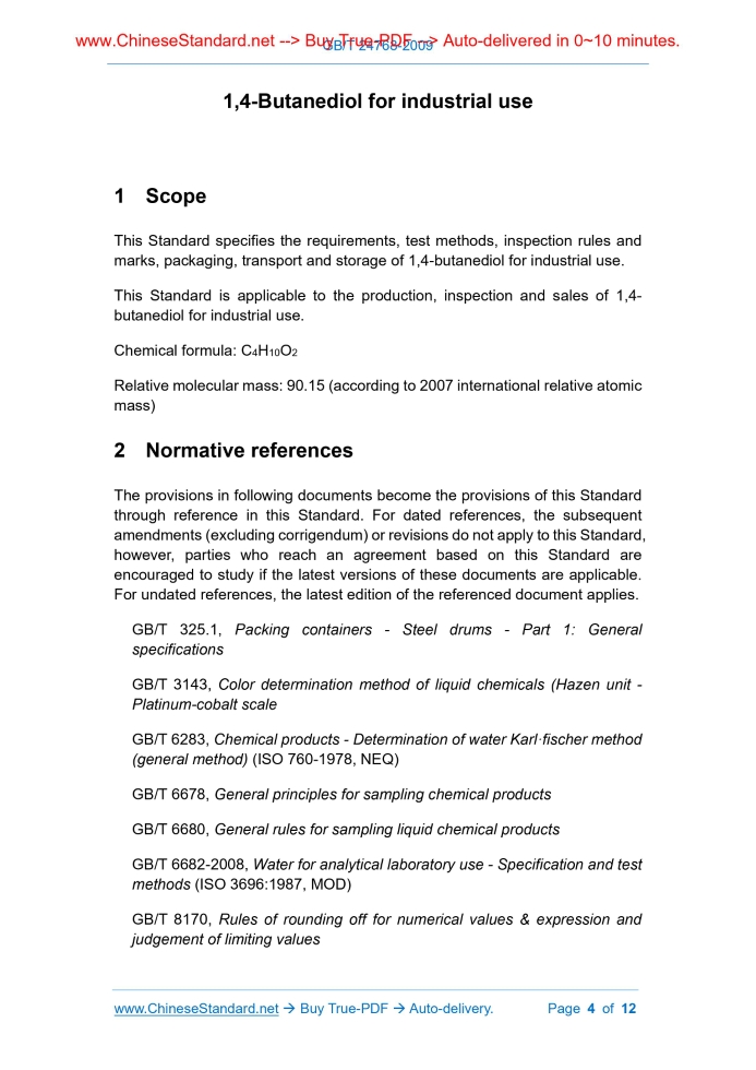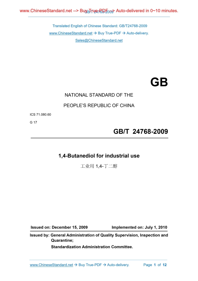 GB/T 24768-2009: 1,4-Butanediol for industrial use Delivery: 9 seconds. True-PDF full-copy in English & invoice will be downloaded + auto-delivered via email. See step-by-step procedure Status: Valid