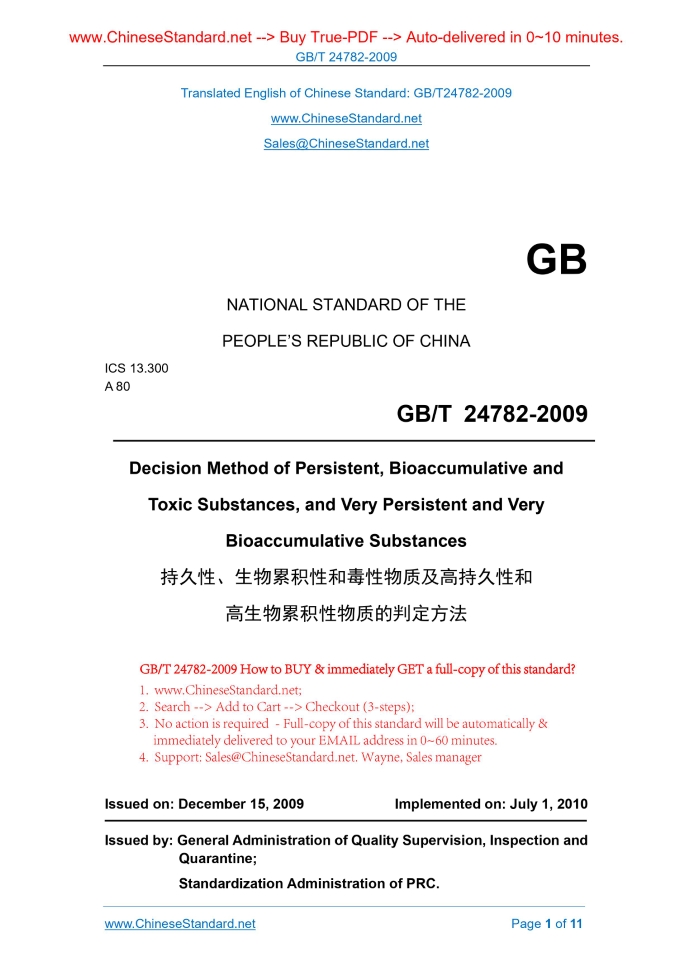 GB/T 24782-2009: Decision Method of Persistent, Bioaccumulative and Toxic Substances, and Very Persistent and Very Bioaccumulative Substances Delivery: 9 seconds. True-PDF full-copy in English & invoice will be downloaded + auto-delivered via email. See step-by-step procedure Status: Valid