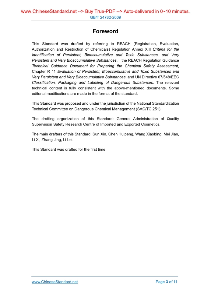 Similar standardsGB/T 24782-2009: Decision Method of Persistent, Bioaccumulative and Toxic Substances, and Very Persistent and Very Bioaccumulative Substances---This is an excerpt. Full copy of true-PDF in English version (including equations, symbols, images, flow-chart, tables, and figures etc.), auto-downloaded/delivered in 9 seconds, can be purchased online: https://www.ChineseStandard.net/PDF.aspx/GBT24782-2009 GB NATIONAL STANDARD OF THE PEOPLE’S REPUBLIC OF CHINA ICS 13.300 A 80 Decision Method of Persistent, Bioaccumulative and Toxic Substances, and Very Persistent and Very Bioaccumulative Substances Issued on: DECEMBER 15, 2009 Implemented on: JULY 1, 2010 Issued by. General Administration of Quality Supervision, Inspection and Quarantine; Standardization Administration of PRC. 3. No action is required - Full-copy of this standard will be automatically & immediately delivered to your EMAIL address in 0~60 minutes. Table of ContentsForeword ... 3 Introduction ... 4 1 Application Scope ... 5 2 Terms and Definitions ... 5 3 Identification of PBT Substances ... 6 4 Identification of vPvB Substances ... 9 5 Identification of PBT or vPvB Substances Using Screening Standard ... 9ForewordThis Standard was drafted by referring to REACH (Registration, Evaluation, Authorization and Restriction of Chemicals) Regulation Annex XIII Criteria for the Identification of Persistent, Bioaccumulative and Toxic Substances, and Very Persistent and Very Bioaccumulative Substances, the REACH Regulation Guidance Technical Guidance Document for Preparing the Chemical Safety Assessment, Chapter R 11 Evaluation of Persistent, Bioaccumulative and Toxic Substances and Very Persistent and Very Bioaccumulative Substances, and UN Directive 67/548/EEC Classification, Packaging and Labelling of Dangerous Substances. The relevant technical content is fully consistent with the above-mentioned documents. Some editorial modifications are made in the format of the standard. This Standard was proposed and under the jurisdiction of the National Standardization Technical Committee on Dangerous Chemical Management (SAC/TC 251). The drafting organization of this Standard. General Administration of Quality Supervision Safety Research Centre of Imported and Exported Cosmetics. The main drafters of this Standard. Sun Xin, Chen Huipeng, Wang Xiaobing, Mei Jian, Li Xi, Zhang Jing, Li Lei. This Standard was drafted for the first time. Decision Method of Persistent, Bioaccumulative and Toxic Substances, and Very Persistent and Very Bioaccumulative Substances1 Application ScopeThis Standard specifies the criteria for the identification of persistent, bioaccumulative and toxic substances, and very persistent and very bioaccumulative substances. Chapter 3 and Chapter 4 of this Standard are only applicable to metallo-organic compounds.2 Terms and DefinitionsFor the purposes of this Standard, the following terms and definitions apply. 2.1 PBT or vPvB substance A substance which contains a persistent, bioaccumulative and toxic, or very persistent and very bioaccumulative constituent. And the content of the constituents is 80% or more. 2.2 substance containing maximum X% (or X% ~ Y%) PBTs or vPvBs A substance which contains one or more persistent, bioaccumulative and toxic, or very persistent and very bioaccumulative constituents or impurities; and the content of a single content or impurity is greater than or equal to 0.1% (but less than 80%). The content may be a maximum content (X%) or content range (X% ~ Y%), as appropriate. 2.3 substance forming PBTs or vPvBs A substance whose constituents or impurities are degradable or can be transformed into persistent, bioaccumulative and toxic, or very persistent and very bioaccumulative substances; and the content of a single transformation or degradation product formed is greater than 0.1% (of the mass of the original substance). The mass fraction of There is sufficient evidence of the relationship between the exposure of human body to some substance and cancer. 3.3.2.2 the substance deemed possibly carcinogenic for human body The is sufficient evidence of the convincing hypothesis that cancer is caused because of exposure of human body to some substance, generally based on. a) appropriate long-term research in animals; b) other relevant information. 3.3.3 the substance meets the criteria for classification as teratogenic 3.3.3.1 the substance known to be teratogenic There is sufficient evidence of the relationship between the exposure of human body to some substance and the damage of genetic genes. 3.3.3.2 the substance deemed possibly teratogenic There is sufficient evidence of the convincing hypothesis that the damage of genetic genes is caused because of exposure of human body to some substance, generally based on. a) appropriate long-term research in animals; b) other relevant information. 3.3.4 the substance meets the criteria for classification as toxic for reproduction 3.3.4.1 the substance known to damage human reproduction There is sufficient evidence of the relationship between the exposure of human body to some substance and the damage of reproduction. 3.3.4.2 the substance deemed possibly toxic for the growth of human body There is sufficient evidence of the relationship between the exposure of human body to some substance and the growth of descendants. 3.3.4.3 the substance deemed possibly damaging for the reproduction of human beings There is sufficient evidence of the convincing evidence that the damage of reproduction is caused by the exposure of human body to some substance, based on. a) there is obvious evidence in the animal research of reproduction damage containing no toxicity or the evidence of reproduction damage of secondary non- Screening Standard The existing data of many substances are incapable of identifying the PBT/vPvB properties. Then the screening standard is used as alternative information to identify whether the substance fulfils the criterion of PBT/vPvB