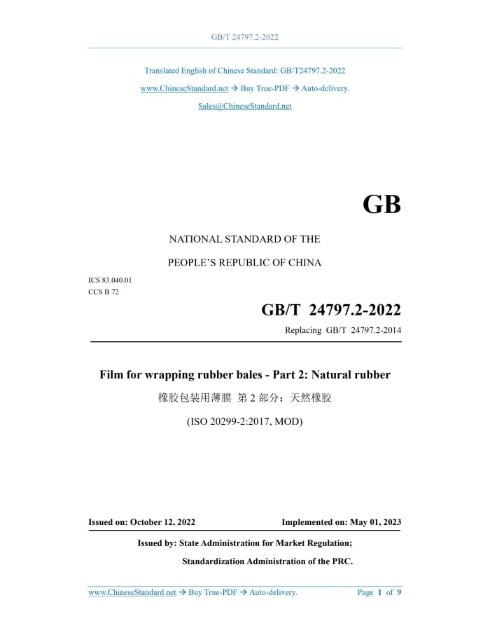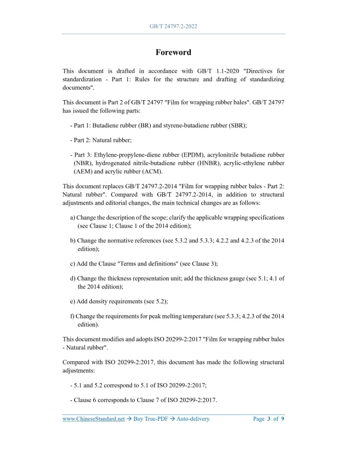 Similar standardsGB/T 24797.2-2022: Film for wrapping rubber bales - Part 2: Natural rubber---This is an excerpt. Full copy of true-PDF in English version (including equations, symbols, images, flow-chart, tables, and figures etc.), auto-downloaded/delivered in 9 seconds, can be purchased online: https://www.ChineseStandard.net/PDF.aspx/GBT24797.2-2022GB NATIONAL STANDARD OF THE PEOPLE’S REPUBLIC OF CHINA ICS 83.040.01 CCS B 72 Replacing GB/T 24797.2-2014 Film for wrapping rubber bales - Part 2: Natural rubber (ISO 20299-2:2017, MOD) ISSUED ON: OCTOBER 12, 2022 IMPLEMENTED ON: MAY 01, 2023 Issued by: State Administration for Market Regulation; Standardization Administration of the PRC. Table of ContentsForeword ... 3 Introduction ... 6 1 Scope ... 7 2 Normative references ... 7 3 Terms and definitions ... 8 4 Material ... 8 5 Physical properties ... 8 5.1 Thickness ... 8 5.2 Density ... 8 5.3 Thermal properties... 8 6 Test report ... 8ForewordThis document is drafted in accordance with GB/T 1.1-2020 "Directives for standardization - Part 1: Rules for the structure and drafting of standardizing documents". This document is Part 2 of GB/T 24797 "Film for wrapping rubber bales". GB/T 24797 has issued the following parts: - Part 1: Butadiene rubber (BR) and styrene-butadiene rubber (SBR); - Part 2: Natural rubber; - Part 3: Ethylene-propylene-diene rubber (EPDM), acrylonitrile butadiene rubber (NBR), hydrogenated nitrile-butadiene rubber (HNBR), acrylic-ethylene rubber (AEM) and acrylic rubber (ACM). This document replaces GB/T 24797.2-2014 "Film for wrapping rubber bales - Part 2: Natural rubber". Compared with GB/T 24797.2-2014, in addition to structural adjustments and editorial changes, the main technical changes are as follows: a) Change the description of the scope; clarify the applicable wrapping specifications (see Clause 1; Clause 1 of the 2014 edition); b) Change the normative references (see 5.3.2 and 5.3.3; 4.2.2 and 4.2.3 of the 2014 edition); c) Add the Clause "Terms and definitions" (see Clause 3); d) Change the thickness representation unit; add the thickness gauge (see 5.1; 4.1 of the 2014 edition); e) Add density requirements (see 5.2); f) Change the requirements for peak melting temperature (see 5.3.3; 4.2.3 of the 2014 edition). This document modifies and adopts ISO 20299-2:2017 "Film for wrapping rubber bales - Natural rubber". Compared with ISO 20299-2:2017, this document has made the following structural adjustments: - 5.1 and 5.2 correspond to 5.1 of ISO 20299-2:2017; - Clause 6 corresponds to Clause 7 of ISO 20299-2:2017. The technical differences between this document and ISO 20299-2:2017 and their reasons are as follows: - Change the expression of the scope; change the mass of the bale from 33.33 kg to 33.3 kg (see Clause 1; Clause 1 of ISO 20299-2:2017); to comply with the provisions of GB/T 1.1-2020 and GB/T 8081-2018; - Add the normative reference GB/T 1033.1-2008 (see 5.2), to specify the density determination method; - Use GB/T 19466.3 to replace ISO 11357-3 (see 5.3.3), to adapt to the regulations in China on the use of differential scanning calorimetry (DSC) to determine melting temperature; - Change "low-density polyethylene (PE-LD)" in film material TO "non-recycled low-density polyethylene (LDPE)" (see Clause 4; Clause 4 of ISO 20299-2:2017), to clearly specify the original state of the material; - Add thickness gauge (see 5.1), to provide optional thickness measuring instrument; - Change "specific gravity" to "density"; add the determination method GB/T 1033.1-2008 of density (see 5.2; 5.1 of ISO 20299-2:2017); in order to use a standardized physical quantity term and specify its determination method. Because although ISO 20299-2:2017 specifies the specific requirements for the specific gravity of the film, it does not give a determination method; - Delete the requirement for marking (see Clause 6 of ISO 20299-2:2017); because it conflicts with the specific provisions of GB/T 8082-2018. Attention is drawn to the possibility that some of the elements of this document may be the subject of patent rights. The issuing authority of this document shall not be held responsible for identifying any or all such patent rights. This document was proposed by China Petroleum and Chemical Industry Federation. This document shall be under the jurisdiction of Subcommittee 8 on Natural Rubber, National Technical Committee 35 on Rubber and Rubber Products of Standardization Administration of China (SAC/TC 35/SC 8). Drafting organizations of this document: Agricultural Products Processing Research Institute, Chinese Academy of Tropical Agricultural Sciences; Hainan Zhongxiang Technology Co., Ltd.; Hainan Natural Rubber Industry Group Jinxiang Co., Ltd.; Yunnan Natural Rubber Industry Group Jiangcheng Co., Ltd.; Xishuangbanna Sinochem Rubber Co., Ltd.; Guangdong Guangken Rubber Group Co., Ltd. Main drafters of this document: Lu Guang, Yuan Ruiquan, Li Yimin, Yang Chunliang, Film for wrapping rubber bales - Part 2: Natural rubber WARNING - Persons using this document should be familiar with normal laboratory practices. This document does not purport to address all of the safety problems, if any, associated with its use. It is the responsibility of the user to establish appropriate safety and health practices and to ensure compliance with any national regulatory conditions.1 ScopeThis document specifies the material and physical property requirements for non- strippable low density polyethylene film for wrapping natural rubber bales. The function of the film is to keep the bales separated from each other during transportation and storage. This document applies to each bale of block natural rubber of 33.3 kg or 35 kg; as well as to each bale of rubber ribbed smoked sheets of 33.3 kg, 35 kg, 50 kg, and 111.11 kg; or any other bale weights as mutually agreed between the relevant parties.2 Normative referencesThe contents of the following documents, through normative references 