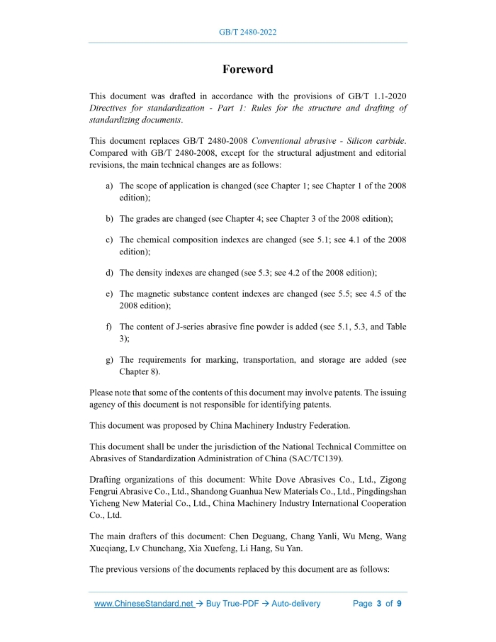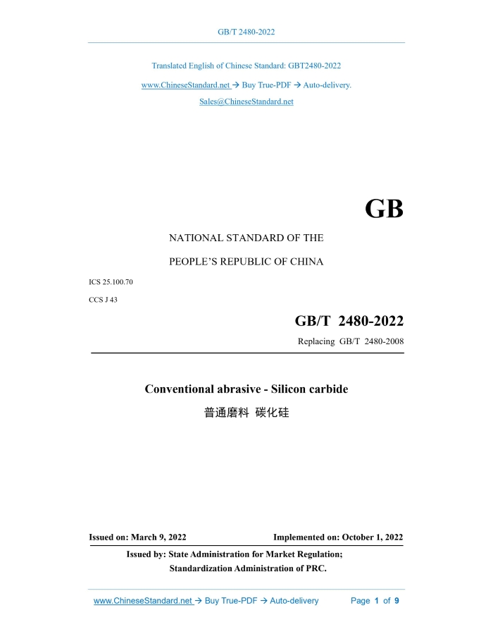 Similar standardsGB/T 2480-2022: Conventional abrasive - Silicon carbide---This is an excerpt. Full copy of true-PDF in English version (including equations, symbols, images, flow-chart, tables, and figures etc.), auto-downloaded/delivered in 9 seconds, can be purchased online: https://www.ChineseStandard.net/PDF.aspx/GBT2480-2022GB NATIONAL STANDARD OF THE PEOPLE’S REPUBLIC OF CHINA ICS 25.100.70 CCS J 43 Replacing GB/T 2480-2008 Conventional abrasive - Silicon carbide ISSUED ON: MARCH 9, 2022 IMPLEMENTED ON: OCTOBER 1, 2022 Issued by: State Administration for Market Regulation; Standardization Administration of PRC. Table of ContentsForeword ... 3 1 Scope ... 5 2 Normative references ... 5 3 Terms and definitions ... 5 4 Grades ... 5 5 Technical requirements ... 6 6 Test methods ... 8 7 Inspection rules ... 9 8 Packaging, marking, transportation, and storage ... 9ForewordThis document was drafted in accordance with the provisions of GB/T 1.1-2020 Directives for standardization - Part 1: Rules for the structure and drafting of standardizing documents. This document replaces GB/T 2480-2008 Conventional abrasive - Silicon carbide. Compared with GB/T 2480-2008, except for the structural adjustment and editorial revisions, the main technical changes are as follows: a) The scope of application is changed (see Chapter 1; see Chapter 1 of the 2008 edition); b) The grades are changed (see Chapter 4; see Chapter 3 of the 2008 edition); c) The chemical composition indexes are changed (see 5.1; see 4.1 of the 2008 edition); d) The density indexes are changed (see 5.3; see 4.2 of the 2008 edition); e) The magnetic substance content indexes are changed (see 5.5; see 4.5 of the 2008 edition); f) The content of J-series abrasive fine powder is added (see 5.1, 5.3, and Table 3); g) The requirements for marking, transportation, and storage are added (see Chapter 8). Please note that some of the contents of this document may involve patents. The issuing agency of this document is not responsible for identifying patents. This document was proposed by China Machinery Industry Federation. This document shall be under the jurisdiction of the National Technical Committee on Abrasives of Standardization Administration of China (SAC/TC139). Drafting organizations of this document: White Dove Abrasives Co., Ltd., Zigong Fengrui Abrasive Co., Ltd., Shandong Guanhua New Materials Co., Ltd., Pingdingshan Yicheng New Material Co., Ltd., China Machinery Industry International Cooperation Co., Ltd. The main drafters of this document: Chen Deguang, Chang Yanli, Wu Meng, Wang Xueqiang, Lv Chunchang, Xia Xuefeng, Li Hang, Su Yan. The previous versions of the documents replaced by this document are as follows: Conventional abrasive - Silicon carbide1 ScopeThis document specifies the grade, technical requirements, test methods, inspection rules, packaging, marking, transportation, and storage of silicon carbide abrasives. This document applies to silicon carbide abrasives for manufacturing bonded abrasive tools, coated abrasive tools, and for free grinding, polishing, and cutting.2 Normative referencesThe following documents contain the provisions which, through normative reference in this document, constitute the essential provisions of this document. For the dated referenced documents, only the versions with the indicated dates are applicable to this document; for the undated referenced documents, only the latest version (including all the amendments) is applicable to this document. GB/T 2481(all parts) Bonded abrasives - Determination and designation of grain size distribution GB/T 3045 Conventional abrasive - Chemical analysis of silicon carbide GB/T 4676 Abrasive grains - Sampling and splitting GB/T 9258(all parts) Coated abrasives - Grain size analysis JB/T 6569 Conventional abrasive - Packing JB/T 6570 Conventional abrasive - Testing method for magnetic materials JB/T 11433 Conventional abrasive - Determination of density3 Terms and definitionsThere are no terms and definitions that need to be defined in this document.4 GradesThe grades of silicon carbide abrasives are specified as follows: ......Source: Above contents are excerpted from the full-copy PDF -- translated/reviewed by: www.ChineseStandard.net / Wayne Zheng et al. Tips & Frequently Asked Questions:Question 1: How long will the true-PDF of English version of GB/T 2480-2022 be delivered?Answer: The full copy PDF of English version of GB/T 2480-2022 can be downloaded in 9 seconds, and it will also be emailed to you in 9 seconds (double mechanisms to ensure the delivery reliably), with PDF-invoice.Question 2: Can I share the purchased PDF of GB/T 2480-2022_English with my colleagues?Answer: Yes. The purchased PDF of GB/T 2480-2022_English will be deemed to be sold to your employer/organization who actually paid for it, including your colleagues and your employer's intranet.Question 3: Does the price include tax/VAT?Answer: Yes. Our tax invoice, downloaded/delivered in 9 seconds, includes all tax/VAT and complies with 100+ countries' tax regulations (tax exempted in 100+ countries) -- See Avoidance of Double Taxation Agreements (DTAs): List of DTAs signed between Singapore and 100+ countriesQuestion 4: Do you accept my currency other than USD?Answer: Yes. www.ChineseStandard.us -- GB/T 2480-2022 -- Click this link and select your country/currency to pay, the exact amount in your currency will be printed on the invoice. Full PDF will also be downloaded/emailed in 9 seconds.Question 5: Should I purchase the latest version GB/T 2480-2022?Answer: Yes. Unless special scenarios such as technical constraints or academic study, you should always prioritize to purchase the latest version GB/T 2480-2022 even if the enforcement date is in future. Complying with the latest version means that, by default, it also complies with all the earlier versions, technically.How to buy and download a true PDF of English version of GB/T 2480-2022?A step-by-step guide to download PD