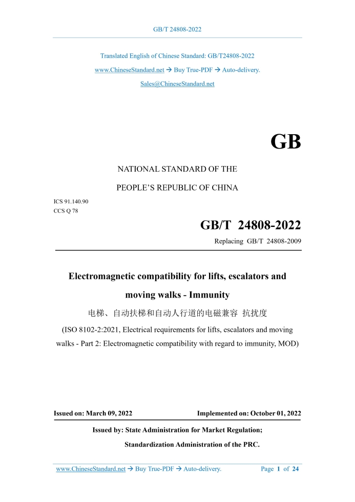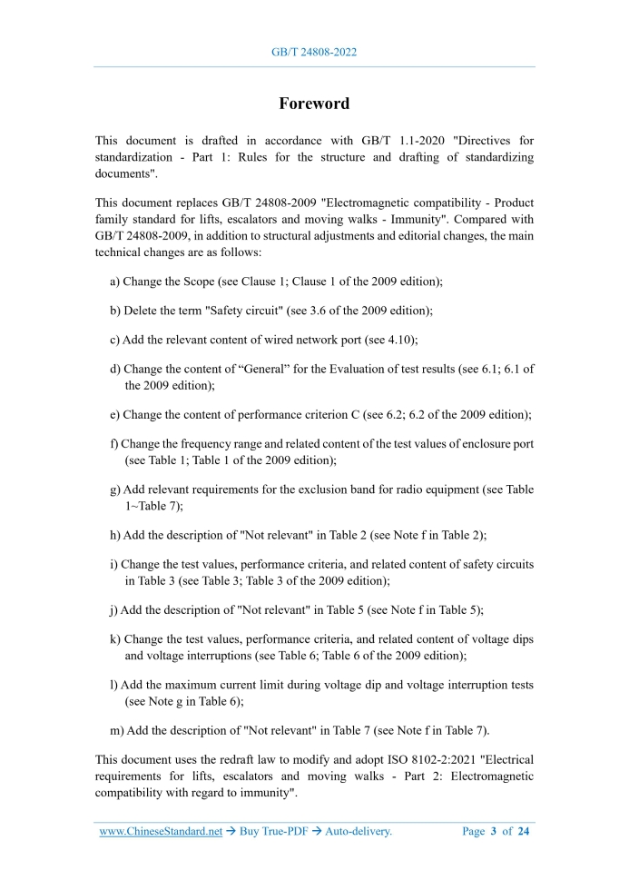 Similar standardsGB/T 24808-2022: Electromagnetic compatibility for lifts, escalators and moving walks - Immunity---This is an excerpt. Full copy of true-PDF in English version (including equations, symbols, images, flow-chart, tables, and figures etc.), auto-downloaded/delivered in 9 seconds, can be purchased online: https://www.ChineseStandard.net/PDF.aspx/GBT24808-2022NATIONAL STANDARD OF THE PEOPLE’S REPUBLIC OF CHINA ICS 91.140.90 CCS Q 78 Replacing GB/T 24808-2009 Electromagnetic compatibility for lifts, escalators and moving walks - Immunity (ISO 8102-2:2021, Electrical requirements for lifts, escalators and moving walks - Part 2: Electromagnetic compatibility with regard to immunity, MOD) ISSUED ON: MARCH 09, 2022 IMPLEMENTED ON: OCTOBER 01, 2022 Issued by: State Administration for Market Regulation; Standardization Administration of the PRC. Table of ContentsForeword ... 3 Introduction ... 6 1 Scope ... 7 2 Normative references ... 7 3 Terms and definitions ... 8 4 Test procedure ... 12 5 Applicability of tests ... 13 6 Evaluation of test results ... 13 7 Information provided to users ... 14 Bibliography ... 24 Electromagnetic compatibility for lifts, escalators and moving walks - Immunity1 Scope1.1 This document specifies the immunity performance criteria and test levels for apparatus used in lifts, escalators and moving walks which are intended to be permanently installed in buildings including the basic safety requirements in regard to their electromagnetic environment. These levels represent essential EMC requirements. This document refers to EM conditions as existing in residential, office and industrial buildings. 1.2 This document addresses commonly known EMC related hazards and hazardous situations relevant to lifts, escalators and moving walks when they are used as intended and under the conditions foreseen by the manufacturers. It is assumed that no ports connected to safety circuit only are rated at currents greater than 100 A. It is assumed that mobile telephones and radio transmitters used at frequencies and power of that stated in Table 1 are not placed within 200 mm distance from safety circuit(s). 1.3 Performance criteria and test levels for apparatus/assembly of apparatus used in general function circuits do not cover situations with an extremely low probability of occurrence. This document does not apply to other apparatus already proven to be in conformity to the relevant EMC national standard, and not related to the safety of the lift, escalator or moving walk, such as lighting apparatus, communication apparatus, etc. This document does not apply to electromagnetic environments such as radio transmitter stations, railways and metros, heavy industrial plant, and electricity power stations which need additional investigations. This document is not applicable to apparatus which were manufactured before the date of its implementation.2 Normative referencesThe contents of the following documents, through normative references in this text, constitute indispensable provisions of this document. Among them, for dated references, only the edition corresponding to that date applies to this document. For undated references, the latest edition (including all amendments) applies to this document. GB/T 17626.2-2018 Electromagnetic compatibility - Testing and measurement techniques - Electrostatic discharge immunity test (IEC 61000-4-2:2008, IDT) GB/T 17626.3-2016 Electromagnetic compatibility - Testing and measurement techniques - Radiated, radio-frequency, electromagnetic field immunity test (IEC 61000-4-3:2010, IDT) GB/T 17626.4-2018 Electromagnetic compatibility - Testing and measurement techniques - Electrical fast transient/burst immunity test (IEC 61000-4-4:2012, IDT) GB/T 17626.5-2019 Electromagnetic compatibility - Testing and measurement techniques - Surge immunity test (IEC 61000-4-5:2014, IDT) GB/T 17626.6-2017 Electromagnetic compatibility - Testing and measurement techniques - Immunity to conducted disturbances, induced by radio-frequency fields (IEC 61000-4-6:2013, IDT) GB/T 17626.11-2008 Electromagnetic compatibility - Testing and measurement techniques - Voltage dips, short interruptions and voltage variations immunity tests (IEC 61000-4-11:2004, IDT) GB/T 17799.1-2017 Electromagnetic compatibility - Generic standards - Immunity for residential, commercial and light-industrial environments (IEC 61000-6-1:2005, MOD) IEC 61000-6-2:2016 Electromagnetic compatibility (EMC) - Part 6-2: Generic standards - Immunity for industrial environments CISPR 32:2015+A1:2019 Electromagnetic compatibility of multimedia equipment - Emission requirements CISPR 35:2016 Electromagnetic compatibility of multimedia equipment - Immunity requirements3 Terms and definitionsFor the purpose of this document, the terms and definitions given in GB/T 17799.1- 2017, IEC 61000-6-2:2016 and the following apply. 3.1 Assembly of apparatus4 Test procedure4.1 The tests shall be carried out as stated in GB/T 17626.2-2018, GB/T 17626.3-2016, GB/T 17626.4-2018, GB/T 17626.5-2019, GB/T 17626.6-2017 and GB/T 17626.11- 2008, as appropriate (see Table 1 to Table 7). An attempt shall be made to maximize susceptibility by varying the position of the test sample in the test facility. 4.2 Travelling cables or any other cables likely to be more than 5 m long shall be represented by a sample of at least 5 m long connected to the relevant port for the purpose of testing for susceptibility. 4.3 It is not always possible to measure the immunity levels for every function of the apparatus/assembly of apparatus. In such cases, the most critical period of operation shall be selected. 4.4 The test shall be carried out under a single set of environmental conditions within the specified operating range of temperature, humidity, air pressure and supply voltage, unless otherwise indicated in the standards referred to in 4.1. 4.5 All tests shall be carried out in well-defined and reproducible conditions. 4.6 To facilita