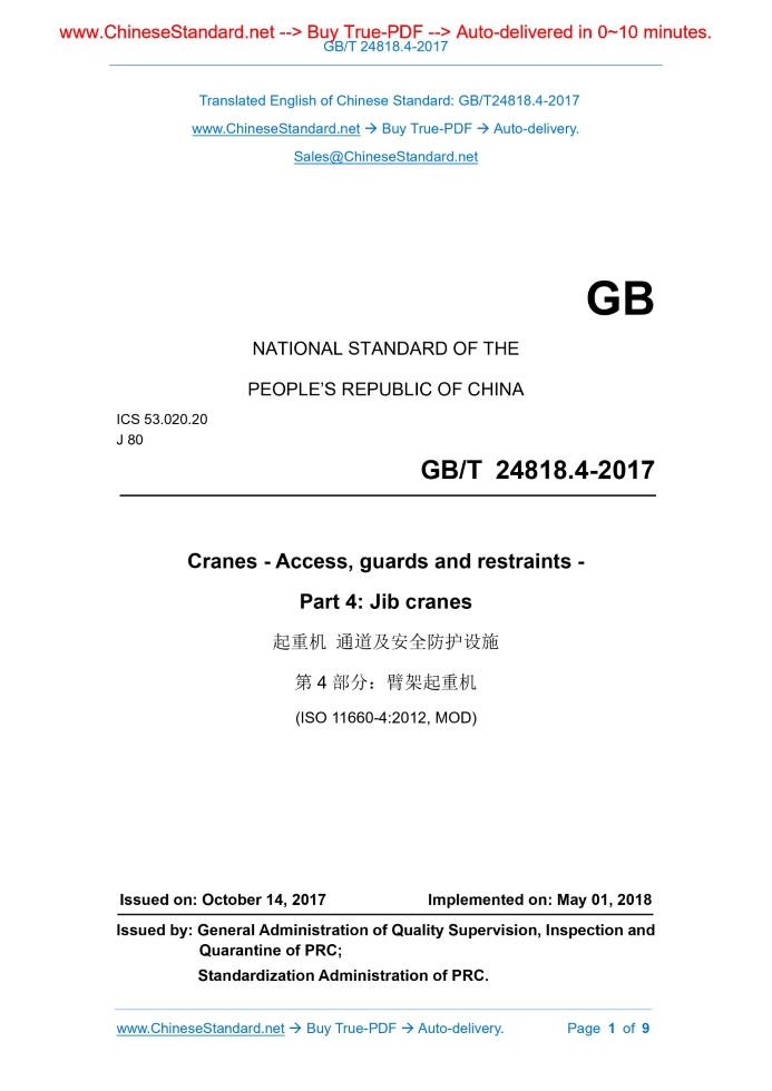 GB/T 24818.4-2017: Cranes -- Access, guards and restraints -- Part 4: Jib cranes Delivery: 9 seconds. True-PDF full-copy in English & invoice will be downloaded + auto-delivered via email. See step-by-step procedure Status: Valid