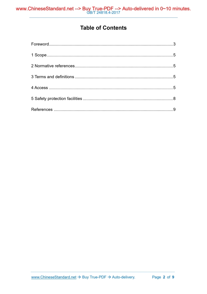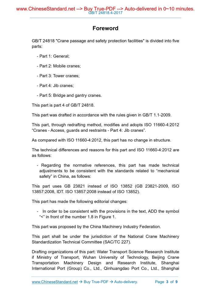 Similar standardsGB/T 24818.4-2017: Cranes -- Access, guards and restraints -- Part 4: Jib cranes---This is an excerpt. Full copy of true-PDF in English version (including equations, symbols, images, flow-chart, tables, and figures etc.), auto-downloaded/delivered in 9 seconds, can be purchased online: https://www.ChineseStandard.net/PDF.aspx/GBT24818.4-2017GB NATIONAL STANDARD OF THE PEOPLE’S REPUBLIC OF CHINA ICS 53.020.20 J 80 Cranes - Access, guards and restraints - Part 4: Jib cranes (ISO 11660-4:2012, MOD) ISSUED ON: OCTOBER 14, 2017 IMPLEMENTED ON: MAY 01, 2018 Issued by: General Administration of Quality Supervision, Inspection and Quarantine of PRC; Standardization Administration of PRC. Table of ContentsForeword ... 3 1 Scope ... 5 2 Normative references ... 5 3 Terms and definitions ... 5 4 Access ... 5 5 Safety protection facilities ... 8 References ... 9ForewordGB/T 24818 "Crane passage and safety protection facilities" is divided into five parts: - Part 1: General; - Part 2: Mobile cranes; - Part 3: Tower cranes; - Part 4: Jib cranes; - Part 5: Bridge and gantry cranes. This part is part 4 of GB/T 24818. This part was drafted in accordance with the rules given in GB/T 1.1-2009. This part, through redrafting method, modifies and adopts ISO 11660-4:2012 “Cranes - Access, guards and restraints - Part 4: Jib cranes”. As compared with ISO 11660-4:2012, this part has no change in structure. The technical differences and reasons for this part and ISO 11660-4:2012 are as follows: - Regarding the normative references, this part has made technical adjustments to be consistent with the standards related to “mechanical safety” in China, as follows: This part uses GB 23821 instead of ISO 13852 (GB 23821-2009, ISO 13857:2008, IDT. ISO 13857:2008 instead of ISO 13852). This part has made the following editorial changes: - In order to be consistent with the provisions in the text, ADD the symbol “< ” in front of the number 1.8 in Figure 1. This part was proposed by the China Machinery Industry Federation. This part shall be under the jurisdiction of the National Crane Machinery Standardization Technical Committee (SAC/TC 227). Drafting organizations of this part: Water Transport Science Research Institute if Ministry of Transport, Wuhan University of Technology, Beijing Crane Transportation Machinery Design and Research Institute, Shanghai International Port (Group) Co., Ltd., Qinhuangdao Port Co., Ltd., Shanghai Cranes - Access, guards and restraints - Part 4: Jib cranes1 ScopeThis part of GB/T 24818 specifies the special requirements for the access, guards and restraints of jib cranes (hereinafter referred to as cranes). GB/T 24818.1 determines the general requirements for the access to the console and other parts of the crane during normal operation, inspection, maintenance, installation, disassembly of cranes as defined in GB/T 6974.1, as well as the general requirements for safety protection devices to protect the personnel on or near crane from being injured by the moving parts, descending parts, rotating parts. This part applies to the jib crane as defined in GB/T 6974.1.2 Normative referencesThe following documents are essential to the application of this document. For the dated documents, only the versions with the dates indicated are applicable to this document; for the undated documents, only the latest version (including all the amendments) are applicable to this standard. GB 23821 Safety of machinery - Safety distances to prevent hazard zones being reached by upper and lower limbs (GB 23821-2009, ISO 13857:2008, IDT) GB/T 24818.1-2009 Cranes - Access, guards and restraints - Part 1: General (ISO 11660-1:2008, IDT)3 Terms and definitionsThe terms and definitions as defined in GB/T 24818.1 apply to this document.4 Access4.1 General All consoles and other parts of the crane shall be accessed through walkways,5 Safety protection facilities5.1 Protection of moving parts When entering all consoles and other parts of the crane, the moving parts shall be protected by a safety distance in accordance with GB 23821 or by the installation of detachable or fixed restraints. For moving parts without restraints, it shall provide warning information. In commonly-used access areas, open gears, chain drives and similar transmissions shall be fitted with restraints. Exceptionally, for large-slewing gears, if the engagement point with the pinion gear is far enough away from the frequently-used access (category-1) according to the requirements of GB 23821, it is not necessary to install a restraint. If the restraints cannot be provided due to the structure of crane, for example, the limited space area within the connection range between the upper slewing crane or the slewing bearing, the slewing bearing and the slewing platform, it shall provide the warning information. Restraints for walkways or work platforms shall be designed in accordance with the requirements of GB/T 24818.1. The hook pulley block is so designed as to minimize the risk of the hand being caught between the wire rope and the pulley. Note: For functional inspection and maintenance, reels, brakes, couplings are generally not covered or protected, because there is usually no access to these mechanisms during normal operation of the crane. 5.2 Preventing the fall of crane’s components and accessories The design, assembly, fixation of crane components such as gears, pulleys, casings, cabinets shall be prevented from falling during normal operation. The casing, guards, access doors shall be hinged or otherwise designed to prevent them from falling. The pinion of the slewing mechanism shall be provided with a casing or other means, to prevent it from falling due to breakage or crushing. ......Source: Above contents are excerpted from the full-copy PDF -- translated/reviewed by: www.ChineseStandard.net / Wayne Zheng et al. Tips & Frequently Asked Questions:Question 1: How long will the true-PDF of English version of GB/