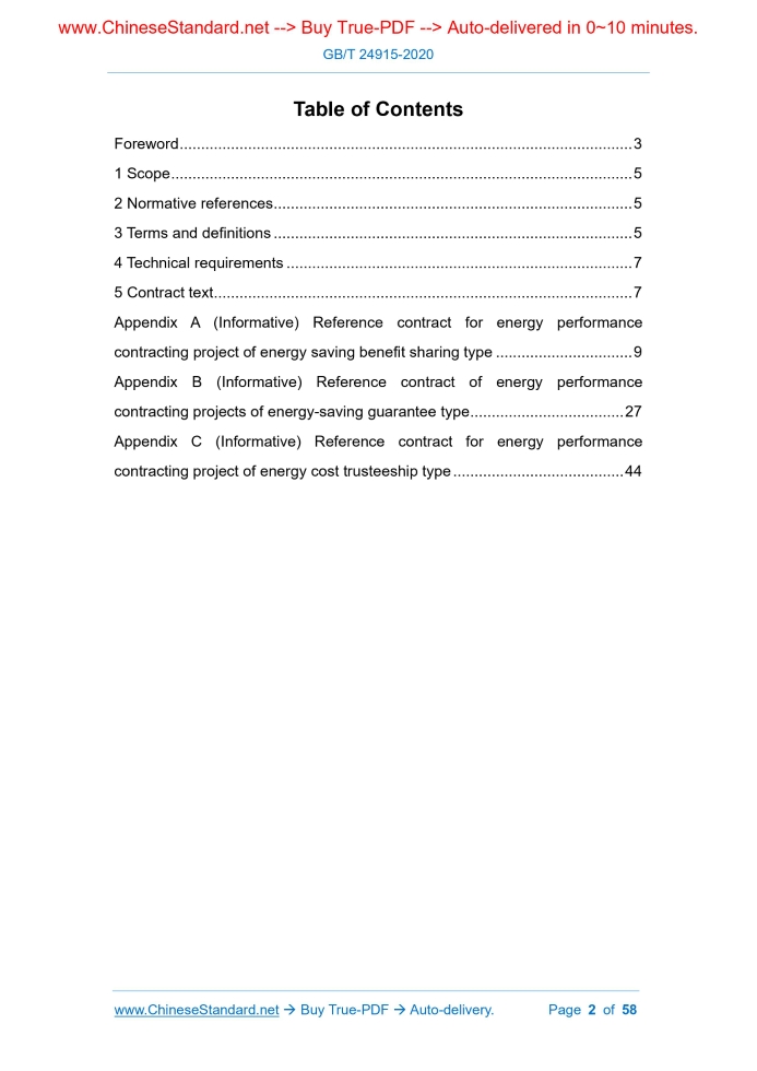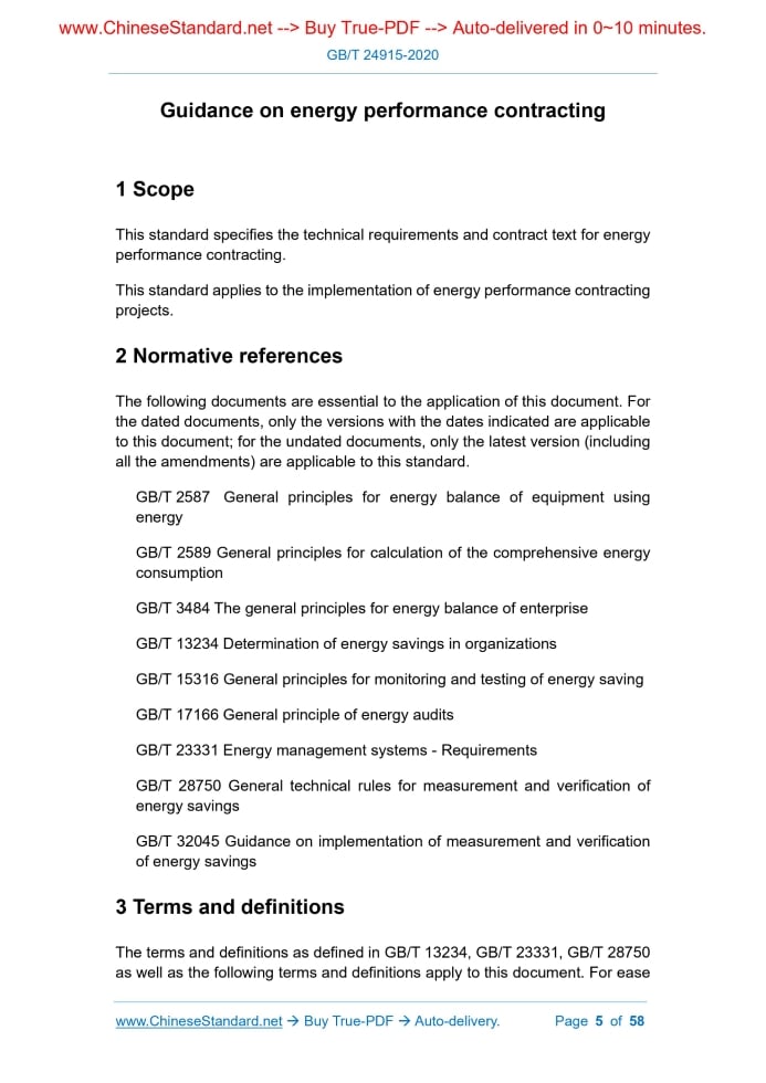 GB/T 24915-2020: Guidance on energy performance contracting---This is an excerpt. Full copy of true-PDF in English version (including equations, symbols, images, flow-chart, tables, and figures etc.), auto-downloaded/delivered in 9 seconds, can be purchased online: https://www.ChineseStandard.net/PDF.aspx/GBT24915-2020GB NATIONAL STANDARD OF THE PEOPLE’S REPUBLIC OF CHINA ICS 27.010 F 01 Replacing GB/T 24915-2010 Guidance on energy performance contracting Issued on. MARCH 31, 2020 Implemented on. OCTOBER 01, 2020 Issued by. State Administration for Market Regulation; Standardization Administration of PRC. Table of ContentsForeword... 3 1 Scope... 5 2 Normative references... 5 3 Terms and definitions... 5 4 Technical requirements... 7 5 Contract text... 7 Appendix A (Informative) Reference contract for energy performance contracting project of energy saving benefit sharing type... 9 Appendix B (Informative) Reference contract of energy performance contracting projects of energy-saving guarantee type... 27 Appendix C (Informative) Reference contract for energy performance contracting project of energy cost trusteeship type... 441 ScopeThis standard specifies the technical requirements and contract text for energy performance contracting. This standard applies to the implementation of energy performance contracting projects.2 Normative referencesThe following documents are essential to the application of this document. For the dated documents, only the versions with the dates indicated are applicable to this document; for the undated documents, only the latest version (including all the amendments) are applicable to this standard. GB/T 2587 General principles for energy balance of equipment using energy GB/T 2589 General principles for calculation of the comprehensive energy consumption GB/T 3484 The general principles for energy balance of enterprise GB/T 13234 Determination of energy savings in organizations GB/T 15316 General principles for monitoring and testing of energy saving GB/T 17166 General principle of energy audits GB/T 23331 Energy management systems - Requirements GB/T 28750 General technical rules for measurement and verification of energy savings3 Terms and definitionsThe terms and definitions as defined in GB/T 13234, GB/T 23331, GB/T 28750 as well as the following terms and definitions apply to this document. For ease of use, some terms and definitions in GB/T 13234 and GB/T 23331 are repeatedly listed below. 3.2 Energy performance contracting project Energy conservation projects implemented under energy performance contracting mechanisms. 3.3 Energy services company; ESCO A professional company that provides services such as energy consumption diagnosis, energy-saving project design, financing, renovation (construction, equipment installation, commissioning), operation management and other services. 3.4 Energy baseline A quantitative reference basis for comparing energy performance. Note 1.The energy baseline reflects the energy utilization status in a specific time period. 3.5 Energy savings The amount of energy consumption/energy consumption reduction under the conditions of meeting the same demand or achieving the same purpose.4 Technical requirements4.1 The elements of an energy performance contracting project include energy use status diagnosis, energy baseline determination, energy-saving measures, quantitative energy-saving targets, energy-saving benefit sharing methods, energy-saving measurement and verification, etc. 4.4 Energy-saving measures shall comply with the requirements of national laws and regulations, industrial policy requirements and relevant standards such as technology and equipment. 4.5 Energy-saving measurement and verification shall comply with relevant standards such as GB/T 28750 and GB/T 32045.5 Contract text5.1 The contract text is an important carrier for the implementation of energy performance contracting projects. Energy performance contracting project contracts include energy-saving benefit sharing, energy-saving guarantee, energy cost trusteeship, financial leasing, hybrid and other types of contracts. 5.2 Both parties to the energy-saving benefit-sharing project can refer to Appendix A to develop a special implementation contract text for energy performance contracting project. 5.4 Both parties of an energy cost trusteeship project can refer to Appendix C to develop a special implementation contract text for energy performance contracting project. ......Source: Above contents are excerpted from the full-copy PDF -- translated/reviewed by: www.ChineseStandard.net / Wayne Zheng et al. Tips & Frequently Asked Questions:Question 1: How long will the true-PDF of English version of GB/T 24915-2020 be delivered?Answer: The full copy PDF of English version of GB/T 24915-2020 can be downloaded in 9 seconds, and it will also be emailed to you in 9 seconds (double mechanisms to ensure the delivery reliably), with PDF-invoice.Question 2: Can I share the purchased PDF of GB/T 24915-2020_English with my colleagues?Answer: Yes. The purchased PDF of GB/T 24915-2020_English will be deemed to be sold to your employer/organization who actually paid for it, including your colleagues and your employer's intranet.Question 3: Does the price include tax/VAT?Answer: Yes. Our tax invoice, downloaded/delivered in 9 seconds, includes all tax/VAT and complies with 100+ countries' tax regulations (tax exempted in 100+ countries) -- See Avoidance of Double Taxation Agreements (DTAs): List of DTAs signed between Singapore and 100+ countriesQuestion 4: Do you accept my currency other than USD?Answer: Yes. www.ChineseStandard.us -- GB/T 24915-2020 -- Click this link and select your country/currency to pay, the exact amount in your currency will be printed on the invoice. Full PDF will also be downloaded/emailed in 9 seconds.Question 5: Should I purchase the latest version GB/T 24915-2020?Answer: Yes. Unless special scenarios such as technical constraints or academic