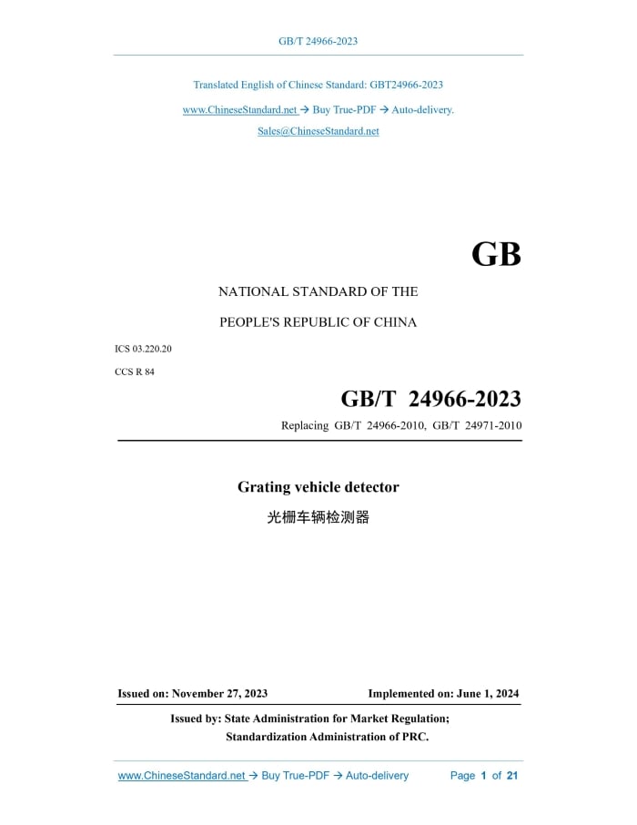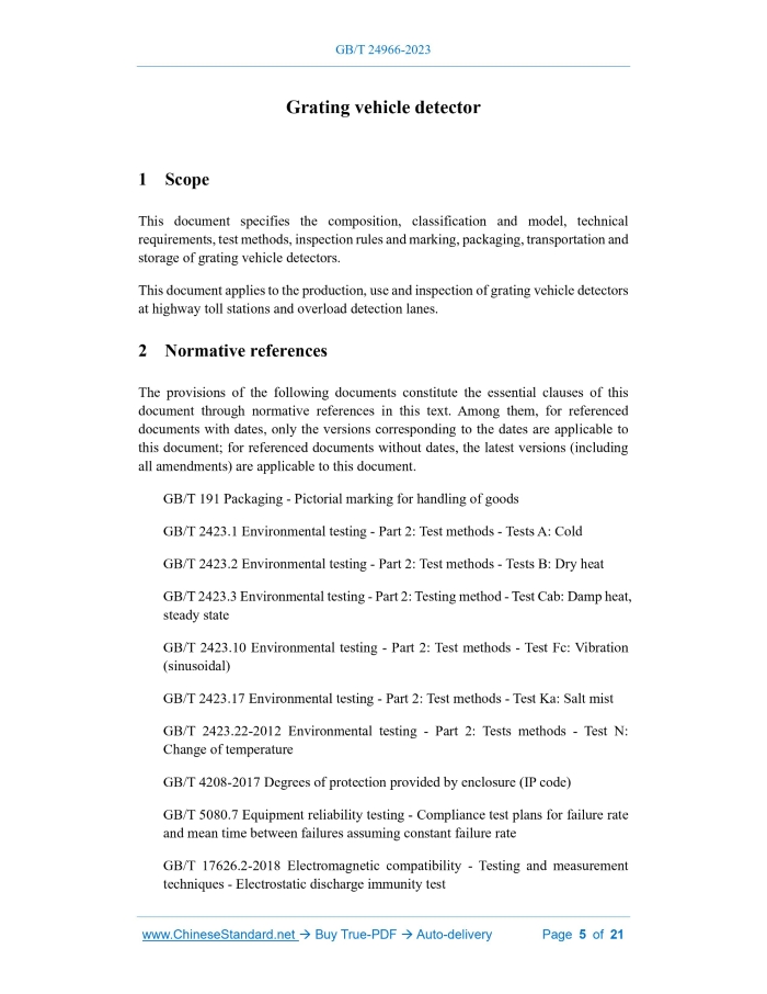 Similar standardsGB/T 24966-2023: Grating vehicle detector---This is an excerpt. Full copy of true-PDF in English version (including equations, symbols, images, flow-chart, tables, and figures etc.), auto-downloaded/delivered in 9 seconds, can be purchased online: https://www.ChineseStandard.net/PDF.aspx/GBT24966-2023GB NATIONAL STANDARD OF THE PEOPLE'S REPUBLIC OF CHINA ICS 03.220.20 CCS R 84 Replacing GB/T 24966-2010, GB/T 24971-2010 Grating vehicle detector Issued on: NOVEMBER 27, 2023 Implemented on: JUNE 1, 2024 Issued by. State Administration for Market Regulation; Standardization Administration of PRC. Table of ContentsForeword... 3 1 Scope... 5 2 Normative references... 5 3 Terms and definitions... 6 4 Composition, classification and model... 6 5 Technical requirements... 9 6 Test methods... 13 7 Inspection rules... 18 8 Marking, packaging, transportation and storage... 19 Grating vehicle detector1 ScopeThis document specifies the composition, classification and model, technical requirements, test methods, inspection rules and marking, packaging, transportation and storage of grating vehicle detectors. This document applies to the production, use and inspection of grating vehicle detectors at highway toll stations and overload detection lanes.2 Normative referencesThe provisions of the following documents constitute the essential clauses of this document through normative references in this text. Among them, for referenced documents with dates, only the versions corresponding to the dates are applicable to this document; for referenced documents without dates, the latest versions (including all amendments) are applicable to this document. GB/T 191 Packaging - Pictorial marking for handling of goods GB/T 2423.1 Environmental testing - Part 2.Test methods - Tests A. Cold GB/T 2423.2 Environmental testing - Part 2.Test methods - Tests B. Dry heat GB/T 2423.3 Environmental testing - Part 2.Testing method - Test Cab. Damp heat, steady state GB/T 2423.10 Environmental testing - Part 2.Test methods - Test Fc. Vibration (sinusoidal) GB/T 2423.17 Environmental testing - Part 2.Test methods - Test Ka. Salt mist GB/T 2423.22-2012 Environmental testing - Part 2.Tests methods - Test N. Change of temperature GB/T 4208-2017 Degrees of protection provided by enclosure (IP code) GB/T 5080.7 Equipment reliability testing - Compliance test plans for failure rate and mean time between failures assuming constant failure rate GB/T 17626.2-2018 Electromagnetic compatibility - Testing and measurement techniques - Electrostatic discharge immunity test5 Technical requirements5.1 Structure 5.1.1 The product structure shall be simple, firm, and easy to install and adjust. 5.1.2 The installed connectors shall be free from defects such as obvious deformation and irregularity. 5.1.3 The communication interface and external connection shall be easy to install and maintain, and waterproof and dustproof measures shall be taken. 5.2 Appearance quality 5.2.1 The outer shell of the grating vehicle detector shall not have pits, scratches, deformations or cracks; the coating shall be smooth and uniform, with consistent color, and shall not have defects such as blistering and cracking. 5.2.2 The nameplates, marks, texts, etc. on the body of the grating vehicle detector shall be clear, firm, straight and not easy to fall off. 5.3 Functionality 5.3.1 The grating vehicle detector shall be capable of detecting one or more of the following, including the vehicle separation, vehicle height, vehicle width, axle, tire type, truck model and vehicle flow. 5.3.2 Type B grating vehicle detectors shall have an electric heating function to effectively prevent condensation and frost. 5.3.3 The grating vehicle detector shall have the function of automatically detecting the working status and fault detection, output alarm information when a fault occurs, and the system shall automatically return to normal working status after the fault is eliminated. 5.3.4 The data collected by the grating vehicle detector shall be able to be read in real time by a portable terminal, and other maintenance operations and local management shall be possible. 5.3.5 The communication interface of the grating vehicle detector shall use RS232, RS485, RS422 serial ports or RJ-45 Ethernet interface. 5.3.6 The grating vehicle detector may have a network management function. 5.4 Vehicle detection performance 5.4.1 The relative error of vehicle separation detection shall not exceed 0.1%. 5.4.2 The measurement error of vehicle height detection shall not exceed 100 mm. 5.4.3 The measurement error of vehicle width detection shall not exceed 100 mm. 5.4.4 The relative error of axle detection shall not exceed 0.1%. 5.4.5 The relative error of tire type detection shall not exceed 2%. 5.4.6 The relative error of truck model detection shall not exceed 1%. 5.4.7 The relative error of vehicle flow detection shall not exceed 0.1%. 5.4.8 The minimum resolution dimension of the vehicle separation detection type shall not exceed 50 mm. 5.4.9 The maximum effective detection distance between the transmitter and the receiver shall not be less than 8 m. 5.4.10 The separation detection response time shall not exceed 50 ms. 5.5 Electrical safety performance 5.5.1 AC power supply type grating vehicle detector 5.5.1.1 Power adaptability The product shall work reliably under the following input voltage conditions. -- Voltage. AC 220 × (1±15%) V; -- Frequency. 50 × (1±4%) Hz. 5.5.1.2 Insulation resistance The insulation resistance between the power terminal and the casing of the product shall be no less than 100 MΩ. 5.5.1.3 Dielectric strength When applying a sinusoidal AC voltage of 50 Hz and effective value of 1500 V between the power terminal and the casing of the product for 1 min, there shall be no spark, flashover or breakdown. 5.5.1.4 Contact resistance The product shall be equipped with a safety protection grounding terminal. The In the power-on state, after scanning cycle v