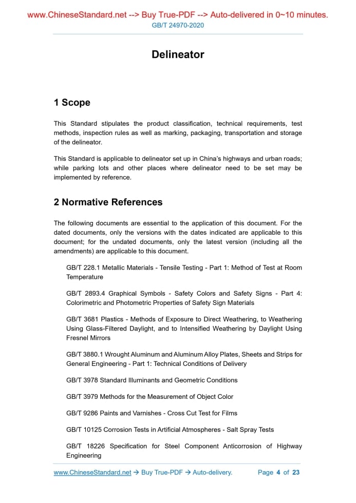 Similar standardsGB/T 24970-2020: Delineator---This is an excerpt. Full copy of true-PDF in English version (including equations, symbols, images, flow-chart, tables, and figures etc.), auto-downloaded/delivered in 9 seconds, can be purchased online: https://www.ChineseStandard.net/PDF.aspx/GBT24970-2020NATIONAL STANDARD OF THE PEOPLE’S REPUBLIC OF CHINA ICS 93.080.30 P 66 Replacing GB/T 24970-2010 Delineator ISSUED ON: MARCH 06, 2020 IMPLEMENTED ON: OCTOBER 01, 2020 Issued by: State Administration for Market Regulation; Standardization Administration of PRC. Table of ContentsForeword ... 3 1 Scope ... 4 2 Normative References ... 4 3 Terms and Definitions ... 5 4 Product Classification ... 6 5 Technical Requirements ... 6 6 Test Methods ... 14 7 Inspection Rules ... 21 8 Marking, Packaging, Transportation and Storage ... 22 Delineator1 ScopeThis Standard stipulates the product classification, technical requirements, test methods, inspection rules as well as marking, packaging, transportation and storage of the delineator. This Standard is applicable to delineator set up in China’s highways and urban roads; while parking lots and other places where delineator need to be set may be implemented by reference.2 Normative ReferencesThe following documents are essential to the application of this document. For the dated documents, only the versions with the dates indicated are applicable to this document; for the undated documents, only the latest version (including all the amendments) are applicable to this document. GB/T 228.1 Metallic Materials - Tensile Testing - Part 1: Method of Test at Room Temperature GB/T 2893.4 Graphical Symbols - Safety Colors and Safety Signs - Part 4: Colorimetric and Photometric Properties of Safety Sign Materials GB/T 3681 Plastics - Methods of Exposure to Direct Weathering, to Weathering Using Glass-Filtered Daylight, and to Intensified Weathering by Daylight Using Fresnel Mirrors GB/T 3880.1 Wrought Aluminum and Aluminum Alloy Plates, Sheets and Strips for General Engineering - Part 1: Technical Conditions of Delivery GB/T 3978 Standard Illuminants and Geometric Conditions GB/T 3979 Methods for the Measurement of Object Color GB/T 9286 Paints and Varnishes - Cross Cut Test for Films GB/T 10125 Corrosion Tests in Artificial Atmospheres - Salt Spray Tests GB/T 18226 Specification for Steel Component Anticorrosion of Highway Engineering 3.4 Persistence luminous The brightness of self-luminous marks at a certain moment in the persistence time.4 Product ClassificationAccording to the setting conditions, the delineators are divided into post delineator buried on the ground and attached delineator attached to the structure. According to the shape of the reflector, the delineators are divided into trapezoidal, circular and rectangular delineator. According to the color, the delineators are divided into white and yellow delineator.5 Technical Requirements5.1 Structural dimension 5.1.1 Post delineator 5.1.1.1 The post delineator is composed of a cylinder, a black mark and a reflector; and the three parts shall be firmly connected. The cylinder is white. There shall be a 250mm long black mark on the upper part of the cylinder. There shall be a 180mm×40mm rectangular reflector in the middle of the black mark. Energy storage self-luminous material may be added on the basis of the reflector. 5.1.1.2 The cross-section of the cylinder is an isosceles triangle or a circular arc with hollow fillets. 5.1.1.3 When the post cross section is an isosceles triangle, the height of the post is 1250mm; the height of the triangle is 120mm; and the length of the base-edge is 100mm. See Figure 1 for dimensions and errors. When the reflector is a micro-prism reflector, it shall not be penetrated by water or mist. 5.9 Salt spray corrosion resistance After the salt spray corrosion resistance test, there shall be no signs of discoloration, blistering, rust or erosion for each component. The reflector shall not be infiltrated by water or mist; the reflective film shall not leak, or its edges shall be peeled off; the energy storage self-luminous material shall not appear traces such as chalking, spots, bubbles, cracks or uneven appearance. 5.10 High and low temperature resistance After the high and low temperature resistance test, there shall be no signs of damage such as cracks, flaking, chipping, blistering, warping or deformation. 5.11 Weather resistance After continuous natural exposure or artificial accelerated aging test: a) There should be no obvious cracks, nicks, bubbles, rust, erosion, peeling, discoloration, chalking, or deformation on the delineator. b) The chromaticity coordinates and luminance factors of the various colors of the delineator shall be kept within the range specified in Table 1 or Table 2. c) The reflector shall not show any signs of water penetration; the reflective film shall not show the phenomenon of peeling off the edge; the energy storage self- luminous material shall not show signs of chalking, spots, bubbles, cracks or uneven appearance. d) The luminous intensity coefficient value of the reflector shall be no lower than 50% of the corresponding specified value in Table 3 or Table 4; the retroreflective coefficient value of the reflective film shall be no lower than 80% of the corresponding specified value in Table 5; the luminous properties of energy storage self-luminous material shall be maintained at more than 75% before the test; the energy storage self-luminous material shall not show signs of chalking, spots, bubbles, cracks or uneven appearance.6 Test Methods6.1 Test preparation 6.1.1 Preparation of specimen The preparation of the specimen is as follows: a) Randomly extract the overall product of the delineator, or intercept a section of the cylindrical delineator with a complete black mark and reflective material, a length of no less than 350mm, as a product specimen; b) Randomly extract the reflector as a reflector specimen; c) Randomly select th