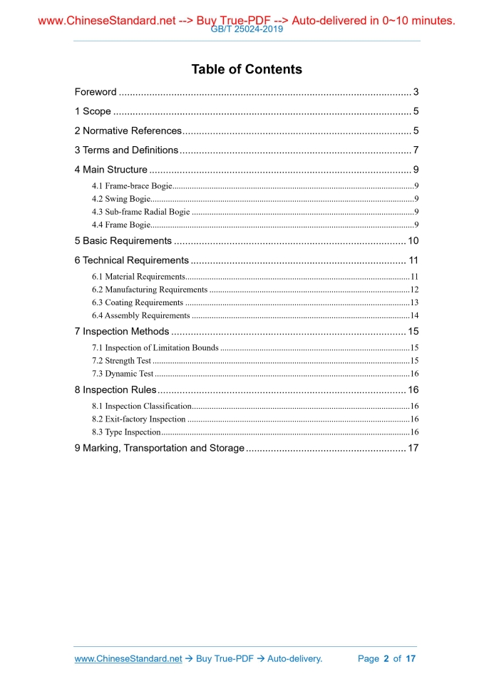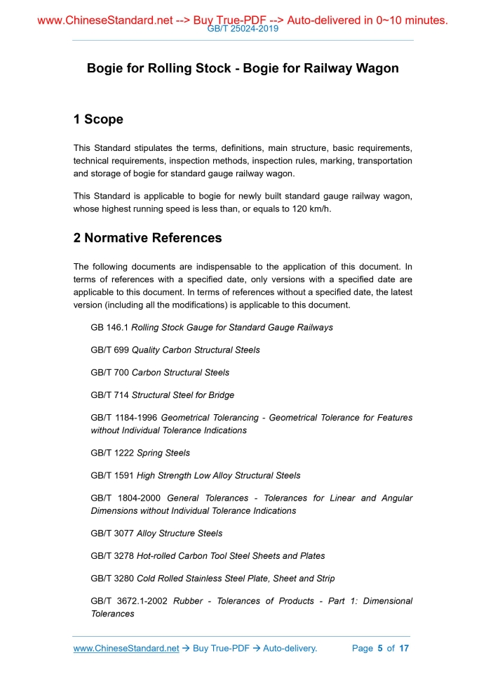 Similar standardsGB/T 25024-2019: Bogie for Rolling Stock - Bogie for Railway Wagon---This is an excerpt. Full copy of true-PDF in English version (including equations, symbols, images, flow-chart, tables, and figures etc.), auto-downloaded/delivered in 9 seconds, can be purchased online: https://www.ChineseStandard.net/PDF.aspx/GBT25024-2019NATIONAL STANDARD OF THE PEOPLE’S REPUBLIC OF CHINA ICS 45.060.01 S 36 Replacing GB/T 25024-2010 Bogie for Rolling Stock - Bogie for Railway Wagon ISSUED ON: MAY 10, 2019 IMPLEMENTED ON: DECEMBER 1, 2019 Issued by: State Administration for Market Regulation; Standardization Administration of the People’s Republic of China. Table of ContentsForeword ... 3 1 Scope ... 5 2 Normative References ... 5 3 Terms and Definitions ... 7 4 Main Structure ... 9 4.1 Frame-brace Bogie ... 9 4.2 Swing Bogie ... 9 4.3 Sub-frame Radial Bogie ... 9 4.4 Frame Bogie ... 9 5 Basic Requirements ... 10 6 Technical Requirements ... 11 6.1 Material Requirements ... 11 6.2 Manufacturing Requirements ... 12 6.3 Coating Requirements ... 13 6.4 Assembly Requirements ... 14 7 Inspection Methods ... 15 7.1 Inspection of Limitation Bounds ... 15 7.2 Strength Test ... 15 7.3 Dynamic Test ... 16 8 Inspection Rules ... 16 8.1 Inspection Classification ... 16 8.2 Exit-factory Inspection ... 16 8.3 Type Inspection ... 16 9 Marking, Transportation and Storage ... 17 Bogie for Rolling Stock - Bogie for Railway Wagon1 ScopeThis Standard stipulates the terms, definitions, main structure, basic requirements, technical requirements, inspection methods, inspection rules, marking, transportation and storage of bogie for standard gauge railway wagon. This Standard is applicable to bogie for newly built standard gauge railway wagon, whose highest running speed is less than, or equals to 120 km/h.2 Normative ReferencesThe following documents are indispensable to the application of this document. In terms of references with a specified date, only versions with a specified date are applicable to this document. In terms of references without a specified date, the latest version (including all the modifications) is applicable to this document. GB 146.1 Rolling Stock Gauge for Standard Gauge Railways GB/T 699 Quality Carbon Structural Steels GB/T 700 Carbon Structural Steels GB/T 714 Structural Steel for Bridge GB/T 1184-1996 Geometrical Tolerancing - Geometrical Tolerance for Features without Individual Tolerance Indications GB/T 1222 Spring Steels GB/T 1591 High Strength Low Alloy Structural Steels GB/T 1804-2000 General Tolerances - Tolerances for Linear and Angular Dimensions without Individual Tolerance Indications GB/T 3077 Alloy Structure Steels GB/T 3278 Hot-rolled Carbon Tool Steel Sheets and Plates GB/T 3280 Cold Rolled Stainless Steel Plate, Sheet and Strip GB/T 3672.1-2002 Rubber - Tolerances of Products - Part 1: Dimensional Tolerances TB/T 1979 Atmospheric Corrosion Resisting Steel for Railway Rolling Stock TB/T 2211 Steel Helical Spring of Suspension Mechanism for Rolling Stock TB/T 2235 Rolling Bearing in the Railway Passenger Car and Wagon TB/T 2403 Brake Shoes for Freight Rolling Stock of Railways TB/T 2429 Technical Condition of Foundation Brake Gear Used in Railway Truck Bogie TB/T 2813 Friction Damper Wedge for Freight Car TB/T 2817 Technical Specification of Wrought Steel Solid Wheel for Railway Freight Car TB/T 2843 General Technical Requirement for Rolling Stock Rubber to Metal Parts TB/T 2911 General Technical Specification of Riveting Process for Railway Vehicle TB/T 2942 General Technical Specifications of Steel Castings for Rolling Stock TB/T 2944 Carbon Steel Forgings for Railway TB/T 2945 Technical Specification for LZ50 Steel Shaft and Steel Billet for Railway Vehicle TB/T 3012 Specification of Cast Steel Bolster and Side Frame for Railway Freight Car TB/T 3014 Alloy Steel Forgings for Railway TB/T 3225 Cross Bar Composition for Railway Freight Car TB/T 3267 Adapter on Railway Freight Car TB/T 3269 Elastic Side Bearings for Railway Freight Wagons TB/T 3270 Center Wear Plate of Railway Freight Wagons3 Terms and DefinitionsWhat is defined in GB/T 4549.2-2004, and the following terms and definitions are applicable to this document. 3.1 Frame-brace Bogie Frame-brace bogie refers to three-piece cast steel bogie, which implements elastic Frame bogie refers to a running gear, which generally sets up components like wheelsets axle box device, suspension damping device and foundation brake gear; adopts bogie frame as the installation foundation of various components; bears vehicle body and loading weight; rotates in relative to the vehicle body. NOTE: definition 2.17 in GB/T 4549.2-2004 is modified. 3.10 Bogie Frame Bogie frame refers to a basic bearing structure, which is between the primary and secondary suspension device, and implements the transmission of force from vehicle body to wheel and axle. NOTE: definition 3.1 in GB/T 4549.2-2004 is modified.4 Main Structure4.1 Frame-brace Bogie Frame-brace bogie belongs to three-piece cast steel bogie. It is mainly constituted of adapter, elastic positioning member, wheel and axle, side frame, central spring suspension device, swing bolster, basic braking device, frame-brace device and elastic side bearing, etc. In accordance with difference in the location of frame-brace device and swing bolster, frame-brace bogie can be divided into lower frame-brace bogie and central frame-brace bogie. 4.2 Swing Bogie Swing bogie belongs to three-piece cast steel bogie. It is mainly constituted of adapter, pedestal rocker seat (primary elastic swing device), wheel and axle, side frame, central spring suspension device, swing bolster, spring plank, rocker seat, rocker seat bearing, foundation brake gear and elastic side bearing, etc. 4.3 Sub-frame Radial Bogie Sub-frame radial bogie refers to three-piece self-guided radial bogie. It is mainly constituted of wheel and axle, side frame, central spring suspension device, swing bolster, foundation br