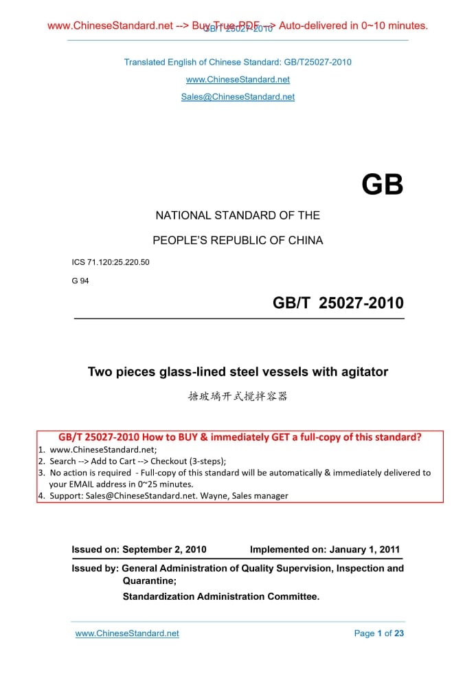 GB/T 25027-2010: Two pieces glass-lined steel vessels with agitator Delivery: 9 seconds. True-PDF full-copy in English & invoice will be downloaded + auto-delivered via email. See step-by-step procedure Status: Obsolete GB/T 25027: Historical versions