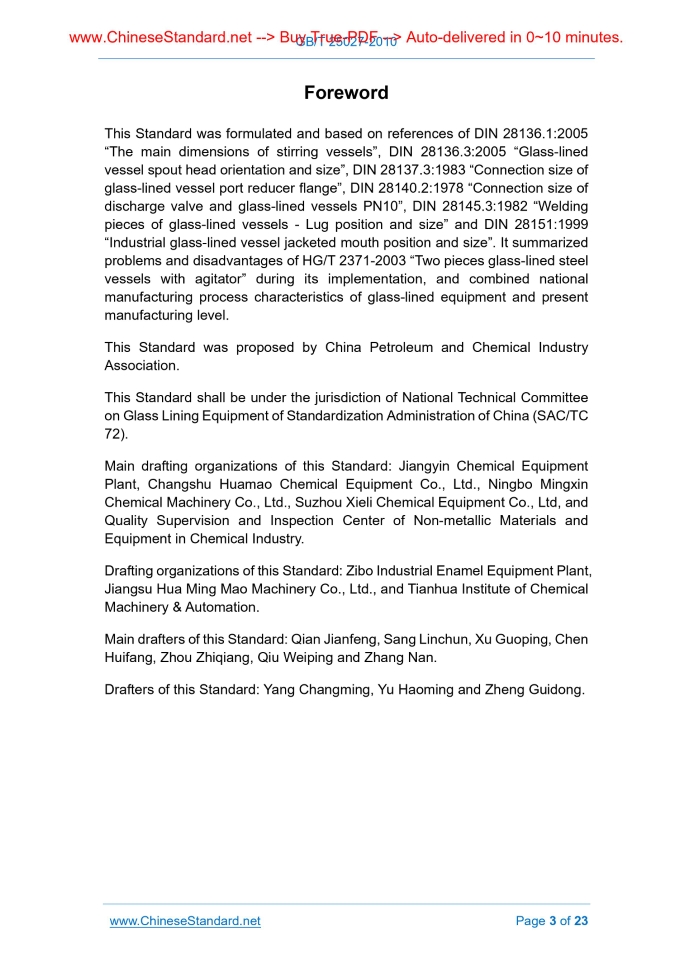 Similar standardsGB/T 25027-2010: Two pieces glass-lined steel vessels with agitator---This is an excerpt. Full copy of true-PDF in English version (including equations, symbols, images, flow-chart, tables, and figures etc.), auto-downloaded/delivered in 9 seconds, can be purchased online: https://www.ChineseStandard.net/PDF.aspx/GBT25027-2010GB NATIONAL STANDARD OF THE PEOPLE’S REPUBLIC OF CHINA ICS 71.120.25.220.50 G 94 Two pieces glass-lined steel vessels with agitator Issued on: SEPTEMBER 2, 2010 Implemented on: JANUARY 1, 2011 Issued by. General Administration of Quality Supervision, Inspection and Quarantine; Standardization Administration Committee. Table of ContentsForeword... 3 1 Scope... 4 2 Normative references... 4 3 Terms and definitions... 5 4 Basic parameters and main dimensions... 6 5 Models and technical characteristics... 6 6 Technical requirements... 22 7 Exit-factory documents, packaging, transport and storage... 23ForewordThis Standard was formulated and based on references of DIN 28136.1.2005 “The main dimensions of stirring vessels”, DIN 28136.3.2005 “Glass-lined vessel spout head orientation and size”, DIN 28137.3.1983 “Connection size of glass-lined vessel port reducer flange”, DIN 28140.2.1978 “Connection size of discharge valve and glass-lined vessels PN10”, DIN 28145.3.1982 “Welding pieces of glass-lined vessels - Lug position and size” and DIN 28151.1999 “Industrial glass-lined vessel jacketed mouth position and size”. It summarized problems and disadvantages of HG/T 2371-2003 “Two pieces glass-lined steel vessels with agitator” during its implementation, and combined national manufacturing process characteristics of glass-lined equipment and present manufacturing level. This Standard was proposed by China Petroleum and Chemical Industry Association. This Standard shall be under the jurisdiction of National Technical Committee on Glass Lining Equipment of Standardization Administration of China (SAC/TC 72). Main drafting organizations of this Standard. Jiangyin Chemical Equipment Plant, Changshu Huamao Chemical Equipment Co., Ltd., Ningbo Mingxin Chemical Machinery Co., Ltd., Suzhou Xieli Chemical Equipment Co., Ltd, and Quality Supervision and Inspection Center of Non-metallic Materials and Equipment in Chemical Industry. Drafting organizations of this Standard. Zibo Industrial Enamel Equipment Plant, Jiangsu Hua Ming Mao Machinery Co., Ltd., and Tianhua Institute of Chemical Machinery & Automation. Main drafters of this Standard. Qian Jianfeng, Sang Linchun, Xu Guoping, Chen Huifang, Zhou Zhiqiang, Qiu Weiping and Zhang Nan. Drafters of this Standard. Yang Changming, Yu Haoming and Zheng Guidong. Two pieces glass-lined steel vessels with agitator1 ScopeThis Standard specifies the terms and definitions, basic parameters and the main dimensions, models and technical characteristics, technical requirements and factory documents, packaging, transportation and storage of two pieces glass-lined steel vessels with agitator. This Standard is applicable to two pieces glass-lined steel vessels with agitator, of which the designed pressure of inner vessel is less than or equals to 1.0 MPa, nominal volume is greater than or equals to 50 L, less than or equals to 5000 L, designed pressure in U-type jacket is less than or equals to 0.6 MPa, and designed temperature of inner vessel and jacket is higher than -20°C~200°C.2 Normative referencesThe following standards contain the provisions which, through reference in this Standard, constitute the provisions of this Standard. For dated references, subsequent amendments (excluding corrections) or revisions do not apply to this Standard. However, the parties who enter into agreement based on this Standard are encouraged to investigate whether the latest versions of these documents are applicable. For undated reference documents, the latest versions apply to this Standard. GB 25025 Specification of glass-lined equipment for industry HG/T 2048 Glass-lined stuffing boxes HG/T 2049 Glass-lined Equipment H Flange HG/T 2050 Gaskets for Glass-lined Steel Vessel HG/T 2051 Glass-lined Agitator HG/T 2052 Drive for Glass-lined Steel Vessel with Agitator HG/T 2054 Clamps for glass lined vessels HG/T 2055 Glass-lined Manhole HG/T 2057 Mechanical seals for glass lined vessel HG/T 2058 Glass Lined Vessel Parameter HG/T 2143 Welding Neck for Glass Lined Steel Vessel HG/T 2145 Hand Hole for Glass Lined Equipment HG/T 3217 Glass lined-life up valves HG/T 3218 Glass lined-life down valves HG/T 20592 Steel pipe flanges and model parameters JB/T 4712.3 Vessel supports - Part 3.Lug support JB/T 4712.4 Vessel supports - Part 4.Bracket support JB/T 4746 Formed Heads for Steel Pressure Vessels3 Terms and definitionsThe following terms and definitions apply to this Standard. 3.1 Two pieces glass-lined steel vessels with agitator The glass-lined steel vessels with agitator of which the high-neck flange is set on cylinder and has equal diameter with cylinder. The code is K and the structure is shown in Figure 1. 3.2 Capacity for under equipment flange The capacity that is below high-neck flange. 7 HG/T 2050 Glass-lined equipment Gasket 1 Assembly 8 HG/T 2054 Glass-lined equipment Clip Shown in Table 8 Assembly 9 HG/T 2051 Glass-lined agitator 1 Assembly Carbon steel and glass-lined steel HG/T 3217 Glass lined-life up valves 1 Assembly HG/T 3218 Glass lined-life down valves 1 Assembly Table 3 Technical characteristics Nominal volume VN/L 50 100 200 300 400 500 800 Nominal diameter d1/mm L Series - - - - 800 900 1000 S Series 500 600 700 800 - - - Capacity for under equipment flange VJ/L 70 127 247 369 469 588 878 Full volume VT/L 101 179 324 483 583 744 1082 Jacket heat transfer area /m2 0.54 0.84 1.50 1.90 2.40 2.60 3.70 Designed pressure /MPa Inner vessel. 0.25, 0.60, 1.0; Jacket. 0.60 Designed temperature /°C Inner vessel. 0~200, > -20~200; Jacket. 0~200, > -20~200 Agitator shaft nominal diameter dn/mm 40 50 65 Motor pow