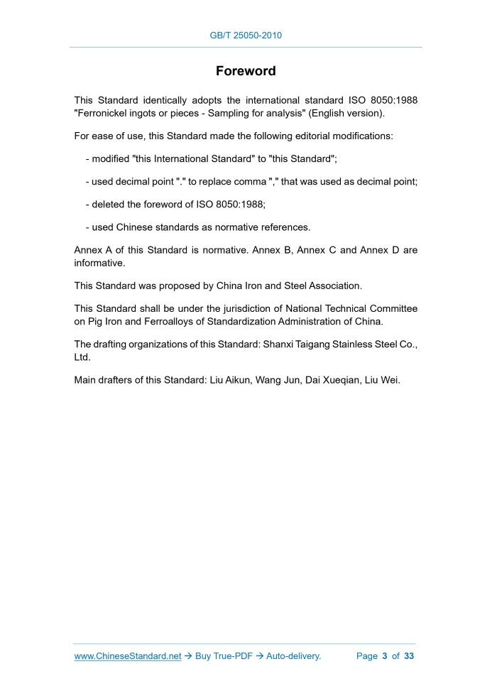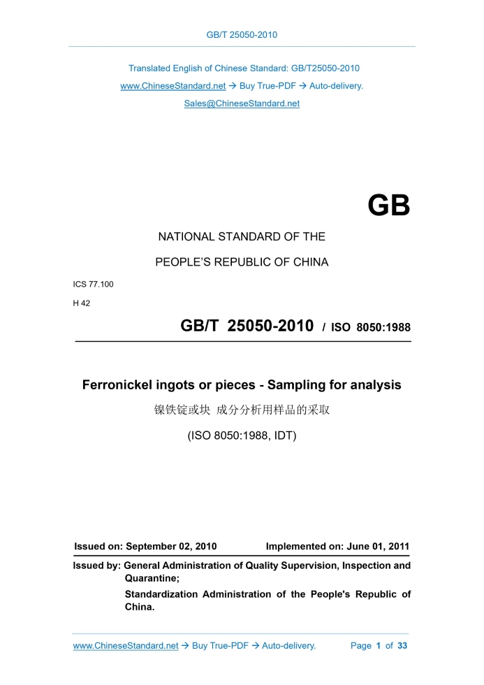 GB/T 25050-2010: Ferronickel ingots or pieces -- Sampling for analysis Delivery: 9 seconds. True-PDF full-copy in English & invoice will be downloaded + auto-delivered via email. See step-by-step procedure Status: Valid
