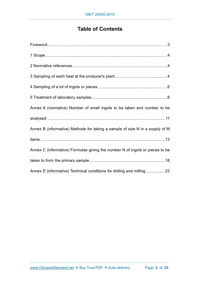 Similar standardsGB/T 25050-2010: Ferronickel ingots or pieces -- Sampling for analysis---This is an excerpt. Full copy of true-PDF in English version (including equations, symbols, images, flow-chart, tables, and figures etc.), auto-downloaded/delivered in 9 seconds, can be purchased online: https://www.ChineseStandard.net/PDF.aspx/GBT25050-2010GB NATIONAL STANDARD OF THE PEOPLE’S REPUBLIC OF CHINA ICS 77.100 H 42 GB/T 25050-2010 / ISO 8050:1988 Ferronickel ingots or pieces - Sampling for analysis (ISO 8050:1988, IDT) ISSUED ON: SEPTEMBER 02, 2010 IMPLEMENTED ON: JUNE 01, 2011 Issued by: General Administration of Quality Supervision, Inspection and Quarantine; Standardization Administration of the People's Republic of China. Table of ContentsForeword ... 3 1 Scope ... 4 2 Normative references ... 4 3 Sampling of each heat at the producer's plant ... 4 4 Sampling of a lot of ingots or pieces ... 6 5 Treatment of laboratory samples ... 8 Annex A (normative) Number of small ingots to be taken and number to be analysed ... 11 Annex B (informative) Methods for taking a sample of size N in a supply of M items ... 13 Annex C (informative) Formulae giving the number N of ingots or pieces to be taken to form the primary sample ... 18 Annex D (informative) Technical conditions for drilling and milling ... 23ForewordThis Standard identically adopts the international standard ISO 8050:1988 "Ferronickel ingots or pieces - Sampling for analysis" (English version). For ease of use, this Standard made the following editorial modifications: - modified "this International Standard" to "this Standard"; - used decimal point "." to replace comma "," that was used as decimal point; - deleted the foreword of ISO 8050:1988; - used Chinese standards as normative references. Annex A of this Standard is normative. Annex B, Annex C and Annex D are informative. This Standard was proposed by China Iron and Steel Association. This Standard shall be under the jurisdiction of National Technical Committee on Pig Iron and Ferroalloys of Standardization Administration of China. The drafting organizations of this Standard: Shanxi Taigang Stainless Steel Co., Ltd. Main drafters of this Standard: Liu Aikun, Wang Jun, Dai Xueqian, Liu Wei. Ferronickel ingots or pieces - Sampling for analysis1 ScopeThis Standard specifies a method for sampling for analysis of ferronickel ingots or pieces. This Standard is applicable to sampling for analysis of ferronickel ingots or pieces,2 Normative referencesThe provisions in following documents become the provisions of this Standard through reference in this Standard. For dated references, the subsequent amendments (excluding corrigendum) or revisions do not apply to this Standard, however, parties who reach an agreement based on this Standard are encouraged to study if the latest versions of these documents are applicable. For undated references, the latest edition of the referenced document applies. GB/T 21933.1, Ferronickel - Determination of nickel content - The dimethylglyoxime gravimetric method (GB/T 21933.1-2008, ISO 6352: 1985, IDT) GB/T 25049, Ferronickel (GB/T 25049-2010, ISO 6501: 1988, MOD)3 Sampling of each heat at the producer's plant3.1 Sample taking 3.1.1 Each increment1) shall be taken using a spoon and cast in a mould to obtain a suitable small ingot for chemical or physical analysis. The usual geometry of such ingots is that of a frustum. It is desirable that the dimensions lie within the following limits: - height: 100 ~ 140 mm; - upper diameter: 35 ~ 50 mm; - lower diameter: 30 ~ 40 mm. 1) Increment: portion of the lot taken in a single operation; in this standard: portion of molten metal. ......Source: Above contents are excerpted from the full-copy PDF -- translated/reviewed by: www.ChineseStandard.net / Wayne Zheng et al. Tips & Frequently Asked Questions:Question 1: How long will the true-PDF of English version of GB/T 25050-2010 be delivered?Answer: The full copy PDF of English version of GB/T 25050-2010 can be downloaded in 9 seconds, and it will also be emailed to you in 9 seconds (double mechanisms to ensure the delivery reliably), with PDF-invoice.Question 2: Can I share the purchased PDF of GB/T 25050-2010_English with my colleagues?Answer: Yes. The purchased PDF of GB/T 25050-2010_English will be deemed to be sold to your employer/organization who actually paid for it, including your colleagues and your employer's intranet.Question 3: Does the price include tax/VAT?Answer: Yes. Our tax invoice, downloaded/delivered in 9 seconds, includes all tax/VAT and complies with 100+ countries' tax regulations (tax exempted in 100+ countries) -- See Avoidance of Double Taxation Agreements (DTAs): List of DTAs signed between Singapore and 100+ countriesQuestion 4: Do you accept my currency other than USD?Answer: Yes. www.ChineseStandard.us -- GB/T 25050-2010 -- Click this link and select your country/currency to pay, the exact amount in your currency will be printed on the invoice. Full PDF will also be downloaded/emailed in 9 seconds.How to buy and download a true PDF of English version of GB/T 25050-2010?A step-by-step guide to download PDF of GB/T 25050-2010_EnglishStep 1: Visit website https://www.ChineseStandard.net (Pay in USD), or https://www.ChineseStandard.us (Pay in any currencies such as Euro, KRW, JPY, AUD).Step 2: Search keyword "GB/T 25050-2010". Step 3: Click "Add to Cart". If multiple PDFs are required, repeat steps 2 and 3 to add up to 12 PDFs to cart. Step 4: Select payment option (Via payment agents Stripe or PayPal). Step 5: Customize Tax Invoice -- Fill up your email etc. Step 6: Click "Checkout". Step 7: Make payment by credit card, PayPal, Google Pay etc. After the payment is completed and in 9 seconds, you will receive 2 emails attached with the purchased PDFs and PDF-invoice, respectively. Step 8: Optional -- Go to download PDF. Step 9: Optional -- Click Open/Download PDF to download PDFs and invoice. See screenshots for above steps: Steps 1~3 