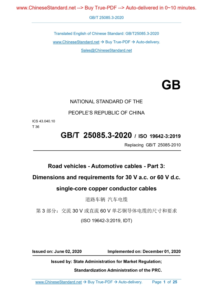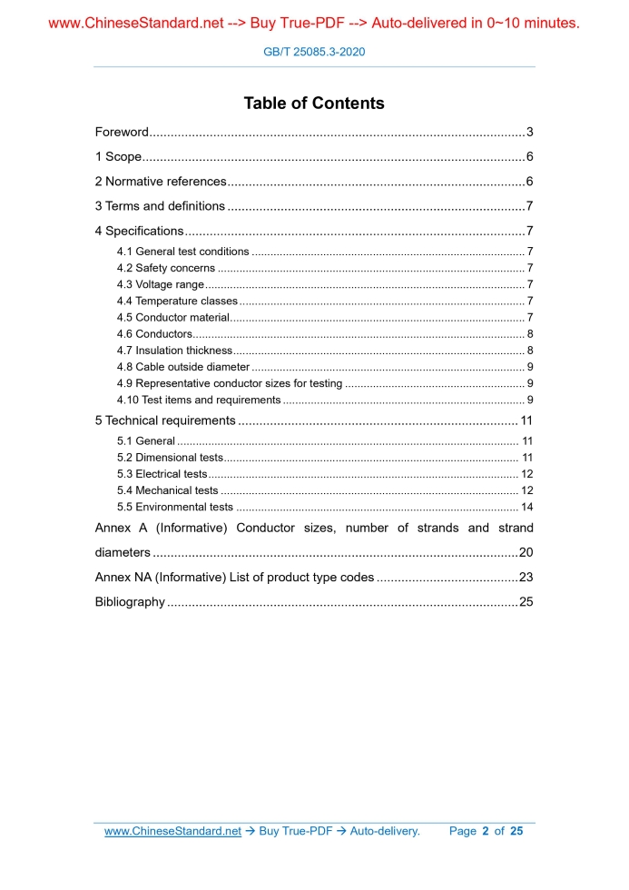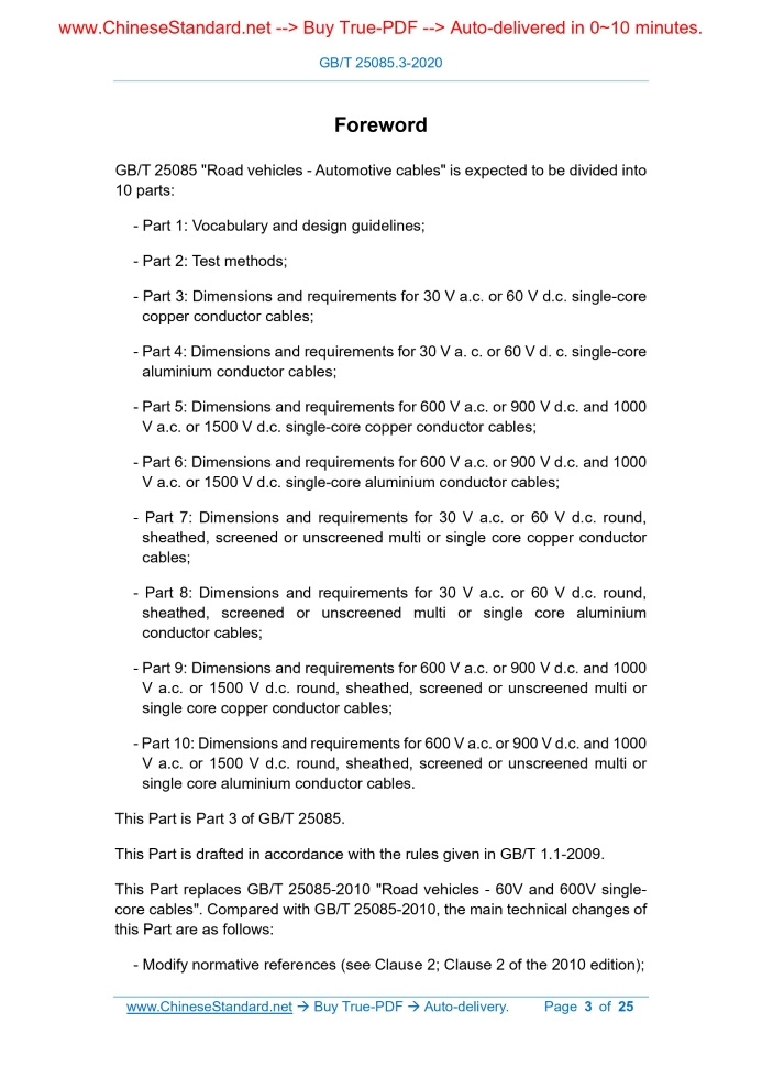 Similar standardsGB/T 25085.3-2020: Road vehicles--Automotive cables - Part 3: Dimensions and requirements for 30 V a. c. or 60 V d. c. single-core copper conductor cables---This is an excerpt. Full copy of true-PDF in English version (including equations, symbols, images, flow-chart, tables, and figures etc.), auto-downloaded/delivered in 9 seconds, can be purchased online: https://www.ChineseStandard.net/PDF.aspx/GBT25085.3-2020 Road vehicles--Automotive cables--Part 3.Dimensions and requirements for 30 V acor 60 V dcsingle-core copper conductor cables ICS 43.040.10 T36 National Standards of People's Republic of China Replace GB/T 25085-2010 Road vehicle car cable Part 3.AC 30V or DC 60V Dimensions and requirements of single-core copper conductor cables 2020-06-02 released 2020-12-01 implementation State Administration for Market Regulation Issued by the National Standardization Management Committee Table of ContentsPreface Ⅲ 1 Scope 1 2 Normative references 1 3 Terms and definitions 1 4 General requirements 1 4.1 General test conditions 1 4.2 Safety precautions 2 4.3 Voltage range 2 4.4 Temperature class 2 4.5 Conductor material 2 4.6 Conductor 2 4.7 Insulation thickness 2 4.8 Cable outer diameter 3 4.9 Representative conductor specifications for test 3 4.10 Test items and requirements 3 5 Technical requirements 5 5.1 General 5 5.2 Dimension check 5 5.3 Electrical performance test 5 5.4 Mechanical performance test 6 5.5 Environmental test 7 Appendix A (informative appendix) Conductor specifications, number of filaments and filament diameter 12 Appendix NA (informative appendix) Product model list 15 Reference 16 Preface GB/T 25085 "Road Vehicle Automotive Cable" is expected to be divided into 10 parts. ---Part 1.Vocabulary and design guidelines; ---Part 2.Test method; ---Part 3.Dimensions and requirements for AC 30V or DC 60V single-core copper conductor cables; ---Part 4.AC 30V or DC 60V single-core aluminum conductor cable size and requirements; ---Part 5.Dimensions and dimensions of AC 600V or DC 900V, AC 1000V or DC 1500V single-core copper conductor cables Claim; ---Part 6.Dimensions and dimensions of AC 600V or DC 900V, AC 1000V or DC 1500V single-core aluminum conductor cables Claim; ---Part 7.Dimensions and dimensions of shielded and unshielded multi-core and single-core copper conductor cables with AC 30V or DC 60V round sheath Claim; ---Part 8.Dimensions and dimensions of shielded and unshielded multi-core and single-core aluminum conductor cables with AC 30V or DC 60V round sheath Claim; ---Part 9.Shielded and unshielded round sheaths of AC 600V or DC 900V, AC 1000V or DC 1500V The size and requirements of multi-core and single-core copper conductor cables; ---Part 10.Shielded and unshielded round sheaths of AC 600V or DC 900V, AC 1000V or DC 1500V The size and requirements of multi-core and single-core aluminum conductor cables. This part is Part 3 of GB/T 25085. This section was drafted in accordance with the rules given in GB/T 1.1-2009. This part replaces GB/T 25085-2010 "Road vehicles 60V and 600V single-core wires", and is similar to GB/T 25085-2010 The main technical changes are as follows. ---Modified normative reference documents (see Chapter 2, Chapter 2 of the.2010 edition); ---The cross-sectional area test content for dimensional inspection has been added (see 5.2.4); ---Added the cable outer diameter test content in the manufacturing process of dimensional inspection (see 5.2.5); ---Added the temperature coefficient test content in the electrical performance test (see 5.3.2); ---Added the content of withstand voltage test after environmental test in the electrical performance test (see 5.3.4); ---Added the test content of the finished cable breaking force in the mechanical performance test (see 5.4.3); ---Added the contents of the cyclic bending test conditions in the mechanical performance test (see 5.4.4); ---Added the flexibility test content in the mechanical performance test (see 5.4.5); ---The content of stress crack resistance test in environmental test has been added (see 5.5.13). The translation method used in this part is equivalent to the adoption of ISO 19642-3.2019 ``Road vehicles and automotive cables Part 3.AC 30V or direct Dimensions and requirements for 60V single-core copper conductor cables. This section has made the following editorial changes. ---Moved the warning of ISO 19642-3.2019 to 4.2 of this part; --- Use "√" instead of "×" (see Table 2); --- Use "加" instead of "" (see Table 2, 5.5.3, 5.5.4); --- Use "-" instead of "×" (see Table 3, Table 5, Table 7, Table A.1); --- A note has been added, giving reference information about relevant domestic standards (see note 2 in Table 1); ---Added informative appendix NA "Product Model List". ---Revised references. This part was proposed by the Ministry of Industry and Information Technology of the People's Republic of China. This part is under the jurisdiction of the National Automotive Standardization Technical Committee (SAC/TC114). Drafting organizations of this section. Shanghai Fuerxin Wire & Cable Co., Ltd., Changsha Automobile Electric Research Institute, FAW Jiefang Automobile Co., Ltd., Great Wall Motor Automobile Co., Ltd., Geely Automobile Research Institute (Ningbo) Co., Ltd., SAIC Volkswagen Co., Ltd., Changchun Bulb & Wire Co., Ltd., Mande Electronic Appliance Co., Ltd. Baoding Xushui Electric System Branch, Sichuan Fanhua Electric Co., Ltd., Henan Tianhai Electric Co., Ltd. the company. The main drafters of this section. Wang Yadong, Li Guoyu, Huo Tianyu, Hu Mengjiao, Li Weiyang, Li Guohui, Wang Sufeng, Zhang Guangyong, Wang Yanwen, Zhang Jie, Zhai Zhixin, Lu Yong, Wang Rongxi, Chen Lingling, Li Qingsen. The previous versions of the standards replaced by this part are as follows. ---GB/T 25085-2010. Road vehicle car cable Part 3.AC 30V or DC 60V Dimensions and requirements of single-core copper conductor cables 1 Scope This part of GB/T 25085 specifies that the nominal syst