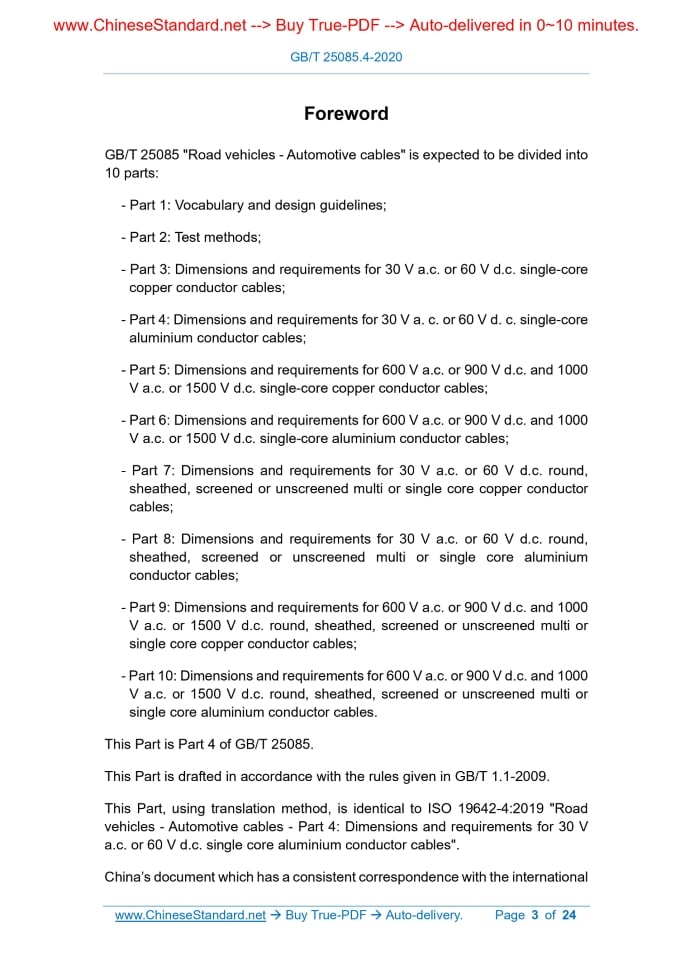 Similar standardsGB/T 25085.4-2020: Road vehicles--Automotive cables - Part 4: Dimensions and requirements for 30 V a. c. or 60 V d. c. single-core aluminium conductor cables---This is an excerpt. Full copy of true-PDF in English version (including equations, symbols, images, flow-chart, tables, and figures etc.), auto-downloaded/delivered in 9 seconds, can be purchased online: https://www.ChineseStandard.net/PDF.aspx/GBT25085.4-2020 Road vehicles - Automotive cables - Part 4.Dimensions and requirements for 30V acor 60V dcsingle-core aluminium conductor cables ICS 43.040.10 T36 National Standards of People's Republic of China Road vehicles and automotive cables. Part 4.Dimensions and requirements of AC 30V or DC 60V single-core aluminum conductor cables 2020-07-21 released 2021-02-01 implementation State Administration for Market Regulation Issued by the National Standardization Management Committee Table of ContentsPreface Ⅲ 1 Scope 1 2 Normative references 1 3 Terms and definitions 1 4 General requirements 1 4.1 General test conditions 1 4.2 Safety precautions 2 4.3 Voltage range 2 4.4 Temperature class 2 4.5 Conductor material 2 4.6 Conductor 3 4.7 Insulation thickness 3 4.8 Cable outer diameter 3 4.9 Representative conductor specifications for test 3 4.10 Test items and requirements 3 5 Technical requirements 5 5.1 General 5 5.2 Dimension check 5 5.3 Electrical performance test 6 5.4 Mechanical performance test 6 5.5 Environmental test 8 Appendix A (informative appendix) Conductor specifications, number of filaments and filament diameter 12 Appendix NA (informative appendix) Product model list 15 Reference 16 Preface GB/T 25085 "Road Vehicle Automotive Cable" is expected to be divided into 10 parts. ---Part 1.Vocabulary and design guide; ---Part 2.Test method; ---Part 3.Dimensions and requirements of AC 30V or DC 60V single-core copper conductor cables; ---Part 4.AC 30V or DC 60V single core aluminum conductor cable size and requirements; ---Part 5.Dimensions and requirements of AC 600V or DC 900V, AC 1000V or DC 1500V single-core copper conductor cables; ---Part 6.Dimensions and dimensions of AC 600V or DC 900V, AC 1000V or DC 1500V single-core aluminum conductor cables Claim; ---Part 7.Dimension and size of shielded and unshielded multi-core and single-core copper conductor cables with AC 30V or DC 60V round sheath Claim; ---Part 8.Dimensions and dimensions of shielded and unshielded multi-core and single-core aluminum conductor cables with AC 30V or DC 60V round sheath Claim; ---Part 9.Shielded and unshielded for AC 600V or DC 900V, AC 1000V or DC 1500V circular sheath The size and requirements of multi-core and single-core copper conductor cables; ---Part 10.Shielded and unshielded round sheaths of AC 600V or DC 900V, AC 1000V or DC 1500V The size and requirements of multi-core and single-core aluminum conductor cables. This part is Part 4 of GB/T 25085. This section was drafted in accordance with the rules given in GB/T 1.1-2009. The translation method used in this part is equivalent to the adoption of ISO 19642-4.2019 ``Road vehicles and automotive cables Part 4.AC 30V or direct Dimensions and requirements of 60V single-core aluminum conductor cable. The Chinese documents that have a consistent correspondence with the international documents cited in this section are as follows. ---GB/T 228.1-2010 Tensile Test of Metallic Materials Part 1.Room Temperature Test Method (ISO 6892-1.2009, MOD) This section has made the following editorial changes. ---Moved the warning of ISO 19642-4.2019 to 4.2 of this part; --- Use "√" instead of "×" (see Table 3); --- Use "plus" instead of "" (see Table 3, 5.5.3, 5.5.4); --- Replace "×" with "-" (see Table 4, Table 6, Table 7, Table 8, Table A.1, Table A.2); ---Added some notes, giving reference information about relevant domestic standards (see 4.5 note 2, footnote a in Table 2); ---Added informative appendix NA "Product Model List"; ---Revised references. This part was proposed by the Ministry of Industry and Information Technology of the People's Republic of China. This part is under the jurisdiction of the National Automotive Standardization Technical Committee (SAC/TC114). Drafting organizations of this section. Shanghai Fuerxin Wire & Cable Co., Ltd., Changsha Automobile Electric Research Institute, FAW Jiefang Automobile Co., Ltd., Great Wall Motors Co., Ltd., Geely Automobile Research Institute (Ningbo) Co., Ltd., SAIC Volkswagen Co., Ltd., Changchun Bulb & Wire Co., Ltd., Mande Electronic Appliance Co., Ltd. Baoding Xushui Electric System Branch, Sichuan Fanhua Electric Co., Ltd., Henan Tianhai Electric Co., Ltd. The main drafters of this section. Wang Yadong, Li Guoyu, Huo Tianyu, Hu Mengjiao, Li Weiyang, Li Guohui, Wang Sufeng, Zhang Guangyong, Wang Yanwen, Zhang Jie, Zhai Zhixin, Lu Yong, Wang Rongxi, Chen Lingling, Li Qingsen. Road vehicles automotive cables part 4. AC 30V or DC 60V single core Dimensions and requirements of aluminum conductor cables 1 Scope This part of GB/T 25085 specifies that the nominal system voltage for general-purpose road vehicles shall not exceed AC 30V or DC 60V. The size and requirements of core aluminum conductor cables. This section applies to single-core cables for road vehicles, as well as to cores in multi-core cables. 2 Normative references The following documents are indispensable for the quotation of this document. For dated reference documents, only the dated version applies to this article Pieces. For undated references, the latest version (including all amendments) applies to this document. 3 Terms and definitions The terms and definitions defined by ISO 19642-1 apply to this document. 4 General requirements 4.1 General test conditions Should be tested in accordance with the provisions of Table 3 under the test conditions specified in ISO 19642-2. If both parties agree to modify or change the test methods and requirements, all changes and modifications shall be recorded. 4.2 Safety precau