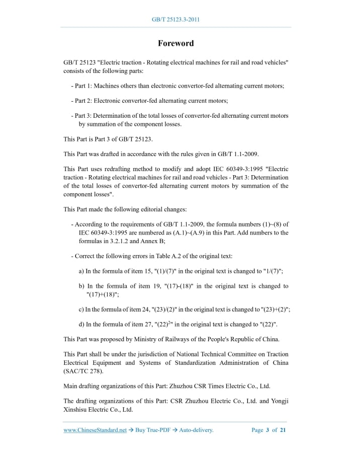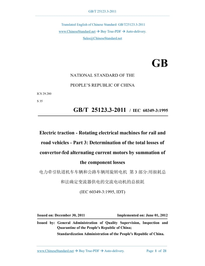 GB/T 25123.3-2011: Electric traction -- Rotating electrical machines for rail and road vehicles -- Part 3: Determination of the total losses of convertor-fed alternating current motors by summation of the component losses Delivery: 9 seconds. True-PDF full-copy in English & invoice will be downloaded + auto-delivered via email. See step-by-step procedure Status: Valid