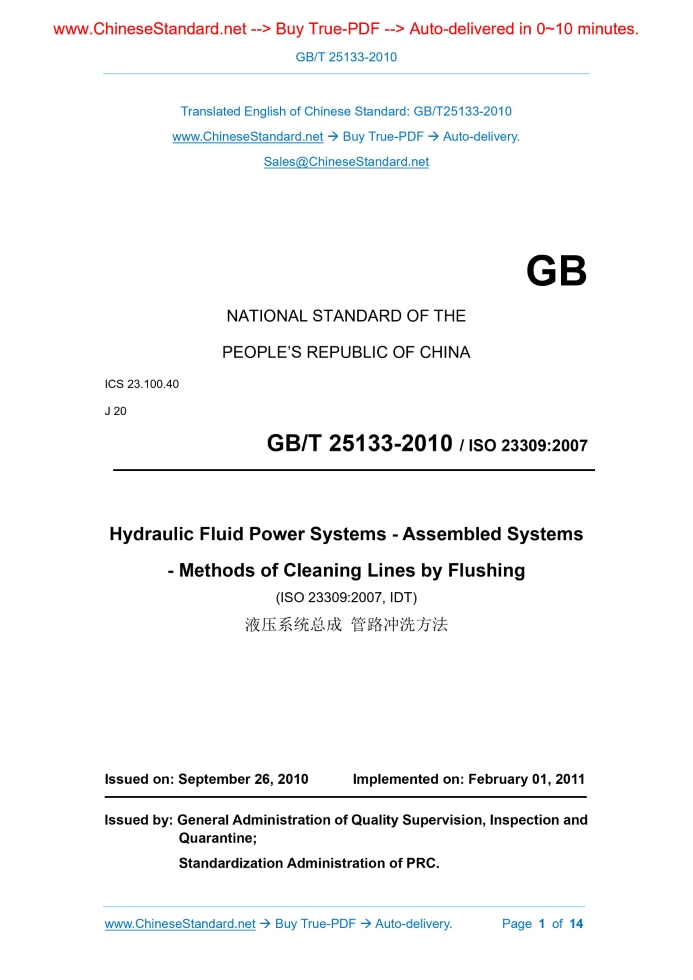 GB/T 25133-2010: Hydraulic fluid power systems -- Assembled systems -- Methods of cleaning lines by flushing Delivery: 9 seconds. True-PDF full-copy in English & invoice will be downloaded + auto-delivered via email. See step-by-step procedure Status: Valid
