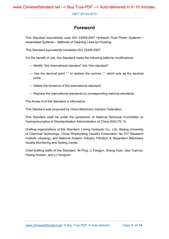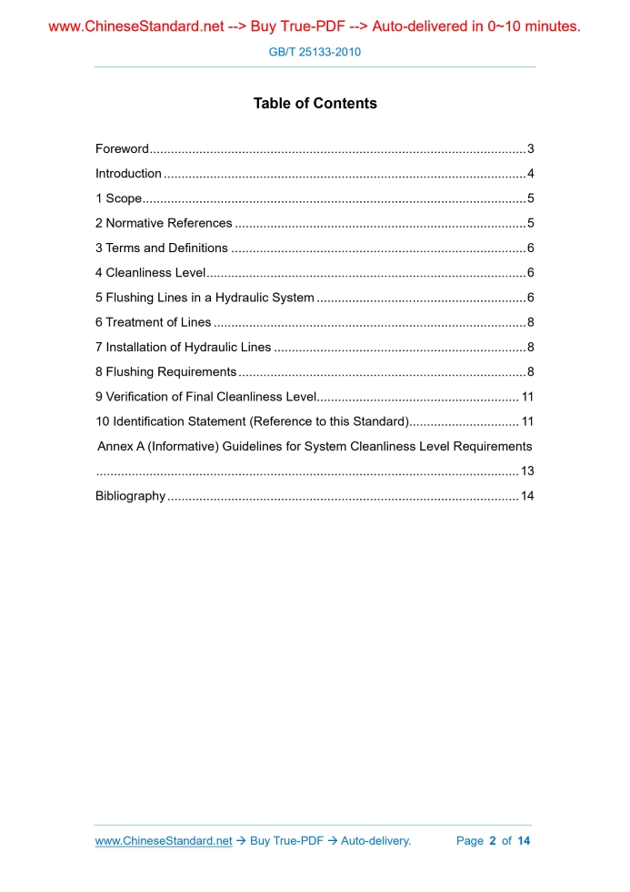 Similar standardsGB/T 25133-2010: Hydraulic fluid power systems -- Assembled systems -- Methods of cleaning lines by flushing---This is an excerpt. Full copy of true-PDF in English version (including equations, symbols, images, flow-chart, tables, and figures etc.), auto-downloaded/delivered in 9 seconds, can be purchased online: https://www.ChineseStandard.net/PDF.aspx/GBT25133-2010 Hydraulic fluid power systems.Assembled systems.Methods of cleaning lines by flushing ICS 23.100.40 J20 National Standards of People's Republic of China Hydraulic system assembly pipeline flushing method (ISO 23309.2007, IDT) Released on.2010-09-26 2011-02-01 implementation General Administration of Quality Supervision, Inspection and Quarantine of the People's Republic of China China National Standardization Administration issued ForewordThis standard is equivalent to ISO 23309.2007 "Hydraulic Transmission System Assembly Pipeline Flushing Method" (English version). This standard is equivalent to translation ISO 23309.2007. For ease of use, this standard has the following editorial changes. --- Change "this International Standard" to "this standard"; --- Replace the comma "," as a decimal point with the decimal symbol "."; --- Remove the preface to international standards; --- Replace the corresponding international standards with national standards. Appendix A of this standard is an informative annex. This standard was proposed by the China Machinery Industry Federation. This standard is under the jurisdiction of the National Hydraulic and Pneumatic Standardization Technical Committee (SAC/TC3). This standard was drafted. Liming Hydraulic Co., Ltd., Beijing University of Chemical Technology, China Shipbuilding Industry Corporation 707 Institute (Jiujiang), Aviation Industry Corporation Filtration and Separation Machinery Product Quality Supervision and Inspection Center. The main drafters of this standard. Ye Ping, Li Fangjun, Zheng Yuan, Gao Yuanan, Huang Huiwen, Lu Hongnan.introductionIn hydraulic drive systems, power is transferred and controlled by means of pressurized liquid in a closed circuit. The initial cleanliness level of the hydraulic system will affect the performance and service life of the system. If the system is not removed during manufacturing and assembly The resulting particulate contaminants, which circulate in the system and destroy system components. In order to reduce the probability of such damage, liquids and liquids The inner surface of the press system needs to be filtered and rinsed to the specified cleanliness level. Flushing the piping of the hydraulic system is one way to remove particulate contaminants from the system, but it is not the only way. Hydraulic system assembly pipeline flushing method1 ScopeThis standard specifies methods for flushing solid particulate contaminants in hydraulic system piping. These contaminants may be in the system of new hydraulic systems. It is brought in during the manufacturing process or during the repair and modification of the existing system. This standard supplements, but does not replace, the requirements of system suppliers and users, especially when their requirements are more stringent than those specified in this standard. This standard does not apply to the following situations. a) Chemical cleaning and pickling of hydraulic fittings. b) Cleaning of the main components of the system (see GB /Z 19848-2005). The cleanliness level inspection of the system assembly is carried out in accordance with GB /Z 20423.2 Normative referencesThe terms in the following documents become the terms of this standard by reference to this standard. All dated references, followed by all Modifications (not including errata content) or revisions do not apply to this standard, however, parties to agreements based on this standard are encouraged to study Is it possible to use the latest version of these files? For undated references, the latest edition applies to this standard. GB/T 17446 fluid drive system and component terminology (GB/T 17446-1998, idtISO 5598. 1985) GB/T 17489 Hydraulic particle contamination analysis Extract liquid samples from working system pipelines (GB/T 17489-1998, idtISO 4021. 1992) GB /Z 19848-2005 Guidelines for the achievement and control of cleanliness of hydraulic components from manufacture to installation (ISO /T R10949.2002, IDT) GB /Z 20423 Hydraulic system assembly cleanliness inspection (GB /Z 20423-2006, ISO /T S16431.2002, IDT)3 Terms and definitionsThe terms and definitions established in GB/T 17446 and the following are applicable to this standard. 3.1 Flushing The process of cleaning the hydraulic piping system, including the rinsing medium circulating in the hydraulic system piping to remove, transport and filter in processing and assembly And particulate contaminants entering the system during maintenance. 3.2 External flushing outflushing The process of freeing a sufficient volume of flushing media from the blind end of the pipe to an open vessel or bucket to remove contaminants therefrom. 3.3 Visual cleanliness visiblecleanliness The surface cleanliness of the identification can be directly visually observed without magnification. 3.4 Clean work area cleanworkarea Work area where no debris or particles are produced during work. Note. Activities such as welding, shovel, cutting, grinding or burning can produce debris or particles and are therefore not allowed in the cleaning work area.4 cleanliness levelThe primary purpose of rinsing is to achieve a system or component cleanliness level as required by the user or supplier. For unspecified cleanliness levels For the case, see the selection guide in Appendix A.5 Flushing of the pipeline in the hydraulic system5.1 Influencing factors In order to achieve a satisfactory cleanliness level for the hydraulic system piping, the following influencing factors need to be considered. a) Select components that have been cleaned in accordance with GB /Z 19848-2005; b) the ini