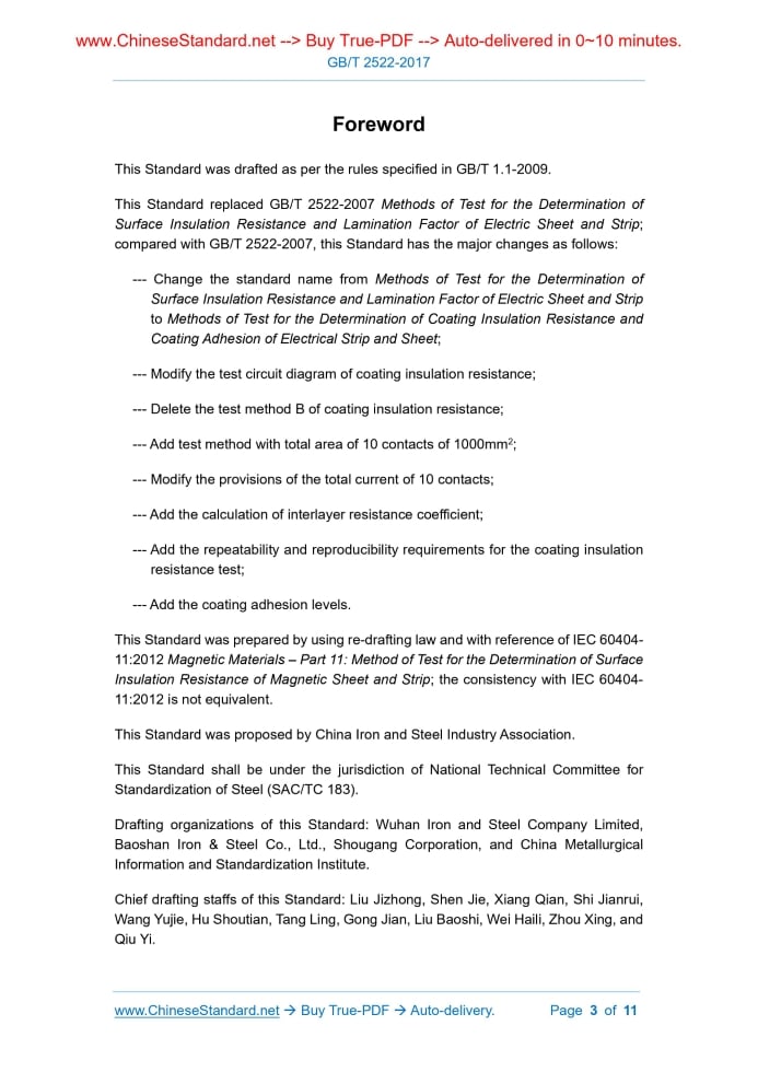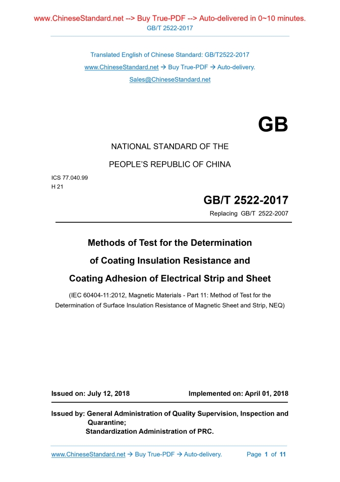 GB/T 2522-2017: Methods of test for the determination of coating insulation resistance and coating adhesion of electrical strip and sheet Delivery: 9 seconds. True-PDF full-copy in English & invoice will be downloaded + auto-delivered via email. See step-by-step procedure Status: Valid GB/T 2522: Historical versions