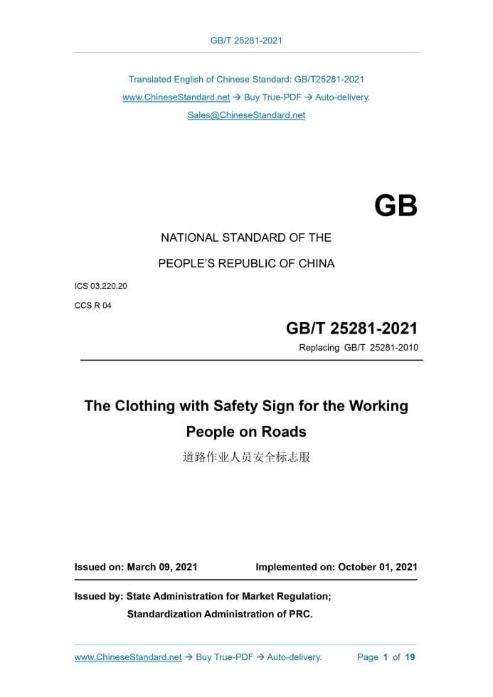 GB/T 25281-2021: The clothing with safety sign for the working people on roads Delivery: 9 seconds. True-PDF full-copy in English & invoice will be downloaded + auto-delivered via email. See step-by-step procedure Status: Valid GB/T 25281: Historical versions