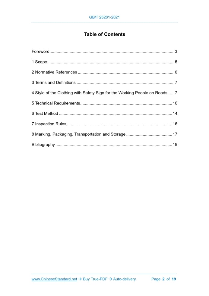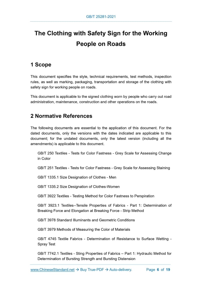 Similar standardsGB/T 25281-2021: The clothing with safety sign for the working people on roads---This is an excerpt. Full copy of true-PDF in English version (including equations, symbols, images, flow-chart, tables, and figures etc.), auto-downloaded/delivered in 9 seconds, can be purchased online: https://www.ChineseStandard.net/PDF.aspx/GBT25281-2021GB NATIONAL STANDARD OF THE PEOPLE’S REPUBLIC OF CHINA ICS 03.220.20 CCS R 04 Replacing GB/T 25281-2010 The Clothing with Safety Sign for the Working People on Roads ISSUED ON: MARCH 09, 2021 IMPLEMENTED ON: OCTOBER 01, 2021 Issued by: State Administration for Market Regulation; Standardization Administration of PRC. Table of ContentsForeword ... 3 1 Scope ... 6 2 Normative References ... 6 3 Terms and Definitions ... 7 4 Style of the Clothing with Safety Sign for the Working People on Roads ... 7 5 Technical Requirements ... 10 6 Test Method ... 14 7 Inspection Rules ... 16 8 Marking, Packaging, Transportation and Storage ... 17 Bibliography ... 19 The Clothing with Safety Sign for the Working People on Roads1 ScopeThis document specifies the style, technical requirements, test methods, inspection rules, as well as marking, packaging, transportation and storage of the clothing with safety sign for working people on roads. This document is applicable to the signed clothing worn by people who carry out road administration, maintenance, construction and other operations on the roads.2 Normative ReferencesThe following documents are essential to the application of this document. For the dated documents, only the versions with the dates indicated are applicable to this document; for the undated documents, only the latest version (including all the amendments) is applicable to this document. GB/T 250 Textiles - Tests for Color Fastness - Grey Scale for Assessing Change in Color GB/T 251 Textiles - Tests for Color Fastness - Grey Scale for Assessing Staining GB/T 1335.1 Size Designation of Clothes - Men GB/T 1335.2 Size Designation of Clothes-Women GB/T 3922 Textiles - Testing Method for Color Fastness to Perspiration GB/T 3923.1 Textiles--Tensile Properties of Fabrics - Part 1: Determination of Breaking Force and Elongation at Breaking Force - Strip Method GB/T 3978 Standard Illuminants and Geometric Conditions GB/T 3979 Methods of Measuring the Color of Materials GB/T 4745 Textile Fabrics - Determination of Resistance to Surface Wetting - Spray Test GB/T 7742.1 Textiles - Sting Properties of Fabrics – Part 1: Hydraulic Method for Determination of Bursting Strength and Bursting Distension 2 - elastic band or fastener. Figure 5 – Schematic Diagram for the Style of Mesh Signed Cap5 Technical Requirements5.1 Appearance and size of the signed clothing 5.1.1 Appearance of the signed clothing 5.1.1.1 The signed clothing shall be sewn and ironed smoothly, with uniform color. 5.1.1.2 There shall be no obvious color difference, skipping, holes, stains, oil stains and other defects on the fabric of ordinary type of signed clothing; the front and back parts shall be cut in one piece; and there shall be no splicing. 5.1.1.3 The mesh fabric of the mesh vest shall not have defects such as stitches, missing stitches, cross paths, napping, broken ends, or uneven color, and the like defects; the periphery and splicing parts of the mesh vest shall be trimmed with fabrics of similar colors. 5.1.1.4 The surface of the reflective material sewn on the signed clothing shall be smooth and clean; and there shall be no defects such as scratches, missing coating, uneven color or uneven retroreflective performance. There shall be no more than one splicing seam of reflective material on each signed clothing. 5.1.2 Size of the signed clothing 5.1.2.1 Clothing size 5.1.2.1.1 The size of ordinary type of signed clothing shall meet the requirements of GB/T 1335.1 and GB/T 1335.2. 5.1.2.1.2 The length of the mesh vest shall be 60cm±2cm; and the width shall be 45cm±2cm. The length of the TAB on the back part shall be no less than 20cm; and the width shall be 8cm±0.5cm. 5.1.2.2 Size of reflective material The width of the reflective cloth or reflective tape sewn on the singed clothing shall be no less than 50mm; and the length shall cover the waist circumference of the signed clothing horizontally; the distance between two parallel reflective clothes or reflective tapes shall be no less than 50mm. The width of the reflective cloth or reflective tape sewn on the signed cap shall be 25mm±1mm. 5.1.2.3 Sizes of accessories Table 1 – Fabric Color of the Ordinary Type of Signed Clothing 5.3.3.2 After the light fastness test, the chromaticity coordinates and brightness factor of the signed clothing fabric shall comply with the provisions of Table 1. 5.3.4 Color fastness of fabric 5.3.4.1 Color fastness to perspiration After testing in accordance with the method specified in GB/T 3922, the discoloration shall be no less than Level-4, when evaluated in accordance with the provisions of GB/T 250; and the staining shall be no less than Level-4, when evaluated in accordance with the provisions of GB/T 251. 5.3.4.2 Color fastness to washing After testing according to the method specified in GB/T 12490, the discoloration is no less than Level 4-5, and the staining is no less than Level-4. 5.3.5 Fluorescence performance After testing in accordance with the method specified in 6.8, the brightness value of the ordinary singed clothing fabric shall be no less than 20cd/m2. 5.4 Reflective material 5.4.1 Classification of reflective materials Reflective materials are divided into two types: reflective cloth and reflective tape. 5.4.2 Performance of the reflective material 5.4.2.1 The performance of the reflective material before washing 5.4.2.1.1 The value of the retroreflective coefficient of the reflective material used in the signed clothing shall be no lower than that specified in Table 2. 5.4.2.1.2 For direction-sensitive reflective materials, when measuring the retroreflective coe