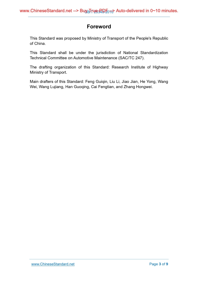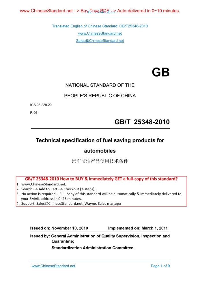 Similar standardsGB/T 25348-2010: Technical specification of fuel saving products for automobiles---This is an excerpt. Full copy of true-PDF in English version (including equations, symbols, images, flow-chart, tables, and figures etc.), auto-downloaded/delivered in 9 seconds, can be purchased online: https://www.ChineseStandard.net/PDF.aspx/GBT25348-2010GB NATIONAL STANDARD OF THE PEOPLE’S REPUBLIC OF CHINA ICS 03.220.20 R 06 Technical specification of fuel saving products for automobiles Issued on. NOVEMBER 10, 2010 Implemented on. MARCH 1, 2011 Issued by. General Administration of Quality Supervision, Inspection and Quarantine; Standardization Administration Committee. Table of ContentsForeword... 3 1 Scope... 4 2 Normative references... 4 3 Terms and definitions... 5 4 Technical conditions... 6ForewordThis Standard was proposed by Ministry of Transport of the People's Republic of China. This Standard shall be under the jurisdiction of National Standardization Technical Committee on Automotive Maintenance (SAC/TC 247). The drafting organization of this Standard. Research Institute of Highway Ministry of Transport. Main drafters of this Standard. Feng Guiqin, Liu Li, Jiao Jian, He Yong, Wang Wei, Wang Lujiang, Han Guoqing, Cai Fengtian, and Zhang Hongwei. Technical specification of fuel saving products for automobiles1 ScopeThis Standard specifies the improvement of automobile or engine’s economy, dynamic and emission performance after fuel saving products are used, as well as physical and chemical properties of additives, electrical performance of electronic fuel saving products for automobiles and other technical specifications. This Standard is applicable to fuel saving products for automobiles which take fuel oil as driving force.2 Normative referencesThe following standards contain the provisions which, through reference in this Standard, constitute the provisions of this Standard. For dated references, the subsequent amendments (excluding corrections) or revisions do not apply to this Standard. However, the parties who enter into agreement based on this Standard are encouraged to investigate whether the latest versions of these documents are applicable. For undated reference documents, the latest versions apply to this Standard. GB/T 260 Petroleum products - Determination of water GB/T 265 Petroleum products - Determination of kinematic viscosity and calculation of dynamic viscosity GB/T 511 Petroleum products and additives - Determination of mechanical impurities - Gravimetric method GB/T 3142 Lubricants. Determination of load carrying capacity (four balls method)3 Terms and definitionsThe following terms and definitions apply to this document. 3.1 fuel saving products for automobiles Products that can reduce vehicle fuel consumption and do not adversely affect other performances of automobiles. 3.3 rate of pollution controlling The proportion of reduced automobile exhaust pollutants after fuel saving products for automobiles are used, which can be calculated by. 3.4 rate of power contrasting The proportion of enhanced automobile dynamic after fuel saving products for automobiles are used, which can be calculated by.4 Technical conditions4.1 Basic requirements Engine bench test and automobile road test shall be conducted for fuel saving products for automobiles, so as to evaluate the improvement of automobile or engine’s economy, dynamic and emission performance. 4.2 Technical specifications for economy 4.3 Technical specifications for dynamic Technical specifications for dynamic of fuel saving products for automobiles shall meet requirements in Table 1. 4.4 Technical specifications for emission performance Technical specifications for emission performance of fuel saving products for automobiles shall meet requirements in Table 2. 4.5 Technical specifications for physical and chemical properties of additives 4.6 Technical specifications for electrical performance of electronic fuel saving products for automobiles Electronic fuel saving products for automobiles shall also meet technical specifications for electrical performance stipulated by automobile electronic standard. ......Source: Above contents are excerpted from the full-copy PDF -- translated/reviewed by: www.ChineseStandard.net / Wayne Zheng et al. Tips & Frequently Asked Questions:Question 1: How long will the true-PDF of English version of GB/T 25348-2010 be delivered?Answer: The full copy PDF of English version of GB/T 25348-2010 can be downloaded in 9 seconds, and it will also be emailed to you in 9 seconds (double mechanisms to ensure the delivery reliably), with PDF-invoice.Question 2: Can I share the purchased PDF of GB/T 25348-2010_English with my colleagues?Answer: Yes. The purchased PDF of GB/T 25348-2010_English will be deemed to be sold to your employer/organization who actually paid for it, including your colleagues and your employer's intranet.Question 3: Does the price include tax/VAT?Answer: Yes. Our tax invoice, downloaded/delivered in 9 seconds, includes all tax/VAT and complies with 100+ countries' tax regulations (tax exempted in 100+ countries) -- See Avoidance of Double Taxation Agreements (DTAs): List of DTAs signed between Singapore and 100+ countriesQuestion 4: Do you accept my currency other than USD?Answer: Yes. www.ChineseStandard.us -- GB/T 25348-2010 -- Click this link and select your country/currency to pay, the exact amount in your currency will be printed on the invoice. Full PDF will also be downloaded/emailed in 9 seconds.How to buy and download a true PDF of English version of GB/T 25348-2010?A step-by-step guide to download PDF of GB/T 25348-2010_EnglishStep 1: Visit website https://www.ChineseStandard.net (Pay in USD), or https://www.ChineseStandard.us (Pay in any currencies such as Euro, KRW, JPY, AUD).Step 2: Search keyword "GB/T 25348-2010". Step 3: Click "Add to Cart". If multiple PDFs are required, repeat steps 2 and 3 to add up to 12 PDFs to cart. Step 4: Select payment