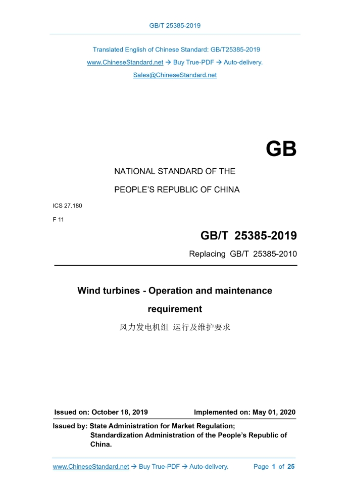GB/T 25385-2019: Wind turbines - Operation and maintenance requirement Delivery: 9 seconds. True-PDF full-copy in English & invoice will be downloaded + auto-delivered via email. See step-by-step procedure Status: Valid GB/T 25385: Historical versions