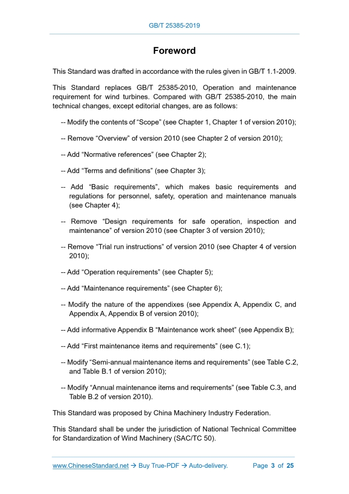 Similar standardsGB/T 25385-2019: Wind turbines - Operation and maintenance requirement---This is an excerpt. Full copy of true-PDF in English version (including equations, symbols, images, flow-chart, tables, and figures etc.), auto-downloaded/delivered in 9 seconds, can be purchased online: https://www.ChineseStandard.net/PDF.aspx/GBT25385-2019NATIONAL STANDARD OF THE PEOPLE’S REPUBLIC OF CHINA ICS 27.180 F 11 Replacing GB/T 25385-2010 Wind turbines - Operation and maintenance requirement ISSUED ON: OCTOBER 18, 2019 IMPLEMENTED ON: MAY 01, 2020 Issued by: State Administration for Market Regulation; Standardization Administration of the People’s Republic of China. Table of ContentsForeword ... 3 1 Scope ... 5 2 Normative references ... 5 3 Terms and definitions ... 5 4 Basic requirements ... 7 5 Operation requirements ... 11 6 Maintenance requirements ... 14 Appendix A (Informative) Lubrication cycle table ... 19 Appendix B (Informative) Maintenance work sheet ... 20 Appendix C (Informative) Regular maintenance items and requirements ... 21ForewordThis Standard was drafted in accordance with the rules given in GB/T 1.1-2009. This Standard replaces GB/T 25385-2010, Operation and maintenance requirement for wind turbines. Compared with GB/T 25385-2010, the main technical changes, except editorial changes, are as follows: -- Modify the contents of “Scope” (see Chapter 1, Chapter 1 of version 2010); -- Remove “Overview” of version 2010 (see Chapter 2 of version 2010); -- Add “Normative references” (see Chapter 2); -- Add “Terms and definitions” (see Chapter 3); -- Add “Basic requirements”, which makes basic requirements and regulations for personnel, safety, operation and maintenance manuals (see Chapter 4); -- Remove “Design requirements for safe operation, inspection and maintenance” of version 2010 (see Chapter 3 of version 2010); -- Remove “Trial run instructions” of version 2010 (see Chapter 4 of version 2010); -- Add “Operation requirements” (see Chapter 5); -- Add “Maintenance requirements” (see Chapter 6); -- Modify the nature of the appendixes (see Appendix A, Appendix C, and Appendix A, Appendix B of version 2010); -- Add informative Appendix B “Maintenance work sheet” (see Appendix B); -- Add “First maintenance items and requirements” (see C.1); -- Modify “Semi-annual maintenance items and requirements” (see Table C.2, and Table B.1 of version 2010); -- Modify “Annual maintenance items and requirements” (see Table C.3, and Table B.2 of version 2010). This Standard was proposed by China Machinery Industry Federation. This Standard shall be under the jurisdiction of National Technical Committee for Standardization of Wind Machinery (SAC/TC 50). The drafting organizations of this Standard: Beijing Goldwind Science & Creation Windpower Equipment Co., Ltd., Xinjiang Goldwind Sci & Tech Co., Ltd., Hohhot Branch of Chinese Academy of Agricultural Mechanization Sciences Co., Ltd., Envision Energy (Jiangsu) Co., Ltd., Beijing Eulikind Technology Co., Ltd., Mingyang Smart Energy Group Limited, Jiangsu Goldwind Science & Technology Co., Ltd., Guodian United Power Technology Co., Ltd., Gamesa Wind Turbine (Tianjin) Ltd., Vestas Wind Technology (China) Co., Ltd., Shanghai Electric Wind Power Group Co., Ltd., Zhejiang Windey Co., Ltd., Dongfang Electric Wind Power Co., Ltd., Three Gorges Electrical and Mechanical Engineering Technology Corporation, China General Certification Center, Beijing Tianrun New Energy Investment Co., Ltd., Longyuan (Beijing) Wind Power Engineering Technology Co., Ltd., CSIC (Chongqing) Haizhuang Windpower Equipment Co., Ltd., Xi'an Fengchuang Energy Technology Co., Ltd., Beijing Qianyuan Wind Power Technology Co., Ltd., CRRC Yongji Electric Co., Ltd., CRRC Zhuzhou Institute Co., Ltd., Sinoma Wind Power Blade Co., Ltd. The drafters of this Standard: Feng Tao, Li Lishan, Ren Jun, Zhu Hongdong, Hu Bin, Huang Chen, Zhang Qingyun, Zhao Hui, Xue Zhenfeng, Ning Qiaozhen, Chu Jingchun, Wang Wenyue, Li Yue, Yan Changkuan, Bu Xiangyu, Zhu Bing, Sun Wenguang, Chen Kangsheng, Cai Jun, Gao Ruoyu, Yang Zhangbin, Yang Hongyuan, Li Wenqian, Yao Wenjun, Wang Bo, Zhou Shidong, Qin Ling, Yao Lin, Zhuang Yan, Duan Zhiqiang, Shang Gang, Li Chengliang, Duan Yanfang. The previous versions of the standards which are replaced by this Standard are: -- GB/T 25385-2010. Wind turbines - Operation and maintenance requirement1 ScopeThis Standard specifies the safety, personnel, equipment, environment and management requirements that are related to the operation and maintenance of onshore wind turbines (hereinafter referred to as "units"). This Standard applies to the operation and maintenance of all grid-connected onshore units.2 Normative referencesThe following documents are indispensable for the application of this document. For dated references, only the dated version applies to this document. For undated references, the latest edition (including all amendments) applies to this document. GB/T 2900.1, Electrotechnical terminology - Fundamental terms GB/T 2900.13, Electrotechnical terminology - Dependability and quality of service GB/T 2900.53, Electrotechnical terminology - Wind turbine generator systems GB/T 35204-2017, Wind turbines - Safety manuals GBZ 188-2014, Technical specifications for occupational health surveillance DL/T 796, Wind farm safety procedures DL/T 797, Code on maintenance of wind farm3 Terms and definitionsTerms and definitions determined by GB/T 2900.1, GB/T 2900.13, GB/T 2900.53 and DL/T 797, and the following ones are applicable to this document. 3.1 Operation The production activity that is operated on the unit to ensure the safe and reliable operation of the unit, according to the grid conditions, dispatch requirements, weather conditions, power transformer substation and unit conditions. 3.2 Maintenance The maintenance activity to ensure the normal operation of the unit according to the design requirements, unit c