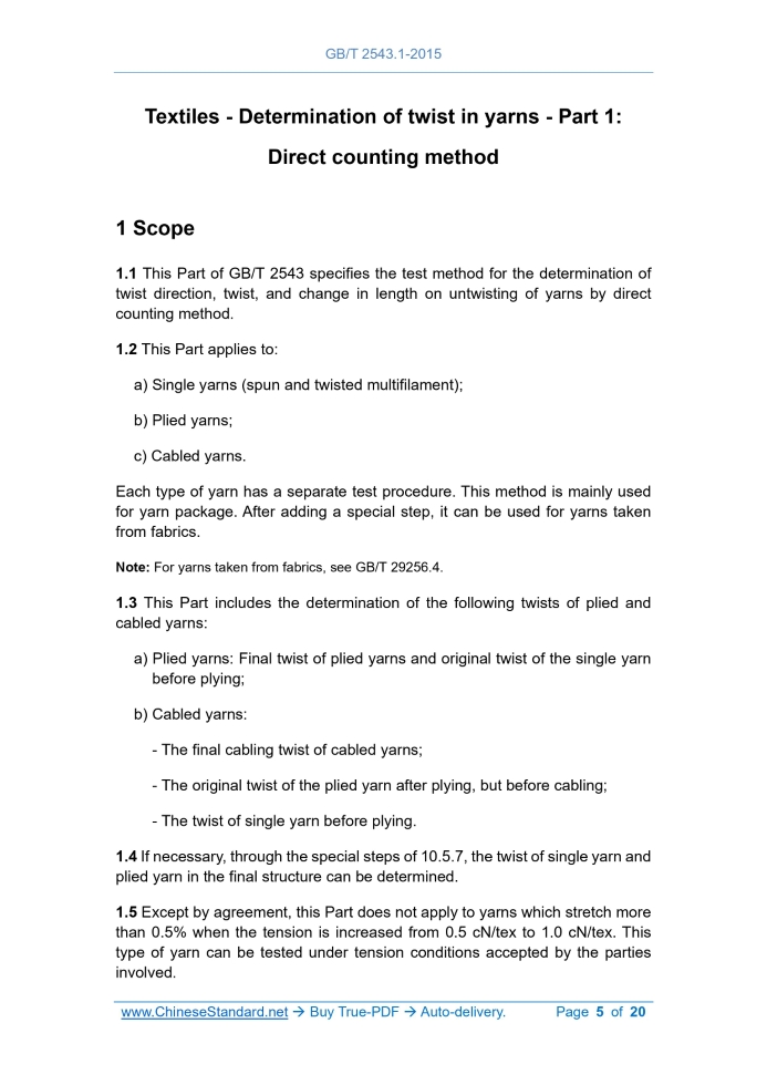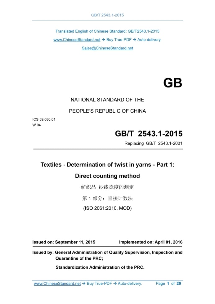 GB/T 2543.1-2015: Textiles -- Determination of twist in yarns -- Part 1: Direct counting method Delivery: 9 seconds. True-PDF full-copy in English & invoice will be downloaded + auto-delivered via email. See step-by-step procedure Status: Valid GB/T 2543.1: Historical versions