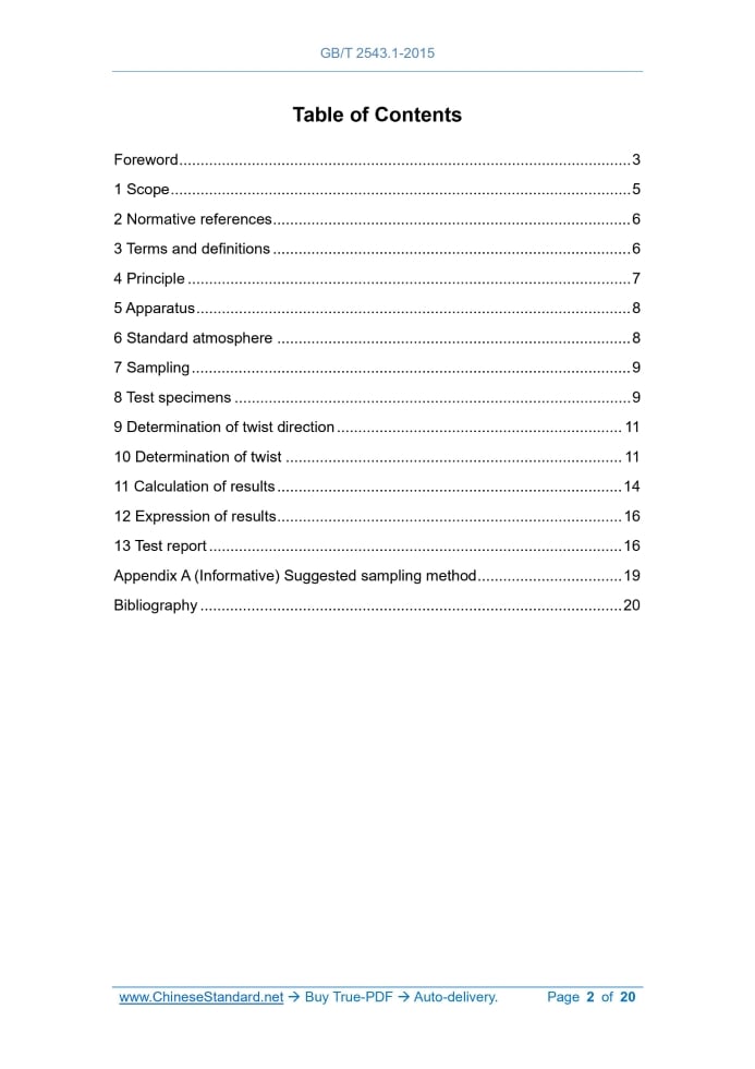 Similar standardsGB/T 2543.1-2015: Textiles -- Determination of twist in yarns -- Part 1: Direct counting method---This is an excerpt. Full copy of true-PDF in English version (including equations, symbols, images, flow-chart, tables, and figures etc.), auto-downloaded/delivered in 9 seconds, can be purchased online: https://www.ChineseStandard.net/PDF.aspx/GBT2543.1-2015GB NATIONAL STANDARD OF THE PEOPLE’S REPUBLIC OF CHINA ICS 59.080.01 W 04 Replacing GB/T 2543.1-2001 Textiles - Determination of twist in yarns - Part 1: Direct counting method (ISO 2061:2010, MOD) ISSUED ON: SEPTEMBER 11, 2015 IMPLEMENTED ON: APRIL 01, 2016 Issued by: General Administration of Quality Supervision, Inspection and Quarantine of the PRC; Standardization Administration of the PRC. Table of ContentsForeword ... 3 1 Scope ... 5 2 Normative references ... 6 3 Terms and definitions ... 6 4 Principle ... 7 5 Apparatus ... 8 6 Standard atmosphere ... 8 7 Sampling ... 9 8 Test specimens ... 9 9 Determination of twist direction ... 11 10 Determination of twist ... 11 11 Calculation of results ... 14 12 Expression of results ... 16 13 Test report ... 16 Appendix A (Informative) Suggested sampling method ... 19 Bibliography ... 20 Textiles - Determination of twist in yarns - Part 1: Direct counting method1 Scope1.1 This Part of GB/T 2543 specifies the test method for the determination of twist direction, twist, and change in length on untwisting of yarns by direct counting method. 1.2 This Part applies to: a) Single yarns (spun and twisted multifilament); b) Plied yarns; c) Cabled yarns. Each type of yarn has a separate test procedure. This method is mainly used for yarn package. After adding a special step, it can be used for yarns taken from fabrics. Note: For yarns taken from fabrics, see GB/T 29256.4. 1.3 This Part includes the determination of the following twists of plied and cabled yarns: a) Plied yarns: Final twist of plied yarns and original twist of the single yarn before plying; b) Cabled yarns: - The final cabling twist of cabled yarns; - The original twist of the plied yarn after plying, but before cabling; - The twist of single yarn before plying. 1.4 If necessary, through the special steps of 10.5.7, the twist of single yarn and plied yarn in the final structure can be determined. 1.5 Except by agreement, this Part does not apply to yarns which stretch more than 0.5% when the tension is increased from 0.5 cN/tex to 1.0 cN/tex. This type of yarn can be tested under tension conditions accepted by the parties involved. specimen; rotate one end of the specimen; remove the twist of the yarn specimen, until the components of the yarn under test are parallel. According to the number of turns required to remove the twist of the yarn, obtain the twist of the yarn.5 Apparatus5.1 Twist counter 5.1.1 It is composed of a pair of clamps. One of which can rotate around an axis in both directions and is connected with a rotation counter. It shall be possible to adjust the position of at least one clamp, so that the measured yarn length can be varied within the range of 10 mm~500 mm. There must be no gaps in the jaws. 5.1.2 There shall be pretensioning device and device for measuring specimen length. The accuracy of the device for measuring specimen length is ±0.5 mm or ±2% of the specimen length, whichever is less. 5.1.3 The twist counting device shall be able to record the number of revolutions of the rotary clamp. 5.1.4 If it is necessary to determine the contraction or elongation of the specimen length after untwisting, the movable clamp, when moving, shall not produce significant friction. 5.2 Dissecting needle It is used to check the untwisting state of the yarn under test. 5.3 Magnifying device It is used to observe the specimen. 5.4 Reeling device (optional) It is used for reeling laboratory sample skeins.6 Standard atmosphere6.1 The standard atmosphere for pre-conditioning, conditioning and testing shall meet the requirements of GB/T 6529. The change of relative humidity will not directly affect the twist. However, a large range of humidity changes will cause the length of some materials to change. Therefore, the sample should be subject to moisture equilibrium and test in a 10.1.1 According to the provisions of GB/T 6529, condition the laboratory sample package or the laboratory sample skeins (5.4) wound from the package in the test standard atmosphere for equilibrium. 10.1.2 According to the unwinding method when the package is in use, at the lowest practicable tension, the yarn is unwound from the top or side of the yarn package. In the process of unwinding and handling the sample, pay attention to avoid the change of the original twist. Before taking the first specimen, unwind and discard about 5 m of yarn. 10.1.3 Fix the specimen in the clamp of the twist counter (5.1); then cut the specimen from the package. If it is necessary to continue to take another specimen from the package, it shall use a fixed clamp to clamp; or use a heavy object to press the free end of the yarn, to avoid loss of twist. 10.2 Single spun yarn 10.2.1 According to the nominal length of the fiber in the yarn under test, adjust the position of the movable clamp on the twist counter (5.1) (see 8.1.1), accurate to ±0.5 mm. The gap between the jaws of the two clamps will affect the gauge length of the specimen and shall be eliminated. Use an accurate gauge or caliper to measure the distance between the clamps, to verify the gauge length of the specimen. Set the revolution counter to zero. 10.2.2 Use a pretension of (0.5±0.1)cN/tex to fix the specimen in the clamp of the tester. Be careful not to lose twist. If the elongation of the yarn under test reaches or exceeds 0.5% under the specified tension, the pretension shall be adjusted, so that the specimen elongation does not exceed 0.1%. This exceptional situation shall be agreed by the parties concerned. And the pretension used shall be indicated in the test report. 10.2.3 Turn th