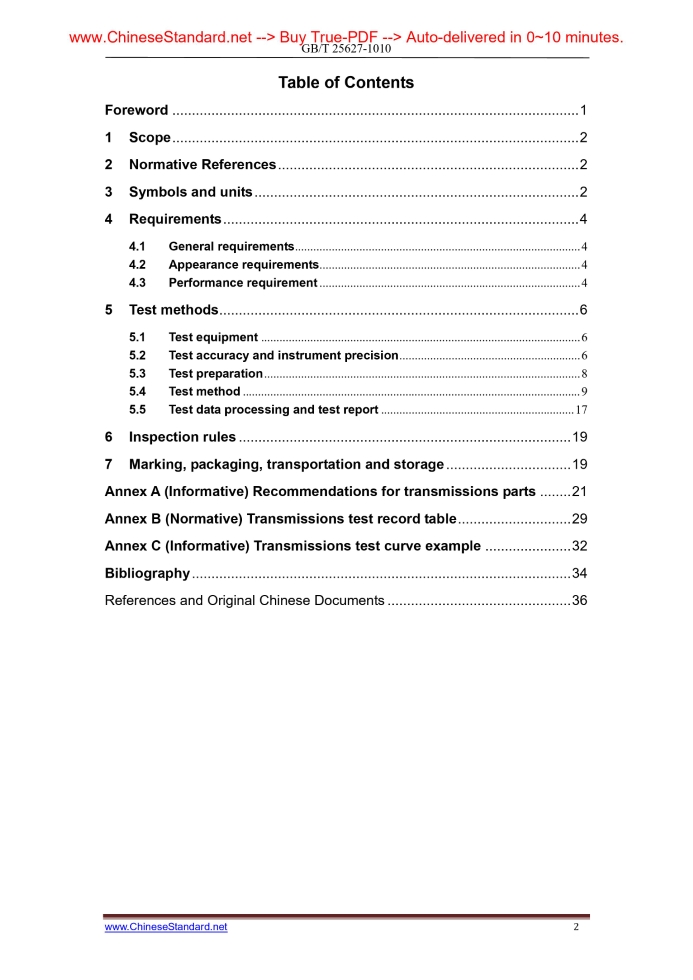 Similar standardsGB/T 25627-2010: Construction machinery -- Power-shift transmissions---This is an excerpt. Full copy of true-PDF in English version (including equations, symbols, images, flow-chart, tables, and figures etc.), auto-downloaded/delivered in 9 seconds, can be purchased online: https://www.ChineseStandard.net/PDF.aspx/GBT25627-2010GBT25627-2010) ICS 53.100 P 97 NATIONAL STANDARD OF THE PEOPLE’S REPUBLIC OF CHINA GB/T 25627–2010 Construction machinery -- Power-shift transmissions Issued on: DECEMBER 1, 2010 Implemented on: MARCH 1, 2011 Issued by. General Administration of Quality Supervision, Inspection and Quarantine of the People’s Republic of China; Standardization Administration of the People’s Republic of China Table of ContentsForeword ... 1 1 Scope ... 2 2 Normative References ... 2 3 Symbols and units ... 2 4 Requirements ... 4 4.1 General requirements ... 4 4.2 Appearance requirements ... 4 4.3 Performance requirement ... 4 5 Test methods... 6 5.1 Test equipment ... 6 5.2 Test accuracy and instrument precision ... 6 5.3 Test preparation ... 8 5.4 Test method ... 9 5.5 Test data processing and test report ... 17 6 Inspection rules ... 19 7 Marking, packaging, transportation and storage ... 19 Annex A (Informative) Recommendations for transmissions parts ... 21 Annex B (Normative) Transmissions test record table ... 29 Annex C (Informative) Transmissions test curve example ... 32 Bibliography ... 34 References and Original Chinese Documents ... 36ForewordAnnex A and Annex C of this Standard is informative, Annex B is normative. This Standard is proposed by China Machinery Industry Federation. This Standard is under the jurisdiction of National Technical Committee (SAC/TC 334) on Earthmoving Machine of Standardization Administration of China. The responsible drafting organizations are Hangzhou Advance Gearbox Group Co., Ltd and Tianjin Research Institute of Construction Machinery. The participation drafting organization is Sichuan Chengdu Chenggong Construction Machinery Co., Ltd. The chief drafting staffs of this Standard include Liu Weihui, Wu Runcai, Shang Haibo, Song Bin, Wang Wenlin, Liang Jianzong and Wang Yuning. Construction machinery -- Power-shift transmissions1 ScopeThis Standard stipulates the symbols, units, requirements, test methods, inspection rules, marking, packaging, transportation and storage of the construction machinery -- power-shift transmissions. This Standard is applicable to the construction machinery -- power-shift transmissions of 300kW or less (hereinafter referred to as transmissions). The transmissions above 300kW may refer to this Standard.2 Normative ReferencesThe articles contained in the following documents have become this Standard when they are quoted herein. For the dated documents so quoted, all the modifications (excluding corrections) or revisions made thereafter shall not be applicable to this Standard. For the undated documents so quoted, the latest editions shall be applicable to this Standard. GB/T 2828.1-2003 Sampling procedures for inspection by attributes - Part1. Sampling schemes indexed by acceptance quality limit (AQL) for lot-by-lot inspection (ISO 2859.1. 1999, IDT) GB/T 3785 Electric, sonic properties and measuring methods for sound level meters GB/T 7680 Torque converters -- Methods of performance tests GB/T 13306 Plates GB/T 14039 Hydraulic fluid power – Fluids -- Method for coding the level of contamination by solid particles GB/T 20082 Hydraulic fluid power-Fluid contamination-Determination of particulate contamination by the counting method using an optical microscope JB/T 5947 Engineering machinery-- Specifications for packaging3 Symbols and unitsSee Table 1 for the testing parameters of the transmissions and the names, symbols and units of the calculation parameters. between failures (MTBF) of the transmissions shall not be less than 150h and the availability (K) shall not be less than 85%.5 Test methods5.1 Test equipment 5.1.1 This Standard recommends to use open-testbed. The benches are comprised of the power machines, loading equipment, fastening and connecting devices and auxiliary systems. 5.1.2 DC motors, DC dynamometers, AC speed control motors and diesel engines may be selected for the power machines. 5.1.3 DC dynamometers, DC generators, AC speed control motors, electric eddy current dynamometers, hydraulic loading system or hydraulic dynamometers may be selected for the loading equipment. Testbed layout is shown in Figure 1. 5.1.4 Auxiliary systems include oil supply system and water supply system. The oil supply system shall satisfy the maximum oil supply pressure and flow-volume at the operation of the transmissions and may be continuously adjusted. Heating and cooling devices shall be installed in the system. Water supply system shall meet the flow-volume requirements and provide adjustable and stable water-flow. 5.1.5 The no-load power loss tests of the transmissions and the transmissions efficiency tests of the transmissions shall use independent oil supply systems. 5.2 Test accuracy and instrument precision 5.2.1 Stabilization precision during the measurement process shall meet the following requirements. —— Test system torque ripple is not greater than ±0.5%; —— The fluctuating value of rotating speed of the test systems shall not be more than ±5r/min. flow-volume of the variable-speed pumps and keep the oil level of the oil pan at the prescribed height. 5.4.2.2 Test procedure for the transmissions with torque converter Test procedure for the transmissions with hydraulic torque converter. a) The input rotating speed during the tests shall keep constant and comply with the stipulations in Table 4; b) At the beginning of the test, first, make the output shaft idle, increase the input rotating speed to the set value and record the data after the running is fully stable; then, gradually load the output shaft as per the set increment, decrease the output rotating speed and kee
