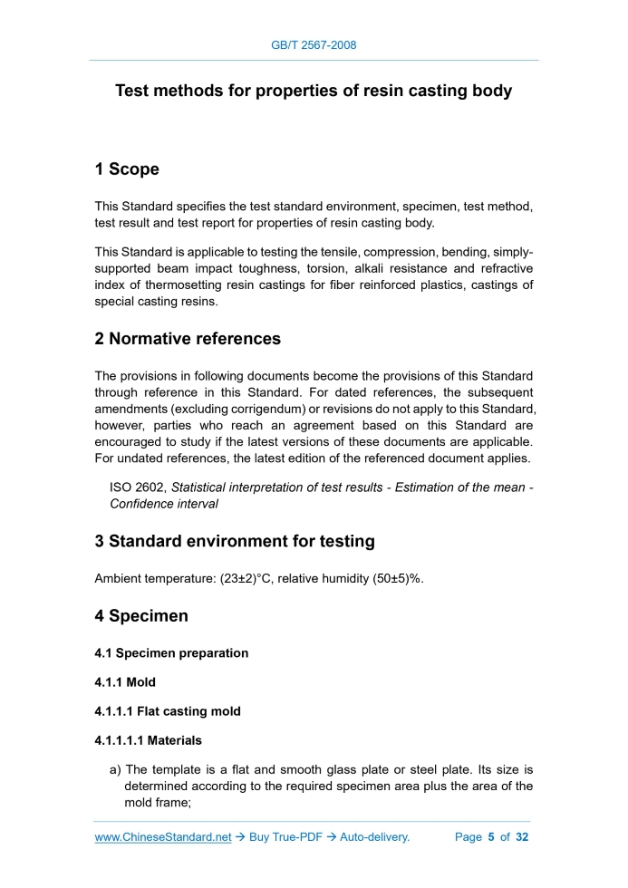 GB/T 2567-2008: Test methods for properties of resin casting body---This is an excerpt. Full copy of true-PDF in English version (including equations, symbols, images, flow-chart, tables, and figures etc.), auto-downloaded/delivered in 9 seconds, can be purchased online: https://www.ChineseStandard.net/PDF.aspx/GBT2567-2008GB NATIONAL STANDARD OF THE PEOPLE’S REPUBLIC OF CHINA ICS 83.120 Q 23 Replacing GB/T 2567~2571-1995, GB/T 4726-1984, GB/T 7194-1987 Partially replacing GB/T 8238-1987 Test methods for properties of resin casting body Issued on: JUNE 30, 2008 Implemented on: APRIL 01, 2009 Issued by. General Administration of Quality Supervision, Inspection and Quarantine; Standardization Administration of the People's Republic of China. Table of ContentsForeword... 3 1 Scope... 5 2 Normative references... 5 3 Standard environment for testing... 5 4 Specimen... 5 5 Tests... 8 6 Test results... 29 7 Test report... 30 Annex A (Normative) Drawing method... 31 Test methods for properties of resin casting body1 ScopeThis Standard specifies the test standard environment, specimen, test method, test result and test report for properties of resin casting body. This Standard is applicable to testing the tensile, compression, bending, simply- supported beam impact toughness, torsion, alkali resistance and refractive index of thermosetting resin castings for fiber reinforced plastics, castings of special casting resins.2 Normative referencesThe provisions in following documents become the provisions of this Standard through reference in this Standard. For dated references, the subsequent amendments (excluding corrigendum) or revisions do not apply to this Standard, however, parties who reach an agreement based on this Standard are encouraged to study if the latest versions of these documents are applicable. For undated references, the latest edition of the referenced document applies. ISO 2602, Statistical interpretation of test results - Estimation of the mean - Confidence interval3 Standard environment for testingAmbient temperature. (23±2)°C, relative humidity (50±5)%.4 Specimen4.1 Specimen preparation 4.1.1 Mold 4.1.1.1 Flat casting mold 4.1.1.1.1 Materials a) The template is a flat and smooth glass plate or steel plate. Its size is determined according to the required specimen area plus the area of the mold frame; 4.1.4 Specimen processing 4.1.4.1 Use a scribing tool on the casting plate. Mark the processing line according to the specimen size. Sampling must avoid bubbles, cracks, pits, stress concentration areas. 4.1.4.2 Machine the specimen. During processing, the surface of the specimen shall be prevented from damage and defects such as scratches. 4.1.4.3 The rough surface needs to be finely ground with a fine file or sandpaper. The size of the notch is detected with a special template. 4.1.4.4 Water can be used to cool during processing. Dry in time after processing. 4.1.5 Internal stress examination Before the casting body is tested, use polarized light to test the internal stress. If there is internal stress, remove it. 4.1.6 Internal stress relief method 4.1.6.1 Oil bathing method Place the specimen steadily in a container filled with oil. Immerse the entire specimen in the oil. Place the container immersed in the specimen in the oven. The temperature in the box is raised from room temperature to the glass transition temperature of resin within 1 h. Turn off the power after 3 h of constant temperature. After the oven is naturally cooled to room temperature, take the specimen out from the oil bath. Carry out the internal stress observation. NOTE. The oil used in the oil bath shall not have chemical effects on the specimen, and shall not swell, dissolve, or absorb. 4.1.6.2 Air bathing method Place the specimen in a drying oven with an air blower. The treatment temperature and time are the same as in the oil bath. 4.2 Specimen visual inspection and quantity 4.2.1 Before the test, the specimen must be strictly inspected. The specimen shall be flat, smooth, free of bubbles, cracks, obvious impurities and processing damage and other defects. 4.2.2 Each group shall have at least 5 valid specimens. 4.3 Specimen state adjustment 4.3.1 Before the test, the specimen shall be placed under the test standard environmental conditions for at least 24 h. The specimen after state adjustment shall be tested under the same test standard environmental conditions as the state adjustment (if otherwise specified, according to relevant regulations). 4.3.2 If the laboratory standard environmental conditions are not available, the specimens can be placed in a desiccator before the test for at least 24 h. 4.4 Specimen measurement accuracy 4.4.1 The measurement of the working area of the specimen is accurate to 0.01mm. 4.4.2 The measurement accuracy of other values of the specimen shall be in accordance with the provisions of the corresponding test method. 4.5 Test equipment 4.5.1 The load error of the test equipment does not exceed ±1%. The selection of the test equipment range shall make the failure load of the specimen within the range of 10% to 90% of the full scale (as far as possible to fall on one side of the full scale) and not less than 4% of the full scale of the test equipment (electronic tensile test equipment is according to relevant regulations). 4.5.2 The error of the measuring deformation instrument shall not exceed ±1%. 4.5.3 The test equipment can obtain the constant test speed specified in the test method standard. The speed error does not exceed 1%. 4.5.4 The test equipment shall be regularly verified by the national metrology department and used within the valid verification period.5 Tests5.1 Tensile test 5.1.1 Test principle Apply a static tensile load at a constant speed along the axial direction of the specimen until the specimen breaks or reaches a predetermined elongation. Throughout the process, measure the load applied to the specimen and the elongation of the specimen, so as to