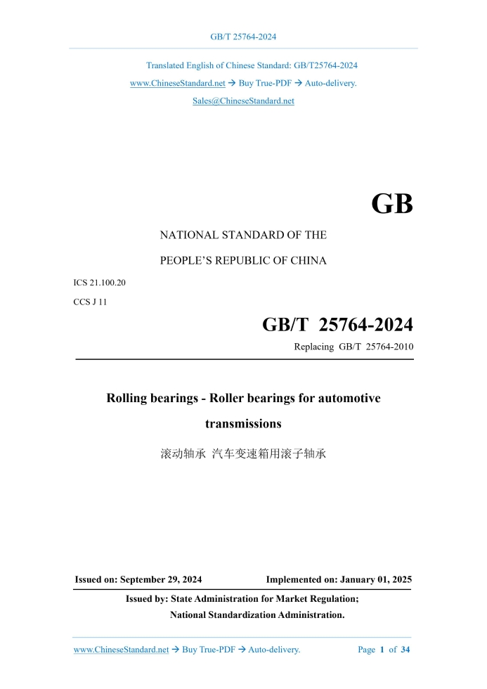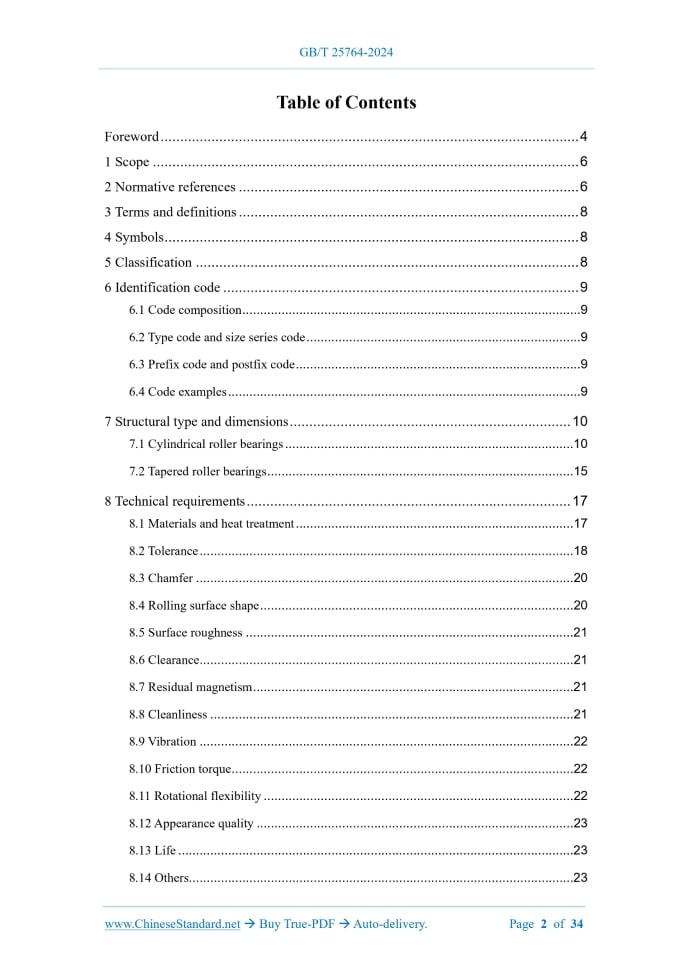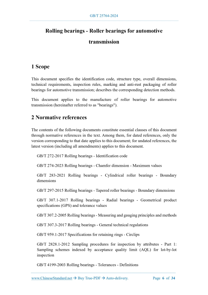 Similar standardsGB/T 25764-2024: Rolling bearings - Roller bearings for automotive transmissions---This is an excerpt. Full copy of true-PDF in English version (including equations, symbols, images, flow-chart, tables, and figures etc.), auto-downloaded/delivered in 9 seconds, can be purchased online: https://www.ChineseStandard.net/PDF.aspx/GBT25764-2024GB NATIONAL STANDARD OF THE PEOPLE’S REPUBLIC OF CHINA ICS 21.100.20 CCS J 11 Replacing GB/T 25764-2010 Rolling bearings - Roller bearings for automotive transmissions ISSUED ON: SEPTEMBER 29, 2024 IMPLEMENTED ON: JANUARY 01, 2025 Issued by: State Administration for Market Regulation; National Standardization Administration. Table of ContentsForeword ... 4 1 Scope ... 6 2 Normative references ... 6 3 Terms and definitions ... 8 4 Symbols ... 8 5 Classification ... 8 6 Identification code ... 9 6.1 Code composition ... 9 6.2 Type code and size series code ... 9 6.3 Prefix code and postfix code ... 9 6.4 Code examples ... 9 7 Structural type and dimensions ... 10 7.1 Cylindrical roller bearings ... 10 7.2 Tapered roller bearings ... 15 8 Technical requirements ... 17 8.1 Materials and heat treatment ... 17 8.2 Tolerance ... 18 8.3 Chamfer ... 20 8.4 Rolling surface shape ... 20 8.5 Surface roughness ... 21 8.6 Clearance... 21 8.7 Residual magnetism ... 21 8.8 Cleanliness ... 21 8.9 Vibration ... 22 8.10 Friction torque ... 22 8.11 Rotational flexibility ... 22 8.12 Appearance quality ... 23 8.13 Life ... 23 8.14 Others... 23 Rolling bearings - Roller bearings for automotive transmission1 ScopeThis document specifies the identification code, structure type, overall dimensions, technical requirements, inspection rules, marking and anti-rust packaging of roller bearings for automotive transmission; describes the corresponding detection methods. This document applies to the manufacture of roller bearings for automotive transmission (hereinafter referred to as "bearings").2 Normative referencesThe contents of the following documents constitute essential clauses of this document through normative references in the text. Among them, for dated references, only the version corresponding to that date applies to this document; for undated references, the latest version (including all amendments) applies to this document. GB/T 272-2017 Rolling bearings - Identification code GB/T 274-2023 Rolling bearings - Chamfer dimension - Maximum values GB/T 283-2021 Rolling bearings - Cylindrical roller bearings - Boundary dimensions GB/T 297-2015 Rolling bearings - Tapered roller bearings - Boundary dimensions GB/T 307.1-2017 Rolling bearings - Radial bearings - Geometrical product specifications (GPS) and tolerance values GB/T 307.2-2005 Rolling bearings - Measuring and gauging principles and methods GB/T 307.3-2017 Rolling bearings - General technical regulations GB/T 959.1-2017 Specifications for retaining rings - Circlips GB/T 2828.1-2012 Sampling procedures for inspection by attributes - Part 1: Sampling schemes indexed by acceptance quality limit (AQL) for lot-by-lot inspection GB/T 4199-2003 Rolling bearings - Tolerances - Definitions 8.1.1.1 Solid rings should be made of high carbon chromium bearing steel in accordance with GB/T 18254-2016; their heat treatment quality shall comply with GB/T 34891- 2017. The ring surface can also be treated by nitriding, carbonitriding and other heat treatment processes; its heat treatment quality shall comply with JB/T 7363-2023 or product drawings. 8.1.1.2 Tapered roller bearing rings can also be made of low carbon alloy steels such as 15CrMo and 20CrMo in accordance with GB/T 3077-2015. After carburizing heat treatment, its heat treatment quality shall comply with JB/T 8881-2020. 8.1.1.3 The drawn rings of drawn outer ring cylindrical roller bearings should be made of low carbon alloy steels such as 15CrMo and 20CrMo in accordance with GB/T 3077- 2015. After carburizing and carbonitriding heat treatment, the heat treatment quality shall comply with the provisions of JB/T 7363-2023. 8.1.2 Rolling elements The rolling elements should be made of high carbon chromium bearing steel in accordance with GB/T 18254-2016; the heat treatment quality shall comply with the provisions of GB/T 34891-2017. 8.1.3 Cage The cage can be made of engineering plastics or metal. When the cage is made of engineering plastics, its material shall comply with the provisions of JB/T 7048-2011; when the cage is made of low carbon steel, its material shall comply with the provisions of GB/T 28268-2012; it may also be made of other materials with equivalent or better performance. When the cage is made of copper alloy material, its material shall comply with the provisions of the product drawing. 8.1.4 Elastic lock ring The elastic lock ring should be made of materials that comply with the provisions of Table 1 in GB/T 959.1-2017; its heat treatment and related properties shall comply with the provisions of GB/T 959.1-2017. 8.2 Tolerance 8.2.1 Bearing tolerance 8.2.1.1 The tolerance of the bearing shall not be lower than the provisions of the ordinary grade tolerance in GB/T 307.1-2017. 8.2.1.2 The tolerance of the outer diameter Ew of the roller set of RN and RND cylindrical roller bearings shall be . 8.12 Appearance quality The working surface of the bearing shall not have cracks, rust, obvious bumps. 8.13 Life 8.13.1 After the conventional life test of the bearing, the ratio -- of the test value of its rated life to the basic rated life L10 t/L10 h shall not be less than 2. If the user has special requirements, it can also be determined by negotiation with the manufacturer. 8.13.2 The life of the bearing bench simulation test shall meet the requirements of the corresponding vehicle model. 8.13.3 The durability life of the actual vehicle bearing shall meet the requirements of the corresponding vehicle model. 8.14 Others 8.14.1 The technical conditions of the matching between shaft and the bearing seat and the bearing hole are shown in Appendix A