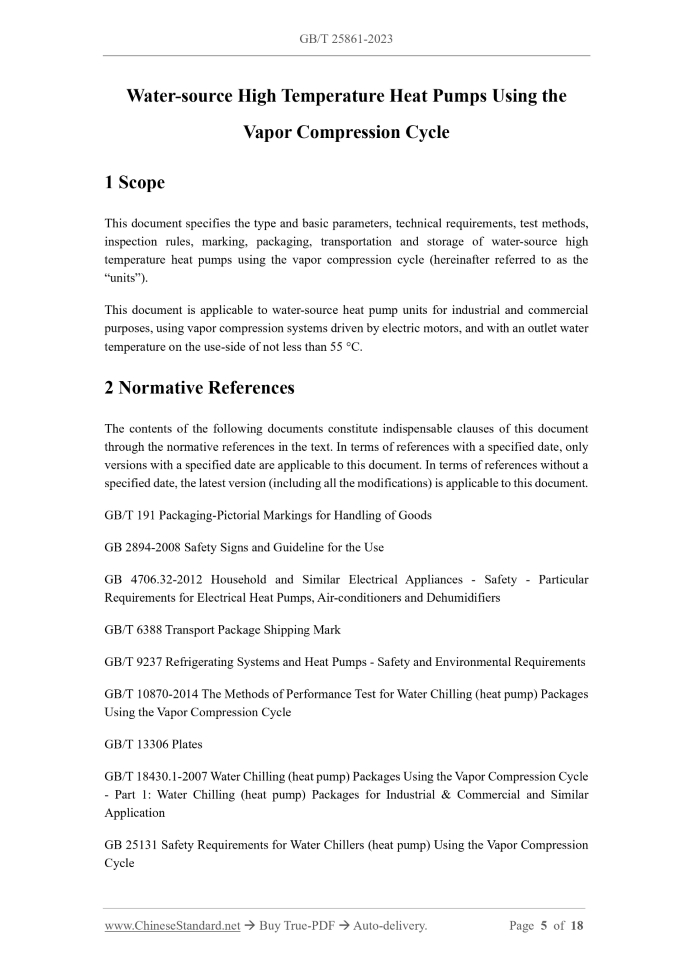Similar standardsGB/T 25861-2023: Water-source high temperature heat pumps using the vapor compression cycle---This is an excerpt. Full copy of true-PDF in English version (including equations, symbols, images, flow-chart, tables, and figures etc.), auto-downloaded/delivered in 9 seconds, can be purchased online: https://www.ChineseStandard.net/PDF.aspx/GBT25861-2023GB NATIONAL STANDARD OF THE PEOPLE’S REPUBLIC OF CHINA ICS 27.200 CCS J 73 Replacing GB/T 25861-2010 Water-source High Temperature Heat Pumps Using the Vapor Compression Cycle Issued on: MARCH 17, 2023 Implemented on: OCTOBER 1, 2023 Issued by. State Administration for Market Regulation; Standardization Administration of the People’s Republic of China. Table of ContentsForeword... 3 1 Scope... 5 2 Normative References... 5 3 Terms and Definitions... 6 4 Types and Basic Parameters... 6 5 Technical Requirements... 8 6 Test Methods... 11 7 Inspection Rules... 15 8 Marking, Packaging, Transportation and Storage... 16 Water-source High Temperature Heat Pumps Using the Vapor Compression Cycle1 ScopeThis document specifies the type and basic parameters, technical requirements, test methods, inspection rules, marking, packaging, transportation and storage of water-source high temperature heat pumps using the vapor compression cycle (hereinafter referred to as the “units”). This document is applicable to water-source heat pump units for industrial and commercial purposes, using vapor compression systems driven by electric motors, and with an outlet water temperature on the use-side of not less than 55 C.2 Normative ReferencesThe contents of the following documents constitute indispensable clauses of this document through the normative references in the text. In terms of references with a specified date, only versions with a specified date are applicable to this document. In terms of references without a specified date, the latest version (including all the modifications) is applicable to this document. GB/T 191 Packaging-Pictorial Markings for Handling of Goods GB 2894-2008 Safety Signs and Guideline for the Use GB 4706.32-2012 Household and Similar Electrical Appliances - Safety - Particular Requirements for Electrical Heat Pumps, Air-conditioners and Dehumidifiers GB/T 6388 Transport Package Shipping Mark GB/T 9237 Refrigerating Systems and Heat Pumps - Safety and Environmental Requirements GB/T 10870-2014 The Methods of Performance Test for Water Chilling (heat pump) Packages Using the Vapor Compression Cycle GB/T 13306 Plates GB/T 18430.1-2007 Water Chilling (heat pump) Packages Using the Vapor Compression Cycle - Part 1.Water Chilling (heat pump) Packages for Industrial & Commercial and Similar Application GB 25131 Safety Requirements for Water Chillers (heat pump) Using the Vapor Compression Cycle GB/T 26572 Requirements of Concentration Limits for Certain Restricted Substances in Electrical and Electronic Products JB/T 4330-1999 Determination of Noise Emitted by Refrigerating and Air Conditioning Equipment JB/T 7249 Refrigeration and Air Conditioning Apparatus - Terminology3 Terms and DefinitionsThe terms and definitions defined in JB/T 7249 and GB/T 10870-2014, and the following are applicable to this document. 3.1 water-source high temperature heat pumps using the vapor compression cycle Water-source heat pump units that use the vapor compression refrigeration cycle driven by electric motors to produce hot water of not less than 55 C.4 Types and Basic Parameters4.1 Types In accordance with the nominal operating conditions of the units, the hot water outlet temperature is classified into. a) H1N type. nominal outlet temperature is 55 C; b) H2N type. nominal outlet temperature is 60 C; c) H3N type. nominal outlet temperature is 70 C; d) H4N type. nominal outlet temperature is 80 C; e) H5N type. nominal outlet temperature is 90 C. NOTE. where N is a, b, c, d or e, indicating the sub-division in accordance with the water source temperature (on the heat source side), please refer to Table 2 for details. 4.2 Basic Parameters 4.2.1 The temperature range of the unit water source is shown in Table 1. 5.1.8 The insulation layer of the units shall have good insulation performance, and be non-toxic, odorless and flame-retardant. 5.1.9 The units shall have protection functions, such as motor overload protection, phase loss protection (three-phase power supply), water system water failure protection, antifreeze protection, and high- and low-pressure protection of the refrigeration system, etc. Various control functions are normal, and various protection devices shall meet the design requirements and be sensitive and reliable. 5.1.10 The heat exchange equipment shall have the corresponding anti-corrosion performance, and the units shall not contaminate the water source during use. 5.1.11 The outer surface of the units shall be clean and the painted surface shall be smooth. Pipeline accessories shall generally be installed horizontally and vertically. Before filling the refrigerant, the surface in the units that comes into contact with the refrigerant and lubrication shall be kept clean and dry. 5.1.12 The materials of the refrigeration system components of the units shall not deteriorate under the action of refrigerant, lubricating oil and their mixtures, and shall ensure the normal operation of the whole units. 5.1.13 The regulating device of the units with energy regulation shall be sensitive and reliable. 5.2 Performance Requirements 5.2.1 Air tightness, vacuum and pressure test 5.2.1.1 The air tightness requirements for the units shall comply with the provisions of 5.2.1 in GB/T 18430.1-2007. 5.2.1.2 The vacuum requirements for the units shall comply with the provisions of 5.2.2 in GB/T 18430.1-2007. 5.2.1.3 The pressure test requirements for the units shall comply with the provisions of 5.2.3 in GB/T 18430.1-2007. 5.2.2 Operation When the units are normally operating, the inspection items shall meet the design requirements. 5.2