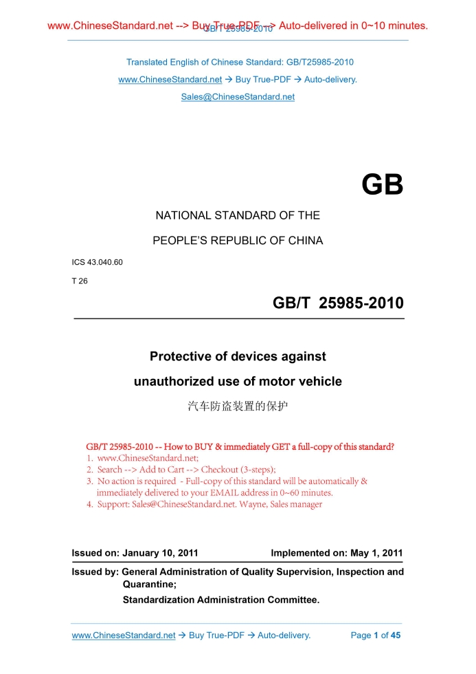 GB/T 25985-2010: Protective of devices against unauthorized use of motor vehicles Delivery: 9 seconds. True-PDF full-copy in English & invoice will be downloaded + auto-delivered via email. See step-by-step procedure Status: Valid