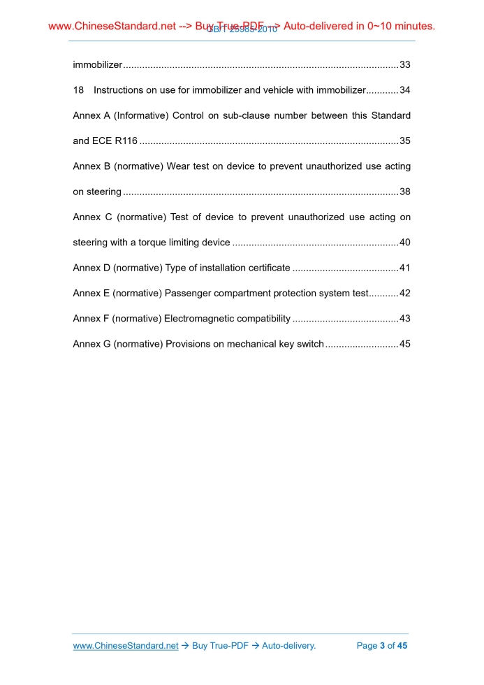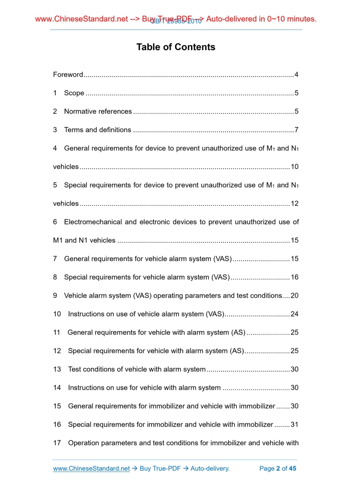 Similar standardsGB/T 25985-2010: Protective of devices against unauthorized use of motor vehicles---This is an excerpt. Full copy of true-PDF in English version (including equations, symbols, images, flow-chart, tables, and figures etc.), auto-downloaded/delivered in 9 seconds, can be purchased online: https://www.ChineseStandard.net/PDF.aspx/GBT25985-2010GB NATIONAL STANDARD OF THE PEOPLE’S REPUBLIC OF CHINA ICS 43.040.60 T 26 Protective of devices against unauthorized use of motor vehicle Issued on. JANUARY 10, 2011 Implemented on. MAY 1, 2011 Issued by. General Administration of Quality Supervision, Inspection and Quarantine; Standardization Administration Committee. Table of ContentsForeword... 4 1 Scope... 5 2 Normative references... 5 3 Terms and definitions... 7 4 General requirements for device to prevent unauthorized use of M1 and N1 vehicles... 10 5 Special requirements for device to prevent unauthorized use of M1 and N1 vehicles... 12 6 Electromechanical and electronic devices to prevent unauthorized use of M1 and N1 vehicles... 15 7 General requirements for vehicle alarm system (VAS)... 15 8 Special requirements for vehicle alarm system (VAS)... 16 9 Vehicle alarm system (VAS) operating parameters and test conditions... 20 10 Instructions on use of vehicle alarm system (VAS)... 24 11 General requirements for vehicle with alarm system (AS)... 25 12 Special requirements for vehicle with alarm system (AS)... 25 13 Test conditions of vehicle with alarm system... 30 14 Instructions on use for vehicle with alarm system... 30 15 General requirements for immobilizer and vehicle with immobilizer... 30 16 Special requirements for immobilizer and vehicle with immobilizer... 31 17 Operation parameters and test conditions for immobilizer and vehicle with immobilizer... 33 18 Instructions on use for immobilizer and vehicle with immobilizer... 34 Annex A (Informative) Control on sub-clause number between this Standard and ECE R116... 35 Annex B (normative) Wear test on device to prevent unauthorized use acting on steering... 38 Annex C (normative) Test of device to prevent unauthorized use acting on steering with a torque limiting device... 40 Annex D (normative) Type of installation certificate... 41 Annex E (normative) Passenger compartment protection system test... 42 Annex F (normative) Electromagnetic compatibility... 43 Annex G (normative) Provisions on mechanical key switch... 45ForewordThe modification of this Standard uses ECE R116 Regulation "Uniform Provisions Concerning the Protection of Motor Vehicles Against Unauthorized Use" (Revision 2) and all supplements, errata issued before November 2008. It deleted Clause 2 Overall definition, Clause 3 Authentication application, Clause 4 Authentication, Clause 9 Authentication extension and type change, Clause 10 Product consistency, Clause 11 Penalty on product inconsistency, Clause 12 Official discontinued production, Clause 13 Transitional terms, Clause 14 Names and addresses of authentication testing organization and management department, Attachment 1 Information file, Attachment 2 Authentication management, Attachment 3 Authentication marks of ECE R116- 02 because they did not comply with China standard system. To facilitate ECE R116 clause control, this Standard added an informative Annex A. Annex A of this Standard is informative. Annex B ~ Annex G are normative. This Standard was proposed by National Development and Reform Commission, People's Republic of China. This Standard shall be under the jurisdiction of National Technical Committee on Automobile of Standardization Administration of China (SAC/TC 114). The drafting organization of this Standard. China Automotive Technology Research Center. Main drafters of this Standard. Sun Zhendong, Zhu Tong. Protective of devices against unauthorized use of motor vehicle1 ScopeThis Standard specifies the requirements and test methods for protective of devices against unauthorized use of motor vehicle. This Standard is applicable to M1 and N1 vehicle device to prevent unauthorized use, applicable to vehicle alarm system (VAS) permanently installed on M1 vehicle and N1 vehicle of which the maximum total designed mass is not greater than 2000 kg, applicable to alarm system on M1 vehicle as well as N1 vehicle (only for 12V voltage system car) of which the maximum total designed mass is not greater than 2000 kg, applicable to immobilizer as well as immobilizer of its M1 vehicle and N1 vehicle (only for 12V voltage system car) of which the maximum total designed mass is not greater than 2000 kg. Other types of vehicles and devices equipped on those vehicles as accessories shall refer to this Standard.2 Normative referencesThe following standards contain the provisions which, through reference in this Standard, constitute the provisions of this Standard. For dated references, subsequent amendments (excluding corrections) or revisions do not apply to this Standard. However, the parties who enter into agreement based on this Standard are encouraged to investigate whether the latest versions of these documents are applicable. For undated reference documents, the latest versions apply to this Standard. GB/T 2423.4-1993, Basic environmental testing procedures for electric and electronic products - Test Db. Damp heat, cyclic (eqv IEC 60068-2-30.1980) GB/T 2423.17-1993, Basic environmental testing procedures for electric and electronic products Test Ka. Salt mist (eqv IEC60068-2-11.1981) GB 4208, Degrees of protection provided by enclosure (IP code) (GB 4208- 2008, IEC60529.2001, IDT) GB 12676, Technical requirements and testing methods for commercial vehicle and trailer braking systems GB 14023, Vehicles, boats and internal combustion engine - Radio disturbance characteristics - Limits and methods of measurement for the protection of off-board receivers3 Terms and definitionsFor the purposes of this document, the following terms and definitions apply. 3.1 vehicle type the vehicle that has no di