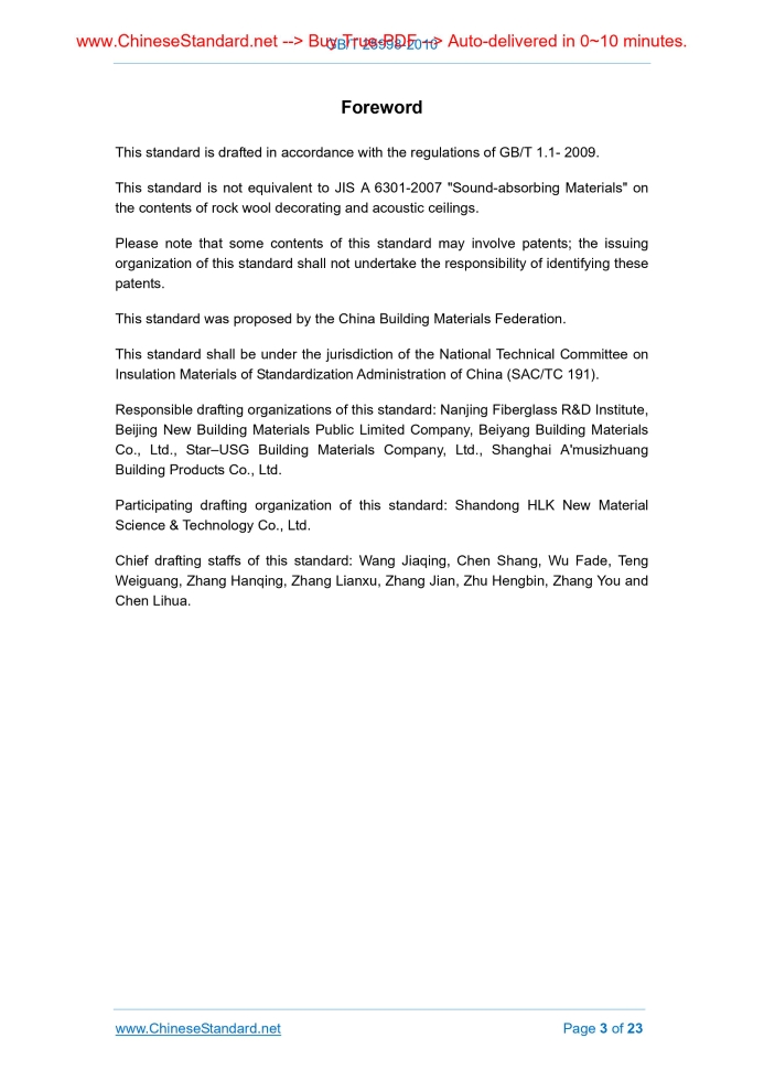 Similar standardsGB/T 25998-2010: Mineral wool decorating and acoustic ceilings---This is an excerpt. Full copy of true-PDF in English version (including equations, symbols, images, flow-chart, tables, and figures etc.), auto-downloaded/delivered in 9 seconds, can be purchased online: https://www.ChineseStandard.net/PDF.aspx/GBT25998-2010GB NATIONAL STANDARD OF THE PEOPLE’S REPUBLIC OF CHINA ICS 91.060.30 Q25 Mineral Wool Decorating and Acoustic Ceilings 矿物棉装饰吸声板 Issued on: JANUARY 10, 2011 Implemented on: OCTOBER 1, 2011 Issued by. General Administration of Quality Supervision, Inspection and Quarantine of the People's Republic of China; Standardization Administration of the People's Republic of China. Table of Contents1 Scope... 4 2 Normative References... 4 3 Terms and Definitions... 5 4 Classification and Marking... 6 5 Requirements... 7 6 Test Methods... 9 7 Inspection Rules... 10 8 Marks and Labels... 13 9 Packaging, Transportation and Storage... 14 Appendix A... 15 Appendix B... 17 Appendix C... 18 Appendix D... 21 Appendix E... 22ForewordThis standard is drafted in accordance with the regulations of GB/T 1.1- 2009. This standard is not equivalent to JIS A 6301-2007 "Sound-absorbing Materials" on the contents of rock wool decorating and acoustic ceilings. Please note that some contents of this standard may involve patents; the issuing organization of this standard shall not undertake the responsibility of identifying these patents. This standard was proposed by the China Building Materials Federation. This standard shall be under the jurisdiction of the National Technical Committee on Insulation Materials of Standardization Administration of China (SAC/TC 191). Responsible drafting organizations of this standard. Nanjing Fiberglass R&D Institute, Beijing New Building Materials Public Limited Company, Beiyang Building Materials Co., Ltd., Star–USG Building Materials Company, Ltd., Shanghai A'musizhuang Building Products Co., Ltd. Participating drafting organization of this standard. Shandong HLK New Material Science & Technology Co., Ltd. Chief drafting staffs of this standard. Wang Jiaqing, Chen Shang, Wu Fade, Teng Weiguang, Zhang Hanqing, Zhang Lianxu, Zhang Jian, Zhu Hengbin, Zhang You and Chen Lihua. Mineral Wool Decorating and Acoustic Ceilings1 ScopeThis standard specifies the classification and marking, requirements, test methods, inspection rules, marks and labels, packaging, transportation and storage of mineral wool decorating and acoustic ceilings (hereinafter referred to as "acoustic ceilings"). This standard is applicable to the mineral wool decorating and acoustic ceilings produced by the wet-process method or dry-process method.2 Normative ReferencesThe following documents are indispensable for the application of this standard. For dated references, only the dated edition is applicable to this document. For undated references, the latest editions of the normative documents (including all the amendments) are applicable to this document. GB/T 191 Packaging - Pictorial Marking for Handling of Goods GB/T 3947 Acoustical Terminology GB/T 4132 Definitions of Terms Relating to Thermal Insulating Materials GB/T 5480 Test Methods for Mineral Wool and its Products GB 6566 Limit of Radionuclides in Building Materials GB 8624-1997 Classification for Burning Behavior of Building Materials and Products GB/T 10294 Thermal Insulation - Determination of Steady-state Thermal Resistance and Related Properties - Guarded Hot Plate Apparatus GB/T 10295 Thermal Insulation-Determination of Steady-state Thermal Resistance and Related Properties - Heat Flow Meter Apparatus GB/T 17657-1999 Test Methods of Evaluating the Properties of Wood-based Panels and Surface Decorated Wood-based Panels GB 18580 Indoor Decorating and Refurbishing Materials - Limit of Formaldehyde Emission of Woodbased Panels and Finishing Products GB/T 18696.1 Acoustics - Determination of sound absorption coefficient and impedance in impedance tubes - Part 1.Method using standing wave ratio GB/T 18696.2 Acoustics - Determination of sound absorption coefficient and impedance in impedance tubes - Part 2.Transfer function method GB/T 20247 Acoustics - Measurement of sound absorption in a reverberation room GB/T 20313 Hygrothermal performance of building materials and products - Determination of moisture content by drying at elevated temperature HJ/T 206 Technical requirement for environmental labeling products - Asbestos free building materials3 Terms and DefinitionsFor the purposes of this document, the terms and definitions in GB/T 3947 and GB/T 4132 AND the following ones apply. 3.1 Mineral wool decorating and acoustic ceilings The decorating and acoustic ceilings materials that use mineral wool, rock wool and glass wool as the major raw materials through wet-process or dry-process method. 3.2 Wet-process ceilings The mineral wool decorating and acoustic ceilings that are made by the wet-process method such as slurrying, forming, drying and post-processing. 3.3 Dry-process ceilings The mineral wool decorating and acoustic ceilings that are made of mineral (rock) wool ceilings or glass wool ceilings as the base materials. 3.4 Nominal size It is a general term of the size of product specification. 3.5 Actual size Table 5 Type Noise reduction coefficient (NRC) Reverberant room method (rigid wall) Impedance pipe method (rear-cavity. 50mm) Wet-process ceilings Knurling ≥0.50 ≥0.25 Others ≥0.30 ≥0.15 Dry-process ceilings ≥0.60 ≥0.30 5.8 Damping deflection The damping deflection of wet-process ceilings shall not be greater than 3.5mm while the damping deflection of dry-process ceilings shall not be greater than 1.0mm. 5.9 Radionuclide limit It shall reach the requirements of Category A finishing materials specified in GB 6566, namely the internal exposure index IRa shall not be greater than 1.0 and the external exposure index Ir shall not be greater than 1.3. 5.10 Formaldehyde emission It shall re