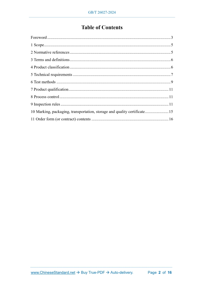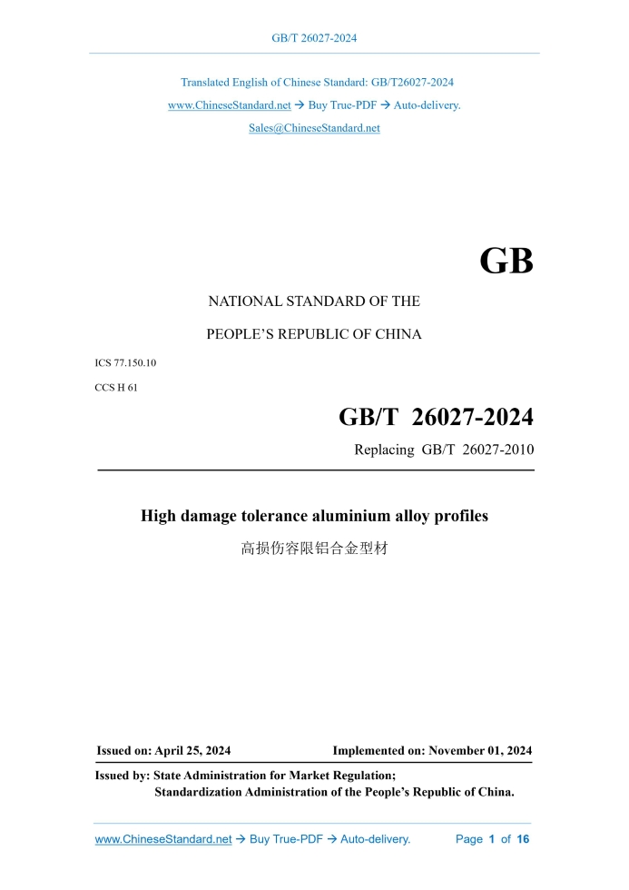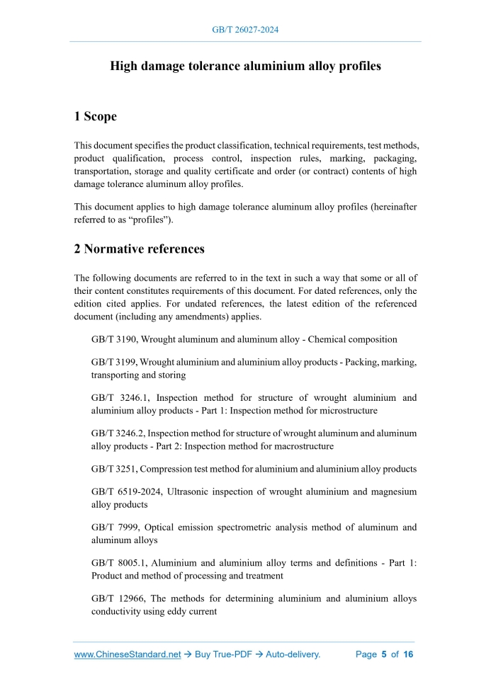 Similar standardsGB/T 26027-2024: High damage tolerance aluminium alloy profiles---This is an excerpt. Full copy of true-PDF in English version (including equations, symbols, images, flow-chart, tables, and figures etc.), auto-downloaded/delivered in 9 seconds, can be purchased online: https://www.ChineseStandard.net/PDF.aspx/GBT26027-2024GB NATIONAL STANDARD OF THE PEOPLE’S REPUBLIC OF CHINA ICS 77.150.10 CCS H 61 Replacing GB/T 26027-2010 High damage tolerance aluminium alloy profiles Issued on: APRIL 25, 2024 Implemented on: NOVEMBER 01, 2024 Issued by. State Administration for Market Regulation; Standardization Administration of the People’s Republic of China. Table of ContentsForeword... 3 1 Scope... 5 2 Normative references... 5 3 Terms and definitions... 6 4 Product classification... 6 5 Technical requirements... 7 6 Test methods... 9 7 Product qualification... 11 8 Process control... 11 9 Inspection rules... 11 10 Marking, packaging, transportation, storage and quality certificate... 15 11 Order form (or contract) contents... 16 High damage tolerance aluminium alloy profiles1 ScopeThis document specifies the product classification, technical requirements, test methods, product qualification, process control, inspection rules, marking, packaging, transportation, storage and quality certificate and order (or contract) contents of high damage tolerance aluminum alloy profiles. This document applies to high damage tolerance aluminum alloy profiles (hereinafter referred to as “profiles”).2 Normative referencesThe following documents are referred to in the text in such a way that some or all of their content constitutes requirements of this document. For dated references, only the edition cited applies. For undated references, the latest edition of the referenced document (including any amendments) applies. GB/T 3190, Wrought aluminum and aluminum alloy - Chemical composition GB/T 3199, Wrought aluminium and aluminium alloy products - Packing, marking, transporting and storing GB/T 3246.1, Inspection method for structure of wrought aluminium and aluminium alloy products - Part 1.Inspection method for microstructure GB/T 3246.2, Inspection method for structure of wrought aluminum and aluminum alloy products - Part 2.Inspection method for macrostructure GB/T 3251, Compression test method for aluminium and aluminium alloy products GB/T 6519-2024, Ultrasonic inspection of wrought aluminium and magnesium alloy products GB/T 7999, Optical emission spectrometric analysis method of aluminum and aluminum alloys GB/T 8005.1, Aluminium and aluminium alloy terms and definitions - Part 1. Product and method of processing and treatment GB/T 12966, The methods for determining aluminium and aluminium alloys conductivity using eddy current 5.7 Ultrasonic flaw detection acceptance grade The ultrasonic flaw detection results of profiles shall comply with Grade A in GB/T 6519-2024. 5.8 Macro-structure Cracks, stratification, shrinkage tails, pores, bright grains, metal inclusions, and non- metallic inclusions are not allowed to exist on the macro-structure samples of the profiles. The depth of the coarse grain ring at the corners of the profiles is allowed to exceed 3 mm, but not allowed to exceed 5 mm. The depth of the coarse grain ring in other parts shall not be greater than 3 mm. When the buyer has requirements for grain size, it shall be determined by negotiation between the supplier and the buyer, and indicated in the order (or contract). 5.9 Microstructure Over-burning is not allowed in the profile microstructure. 5.10 Appearance quality 5.10.1 Metal indentation, non-metal indentation, cracks, bubbles, or surface corrosion are not allowed on the profile surface; however, water marks are permitted. 5.10.2 Mold marks, pits, bumps, scratches, dents, straightening marks, and abrasions that do not exceed half of the negative deviation value are allowed on the profile surface. The supplier is allowed to grind it longitudinally to a smooth surface. After grinding, the wall thickness deviation of the profile shall not exceed its allowable deviation range.6 Test methods6.1 Chemical composition The chemical composition analysis of the profiles shall be carried out according to the methods specified in GB/T 20975 (all parts) or GB/T 7999.The arbitration shall be carried out according to the methods specified in GB/T 20975 (all parts). 6.2 Dimension deviation The dimension deviation of the profile shall be tested in accordance with the method specified in GB/T 14846-2014. 6.3 Room temperature tensile mechanical properties The room temperature tensile mechanical properties of the profiles shall be tested according to the method specified in GB/T 16865.When the buyer has special requirements for sample selection, the supplier and the buyer can refer to GB/T 16865 for negotiation and determination, and indicate it in the order (or contract). 6.4 Compression properties The compression properties of the profile shall be tested according to the method specified in GB/T 3251. 6.5 Conductivity 6.5.1 Conductivity of test pieces The conductivity of test pieces of the profiles shall be tested according to the method specified in GB/T 12966.When using tensile test pieces, if the profile size and surface cannot meet the test requirements, the supplier and the buyer may refer to GB/T 12966 to agree on the test method and indicate it in the order (or contract). 6.5.2 Conductivity uniformity The conductivity uniformity test of the profile shall be carried out on the profile surface according to the method specified in GB/T 12966. 6.6 Exfoliation corrosion resistance The exfoliation corrosion resistance of the profile shall be tested according to the method specified in GB/T 22639-2022. 6.7 Ultrasonic flaw detection acceptance grade The ultrasonic flaw detection acceptance grade of the profiles shall be evaluated in accordance with the provisions of GB/T 6519-2024.The ultrasonic inspection method shall be determined by