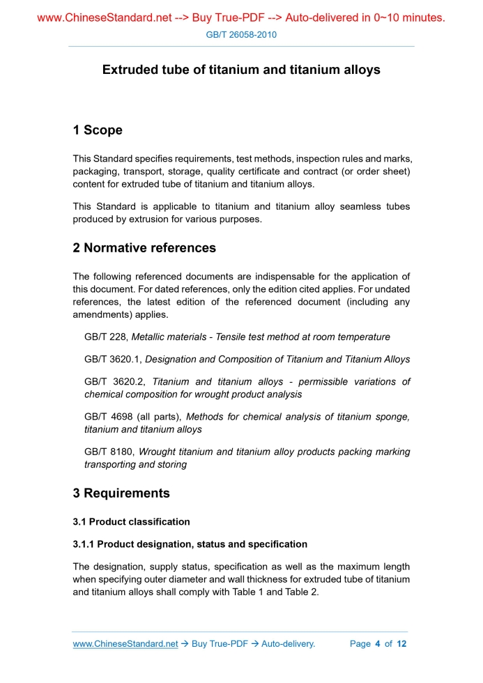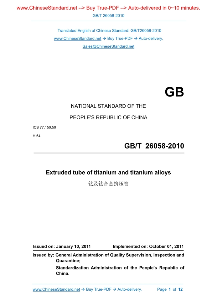 GB/T 26058-2010: Extruded tube of titanium and titanium alloys Delivery: 9 seconds. True-PDF full-copy in English & invoice will be downloaded + auto-delivered via email. See step-by-step procedure Status: Valid