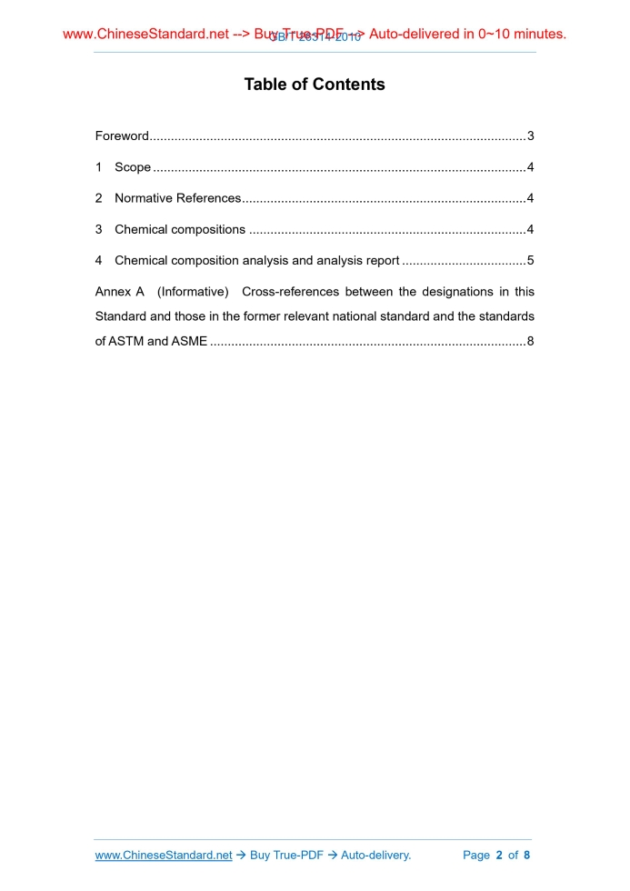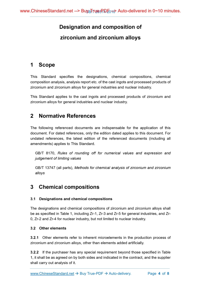 Similar standardsGB/T 26314-2010: Designation and composition of zirconium and zirconium alloys---This is an excerpt. Full copy of true-PDF in English version (including equations, symbols, images, flow-chart, tables, and figures etc.), auto-downloaded/delivered in 9 seconds, can be purchased online: https://www.ChineseStandard.net/PDF.aspx/GBT26314-2010GB NATIONAL STANDARD OF THE PEOPLE’S REPUBLIC OF CHINA ICS 77.120 H 63 Designation and composition of zirconium and zirconium alloys Issued on: JANUARY 14, 2011 Implemented on: NOVEMBER 1, 2011 Issued by. General Administration of Quality Supervision, Inspection and Quarantine of the People's Republic of China; Standardization Administration of the People's Republic of China. Table of ContentsForeword ... 3 1 Scope ... 4 2 Normative References ... 4 3 Chemical compositions ... 4 4 Chemical composition analysis and analysis report ... 5 Annex A (Informative) Cross-references between the designations in this Standard and those in the former relevant national standard and the standards of ASTM and ASME ... 8 Designation and composition of zirconium and zirconium alloys1 ScopeThis Standard specifies the designations, chemical compositions, chemical composition analysis, analysis report etc. of the cast ingots and processed products of zirconium and zirconium alloys for general industries and nuclear industry. This Standard applies to the cast ingots and processed products of zirconium and zirconium alloys for general industries and nuclear industry.2 Normative ReferencesThe following referenced documents are indispensable for the application of this document. For dated references, only the edition dated applies to this document. For undated references, the latest edition of the referenced documents (including all amendments) applies to This Standard. GB/T 8170, Rules of rounding off for numerical values and expression and judgement of limiting values GB/T 13747 (all parts), Methods for chemical analysis of zirconium and zirconium alloys3 Chemical compositions3.1 Designations and chemical compositions The designations and chemical compositions of zirconium and zirconium alloys shall be as specified in Table 1, including Zr-1, Zr-3 and Zr-5 for general industries, and Zr- 0, Zr-2 and Zr-4 for nuclear industry, but not limited to nuclear industry. 3.2 Other elements 3.2.1 Other elements refer to inherent microelements in the production process of zirconium and zirconium alloys, other than elements added artificially. 3.2.2 If the purchaser has any special requirement beyond those specified in Table 1, it shall be as agreed on by both sides and indicated in the contract, and the supplier shall carry out analysis of it. 3.2.3 Composition allowable deviations When the purchaser takes samples from products for chemical composition retest, their composition allowable deviations shall be as specified in Table 2.4 Chemical composition analysis and analysis report4.1 The method for the arbitration analysis of element Nb in the chemical composition of zirconium and zirconium alloy products is as approved by both sides; and the analysis of other elements is as specified in GB/T 13747. 4.2 Unless specified otherwise in product standard, the supplier can take samples from cast ingots to carry out chemical composition analysis. 4.3 The second analysis is allowed for the chemical composition of zirconium and zirconium alloy products; and the result of the second analysis is deemed as the basis of final judgement. 4.4 The significant digits of the numerical results in the chemical composition analysis report shall be consistent with the significant digits of the corresponding boundary values in the chemical composition table. The digits behind the significant digits shall be rounded off as specified in GB/T 8170. ......Source: Above contents are excerpted from the full-copy PDF -- translated/reviewed by: www.ChineseStandard.net / Wayne Zheng et al. Tips & Frequently Asked Questions:Question 1: How long will the true-PDF of English version of GB/T 26314-2010 be delivered?Answer: The full copy PDF of English version of GB/T 26314-2010 can be downloaded in 9 seconds, and it will also be emailed to you in 9 seconds (double mechanisms to ensure the delivery reliably), with PDF-invoice.Question 2: Can I share the purchased PDF of GB/T 26314-2010_English with my colleagues?Answer: Yes. The purchased PDF of GB/T 26314-2010_English will be deemed to be sold to your employer/organization who actually paid for it, including your colleagues and your employer's intranet.Question 3: Does the price include tax/VAT?Answer: Yes. Our tax invoice, downloaded/delivered in 9 seconds, includes all tax/VAT and complies with 100+ countries' tax regulations (tax exempted in 100+ countries) -- See Avoidance of Double Taxation Agreements (DTAs): List of DTAs signed between Singapore and 100+ countriesQuestion 4: Do you accept my currency other than USD?Answer: Yes. www.ChineseStandard.us -- GB/T 26314-2010 -- Click this link and select your country/currency to pay, the exact amount in your currency will be printed on the invoice. Full PDF will also be downloaded/emailed in 9 seconds.How to buy and download a true PDF of English version of GB/T 26314-2010?A step-by-step guide to download PDF of GB/T 26314-2010_EnglishStep 1: Visit website https://www.ChineseStandard.net (Pay in USD), or https://www.ChineseStandard.us (Pay in any currencies such as Euro, KRW, JPY, AUD).Step 2: Search keyword "GB/T 26314-2010". Step 3: Click "Add to Cart". If multiple PDFs are required, repeat steps 2 and 3 to add up to 12 PDFs to cart. Step 4: Select payment option (Via payment agents Stripe or PayPal). Step 5: Customize Tax Invoice -- Fill up your email etc. Step 6: Click "Checkout". Step 7: Make payment by credit card, PayPal, Google Pay etc. After the payment is completed and in 9 seconds, you will receive 2 emails attached with the purchased PDFs and PDF-invoice, respectively. Step 8: Optional -- Go
